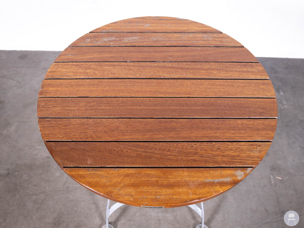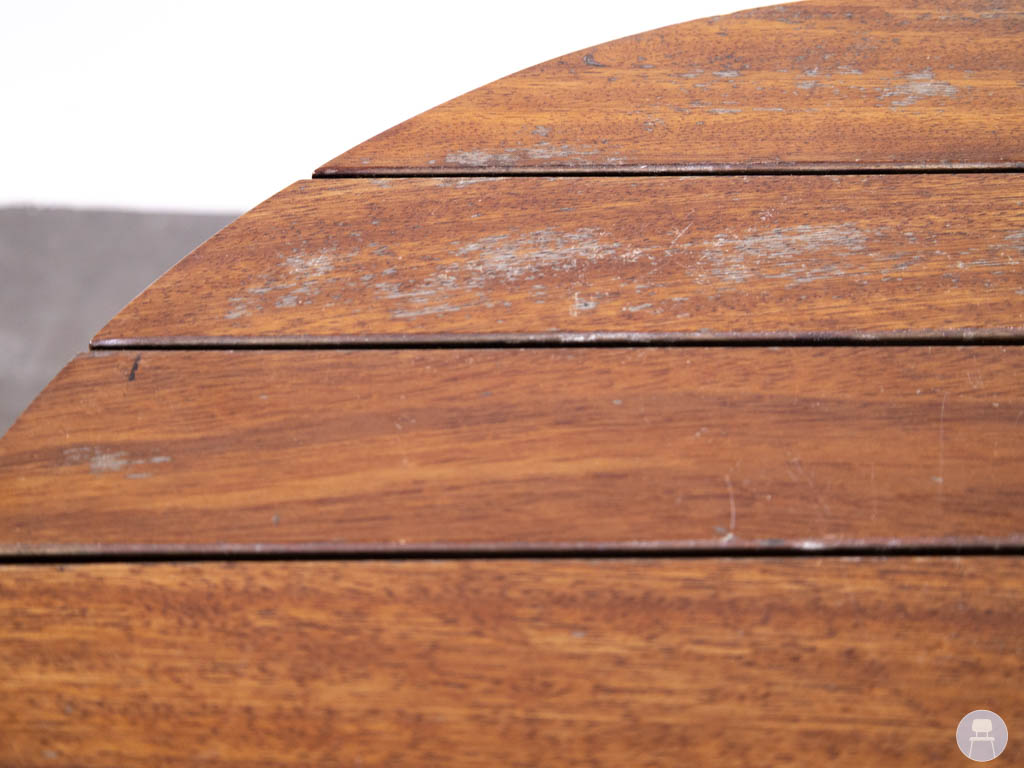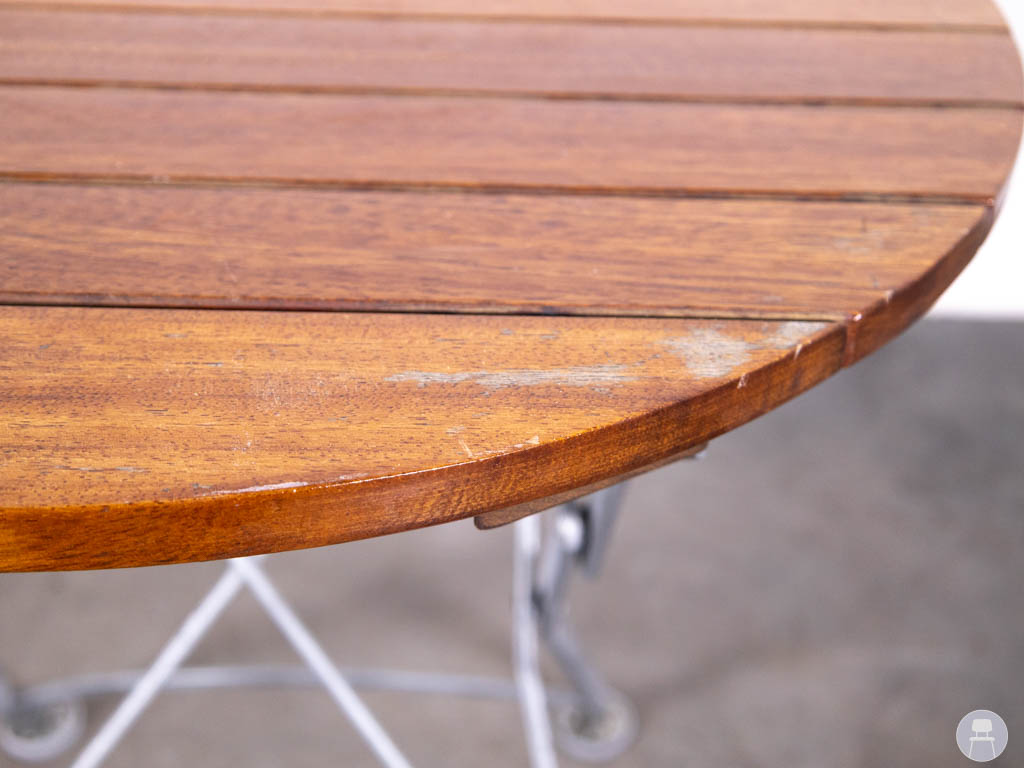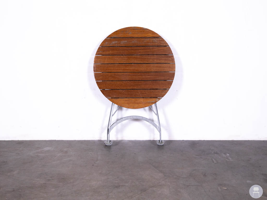 Het ronde teak houten blad heeft een warme natuurlijke uitstraling en bestaat uit meerdere latten, wat zorgt voor een klassieke terraslook. Teakhout staat bekend om zijn sterkte en weersbestendigheid, waardoor het zeer geschikt is voor buitengebruik.