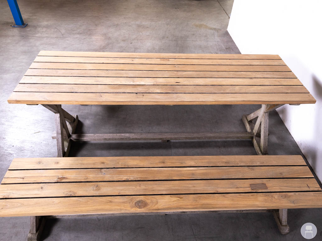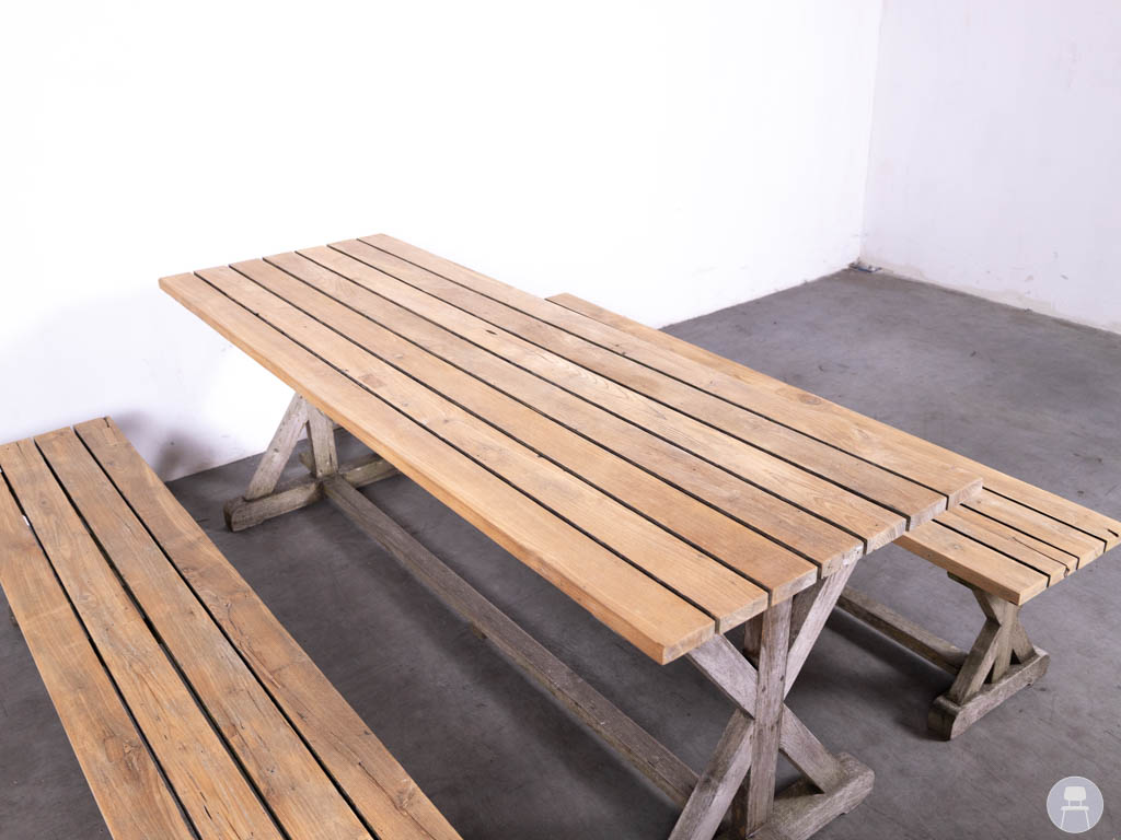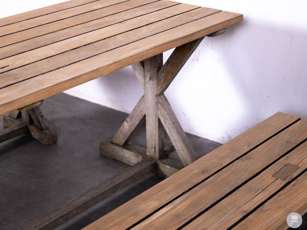 De kruispoten zorgen voor extra stabiliteit en een rustieke look. Door de natuurlijke vergrijzing van het hout krijgt de set een karakteristieke, doorleefde uitstraling die moeiteloos past in elke buitenomgeving. Een duurzame keuze voor wie zoekt naar een praktische en gezellige picknickset voor terras of tuin.