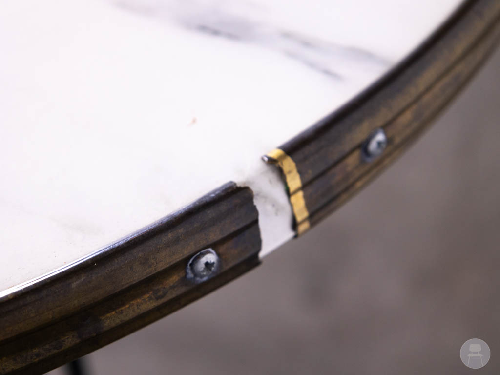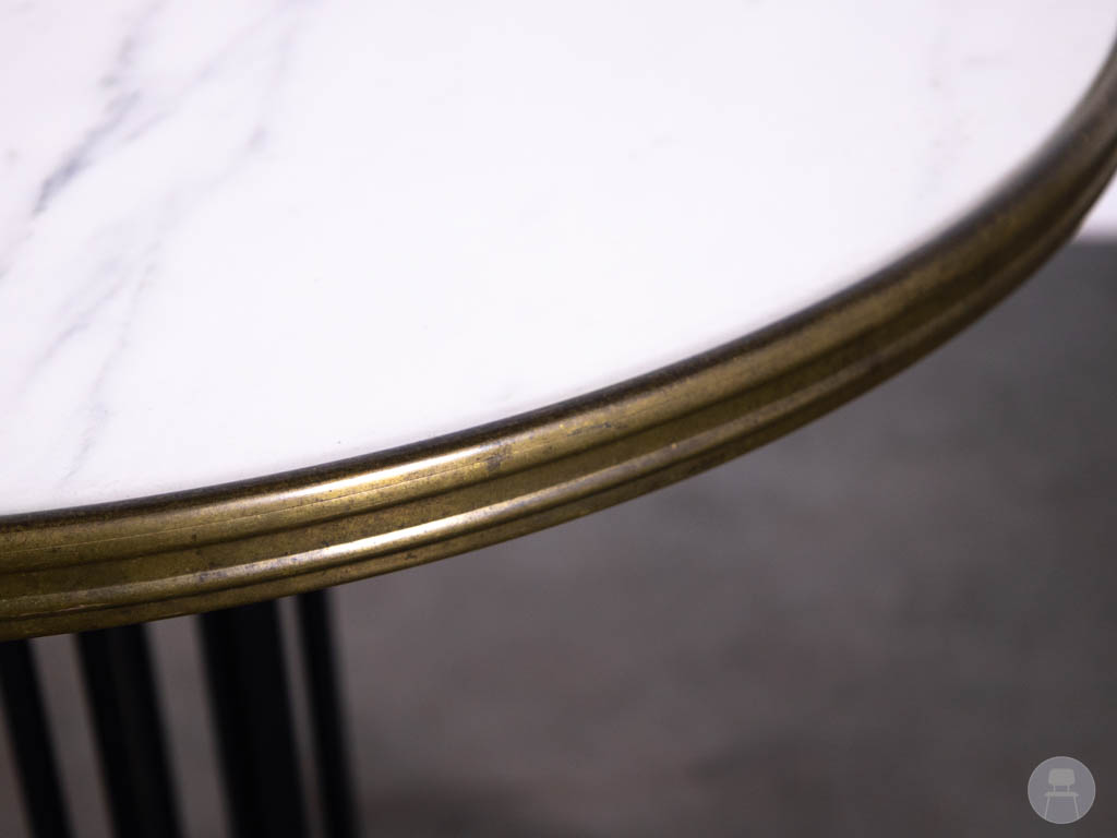 Deze ronde horecatafel heeft een blad van circa 70 cm met een marmerlook afwerking, wat zorgt voor een chique en tijdloze uitstraling. De goudkleurige rand geeft de tafel een extra luxe detail en maakt hem perfect passend in zowel moderne als klassieke horeca-interieurs.