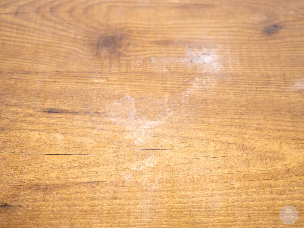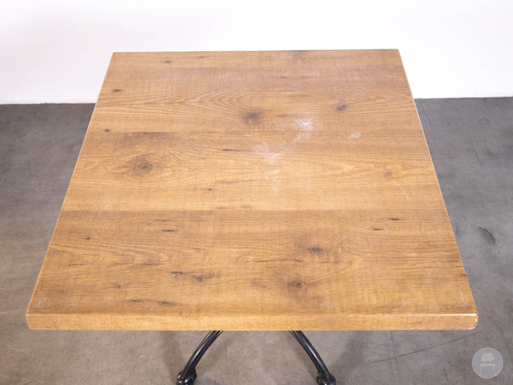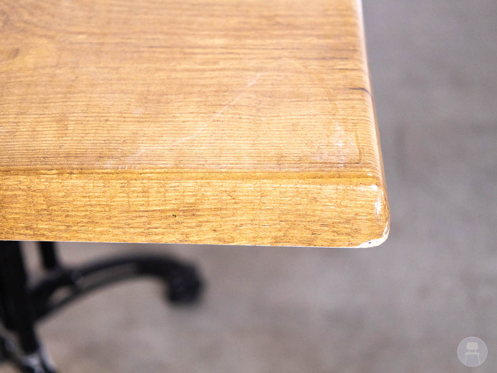 Let op: het blad en onderstel hebben zichtbare beschadigingen, passend bij gebruikt horecameubilair.