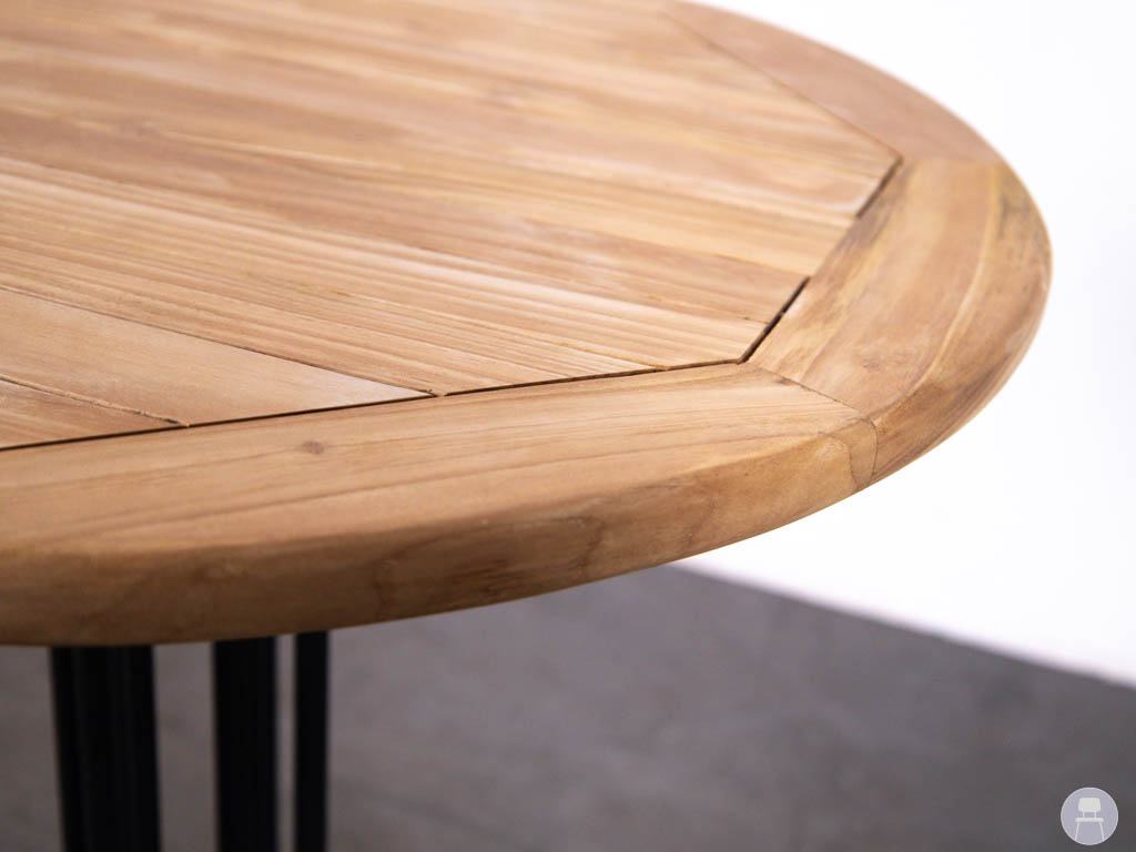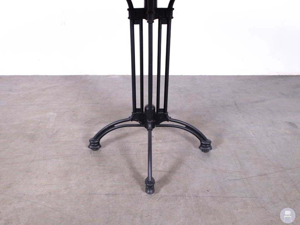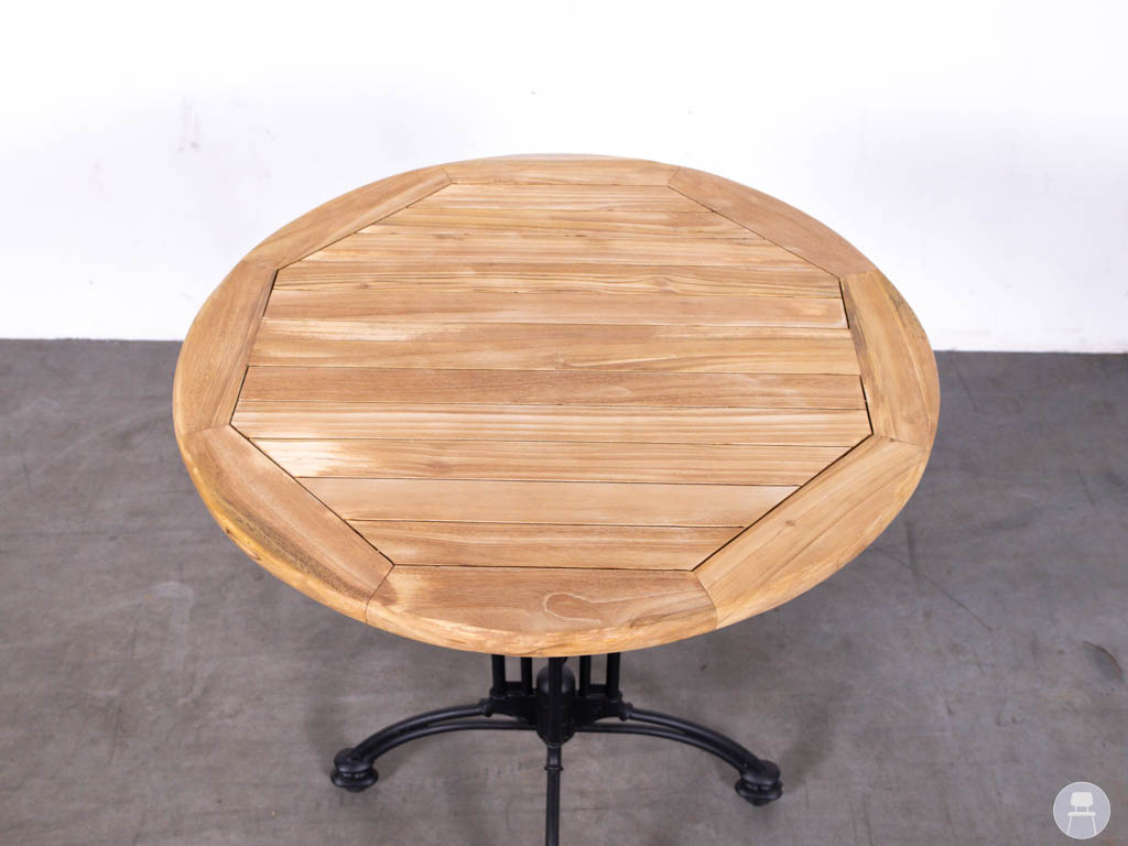 De tafel heeft een rond blad van 70 cm en is uitgevoerd in teakhout, wat zorgt voor een warme en natuurlijke uitstraling. Teak staat bekend om zijn duurzaamheid en is zeer geschikt voor intensief horecagebruik, zowel binnen als buiten. Het onderstel is het klassieke Bologna model van zwart gietijzer, wat niet alleen een elegante uitstraling geeft, maar ook zorgt voor extra stabiliteit.