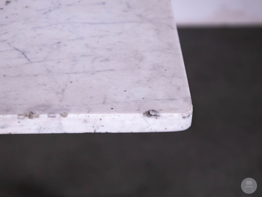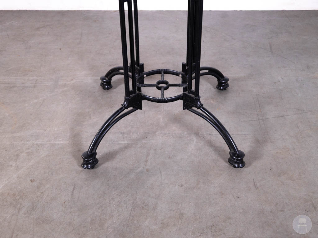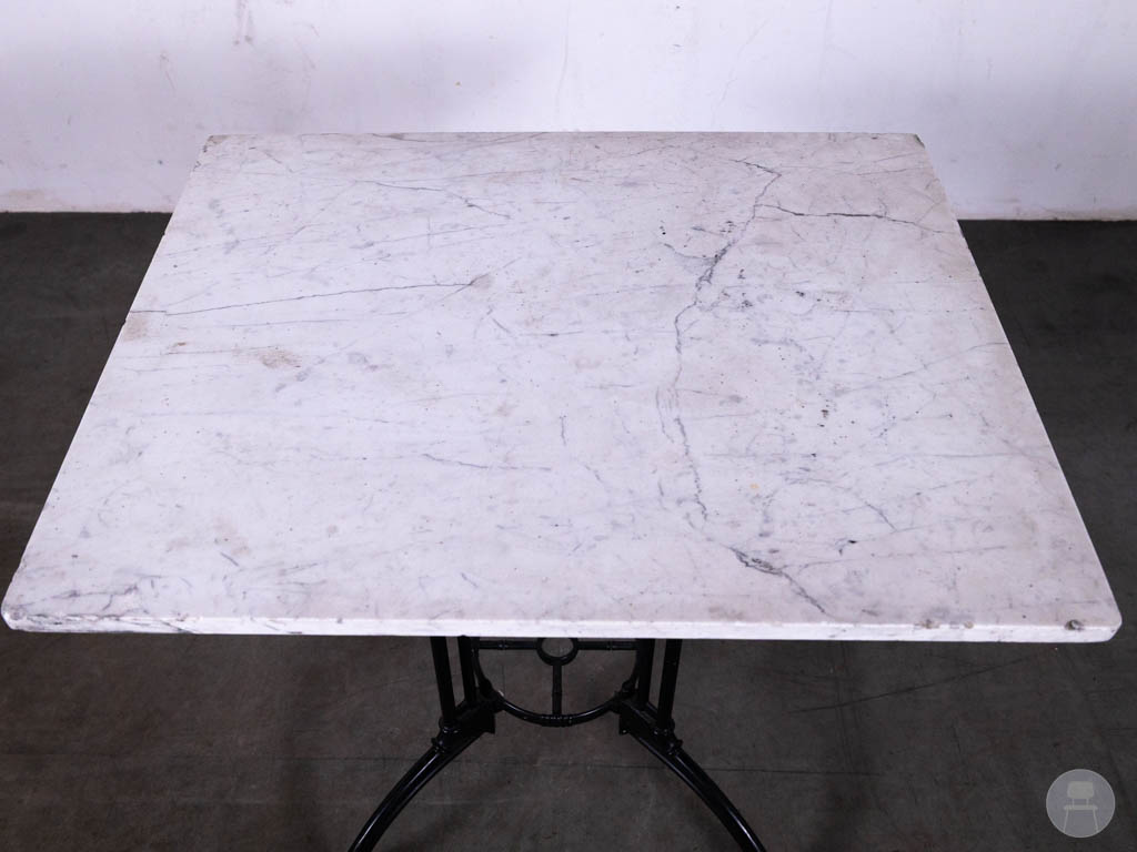 Het tafelblad is uitgevoerd in echt marmer in een wit/grijze tint, wat zorgt voor een stijlvolle en tijdloze look. Het onderstel betreft het Bologna Grande model, gemaakt van zwart gietijzer, met een sierlijk en robuust design dat zorgt voor optimale stabiliteit.