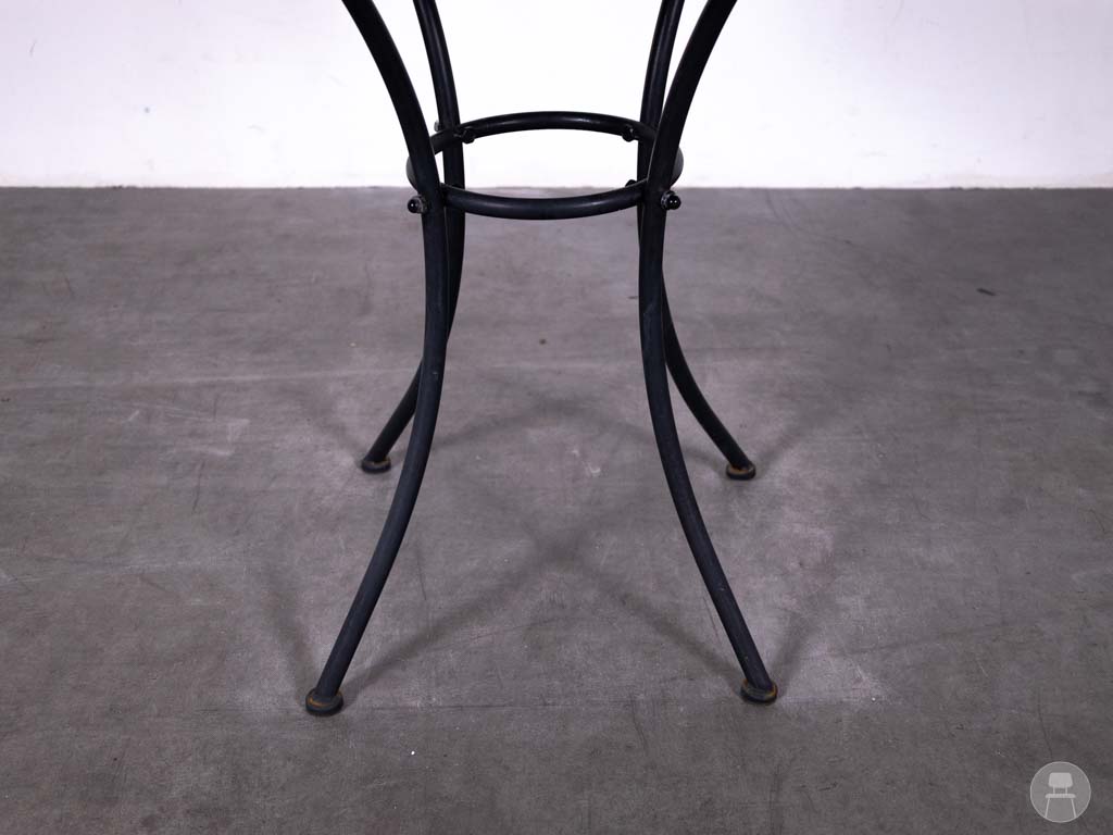 Het stevige smeedijzeren onderstel biedt stabiliteit en een elegante basis, waardoor de tafel niet alleen decoratief maar ook praktisch is in dagelijks gebruik. Geschikt voor één tot drie zitplaatsen – ideaal voor cafés, patio’s of binnentuinen.