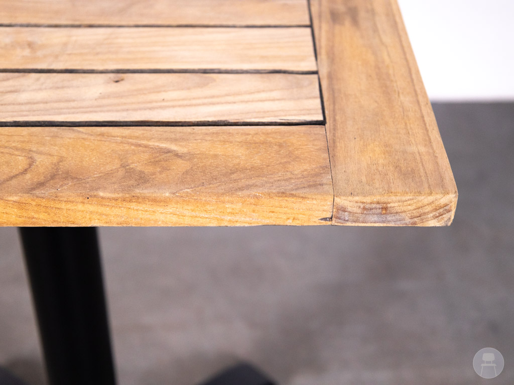 Het tafelblad van teak hout staat bekend om zijn sterke, weerbestendige eigenschappen en is daardoor perfect geschikt voor intensief gebruik op het terras. Het centrale onderstel van metaal zorgt voor extra stabiliteit en biedt tegelijkertijd voldoende beenruimte voor gasten, wat het zitcomfort verhoogt.