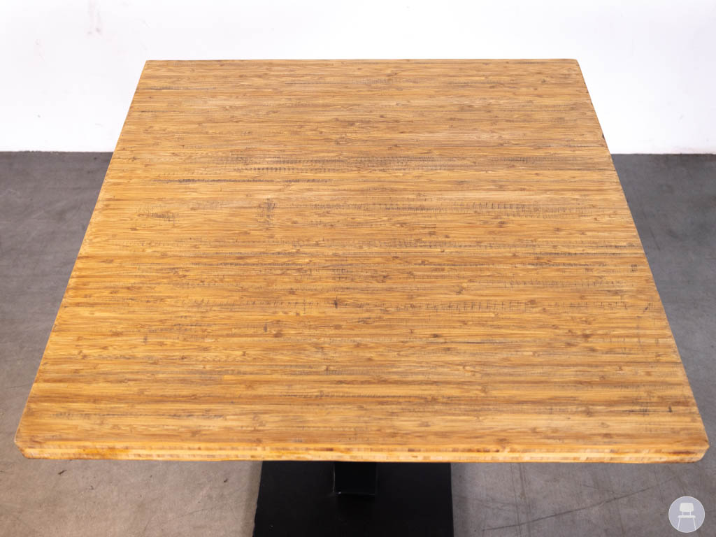 Deze horecatafel heeft een vierkant blad van bamboehout in een warme naturel kleur, wat zorgt voor een natuurlijke en uitnodigende uitstraling. Het stevige stalen onderstel in zwart geeft de tafel een strak en robuust karakter, ideaal voor intensief gebruik in de horeca.