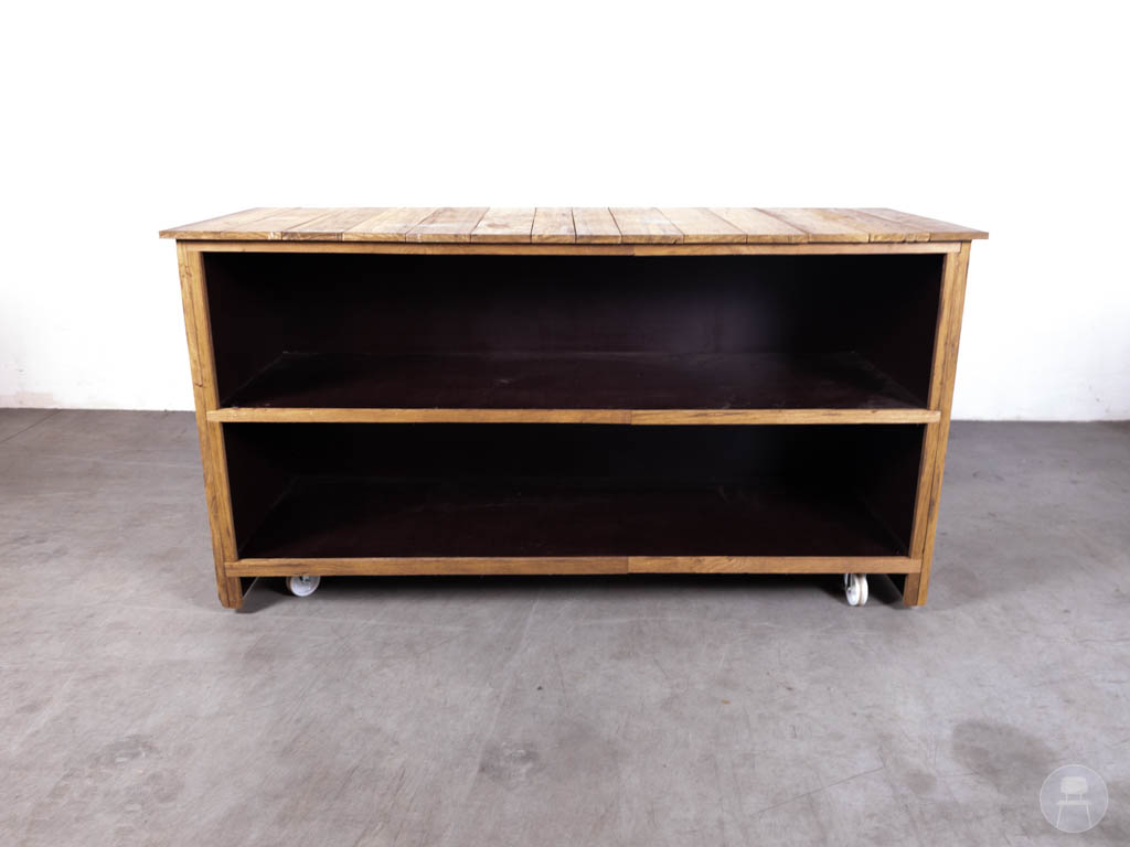 Dit debrasseerstation heeft een afmeting van 210×80 cm en biedt dankzij de twee grote open vakken volop opbergruimte voor servies, bestek en glaswerk. De buitenzijde is afgewerkt met houten panelen, terwijl de binnenzijde bestaat uit een stevige plaatconstructie. Het meubel is voorzien van zwenkwielen, waardoor het eenvoudig te verplaatsen is binnen de horecaomgeving.