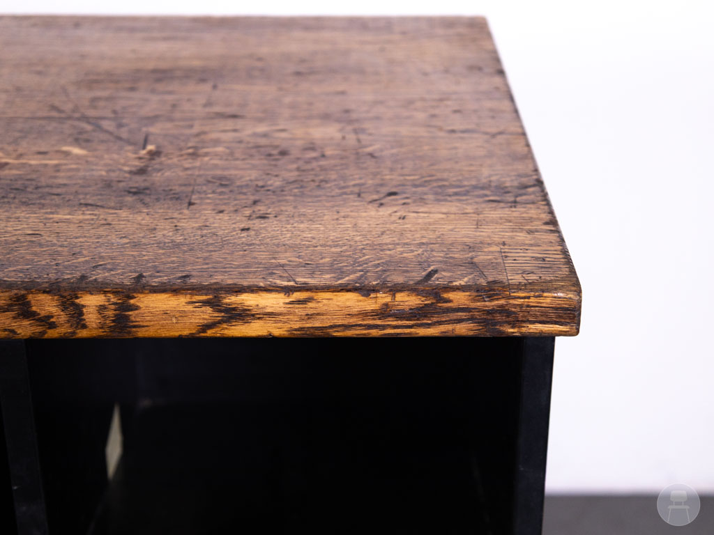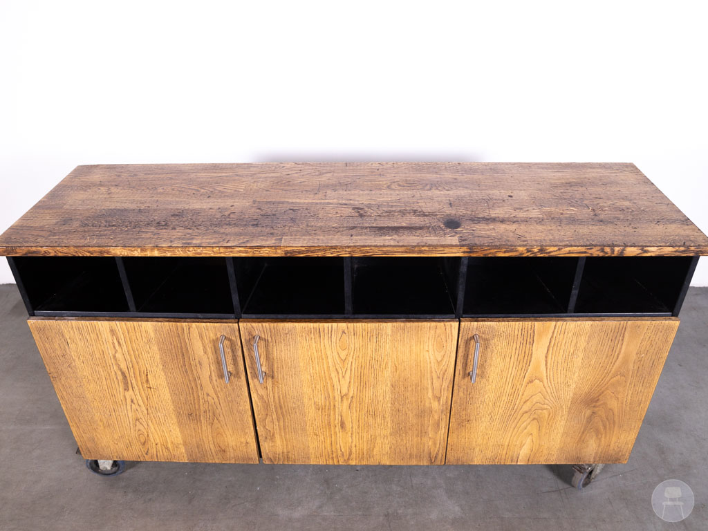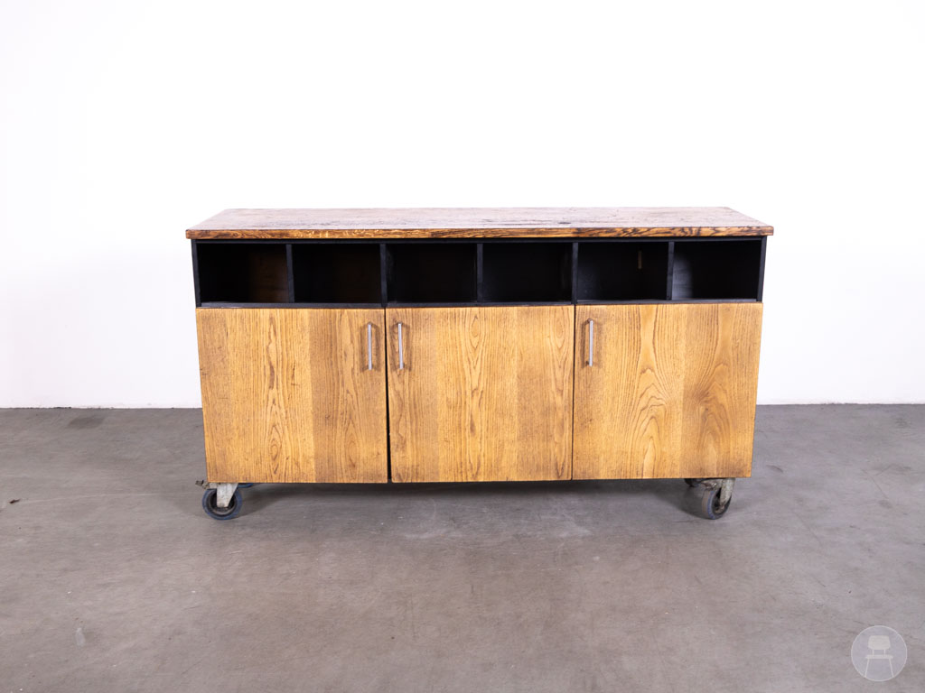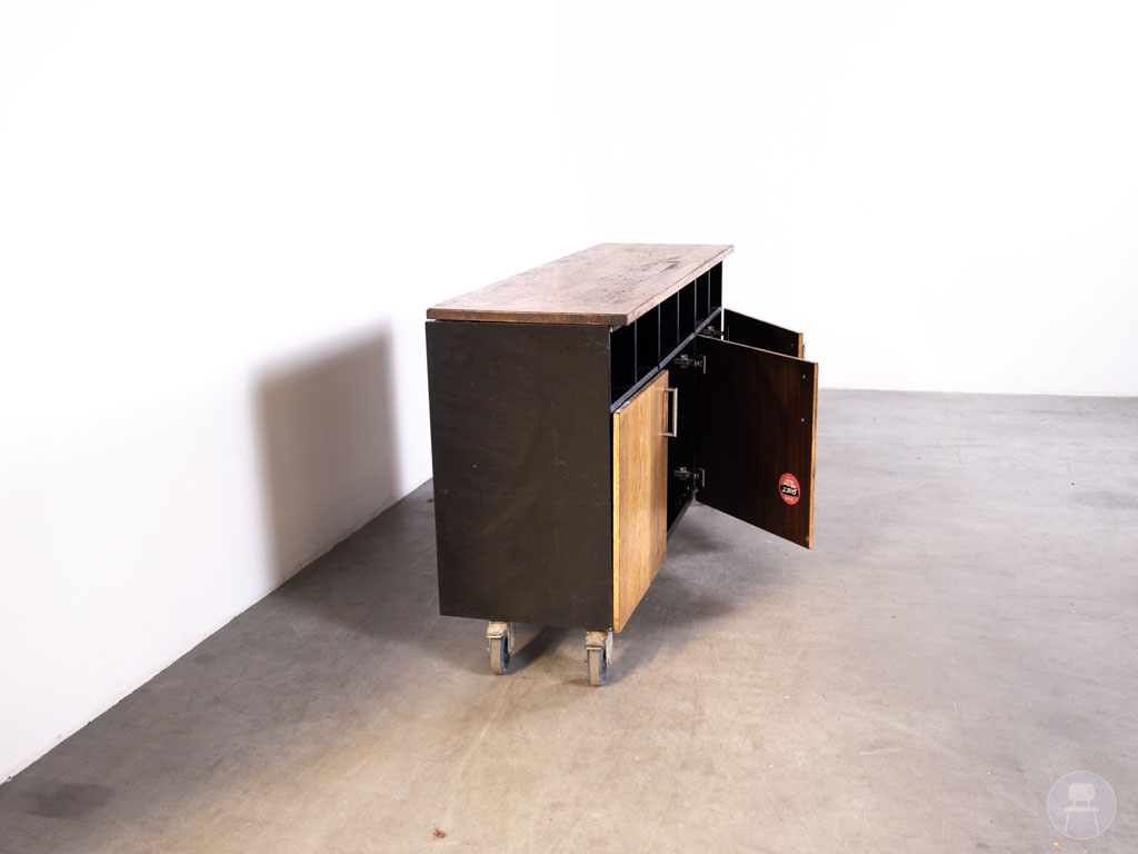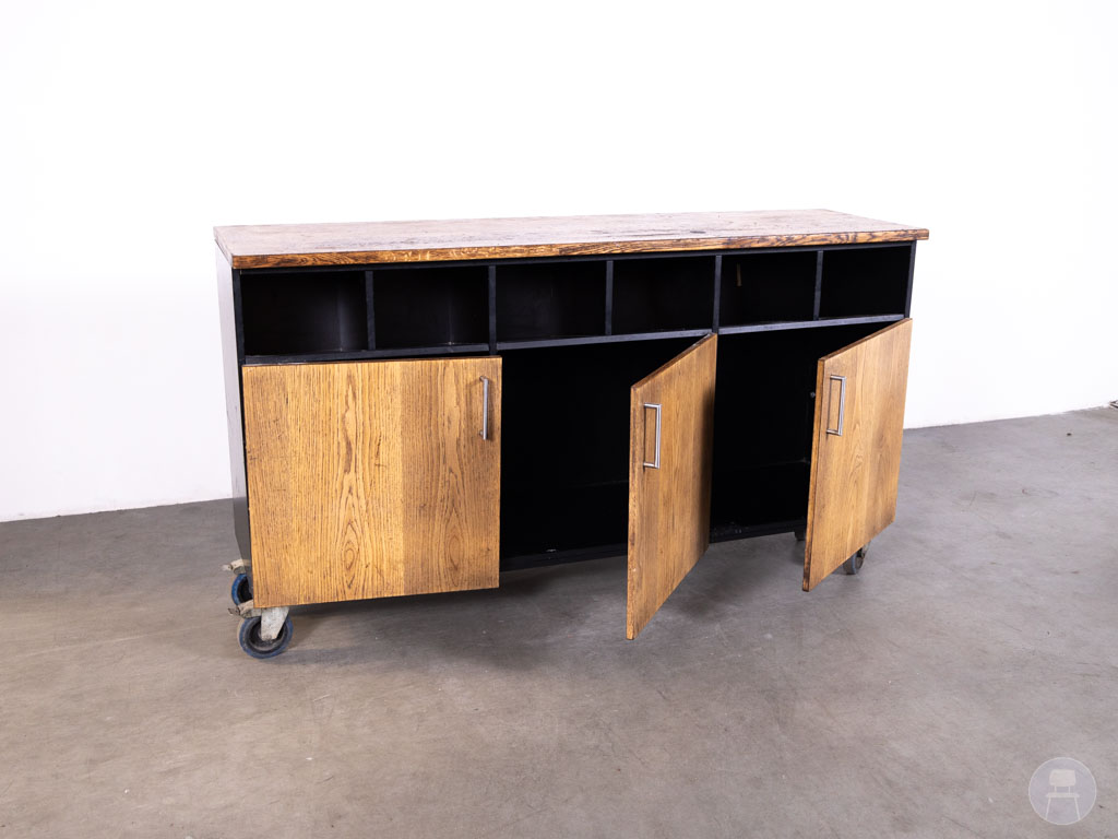 Dit meubel is uitgevoerd in eikenhout met een donkerbruine afwerking, gecombineerd met een zwart frame voor een stoere en professionele uitstraling. Met afmetingen van 170 x 50 cm biedt het voldoende werk- en opbergruimte. De open vakken aan de bovenzijde zijn perfect voor snelle toegang tot materialen, terwijl de kastdeuren extra opbergruimte bieden. Dankzij de wielen is het meubel eenvoudig verrijdbaar, wat zorgt voor flexibiliteit in de horecaruimte. De achterzijde is netjes afgewerkt en gelijk aan de zijkanten, waardoor het meubel vrij in de ruimte geplaatst kan worden.