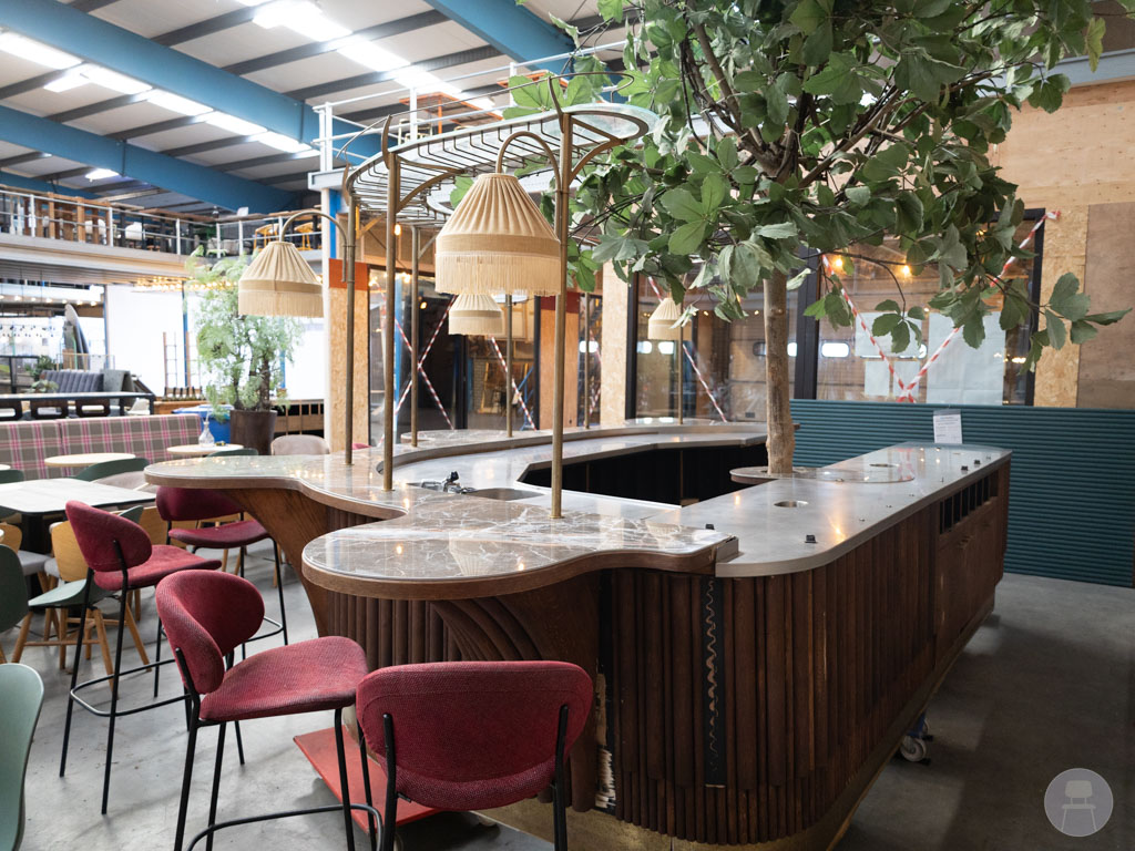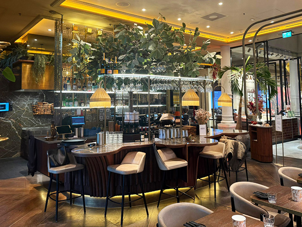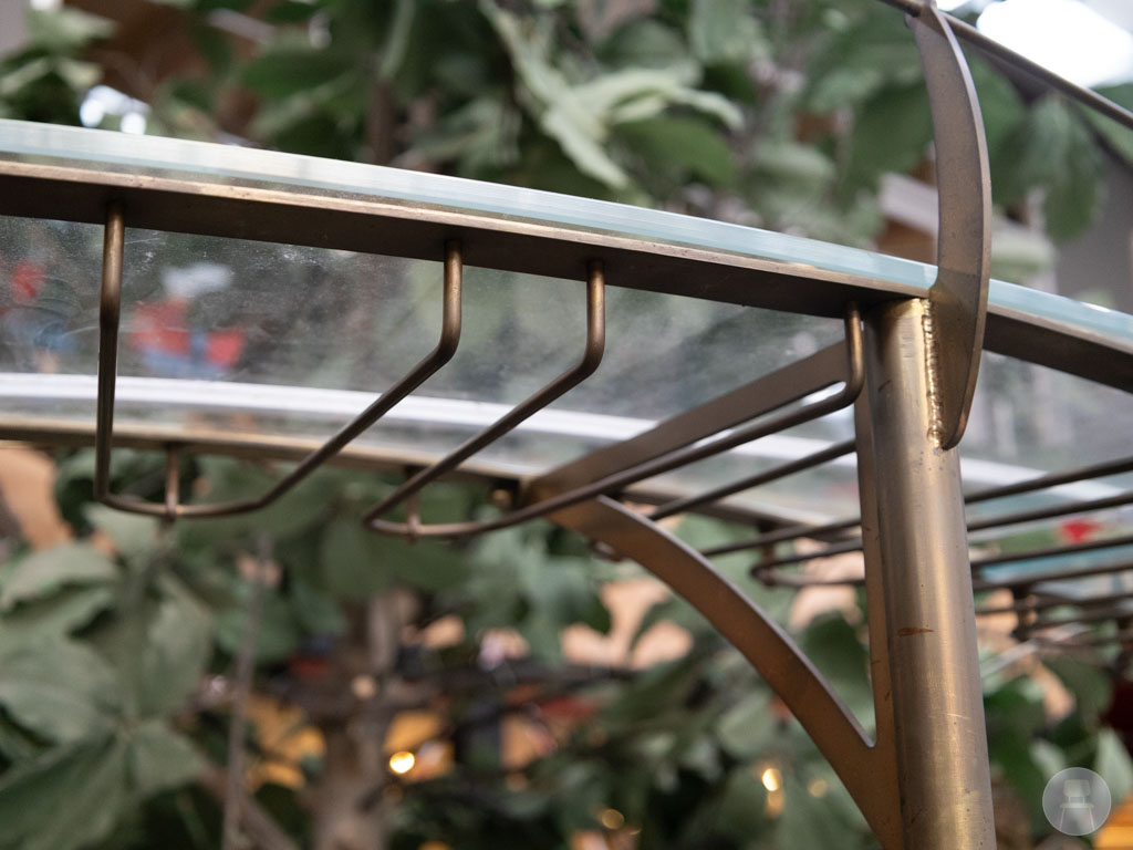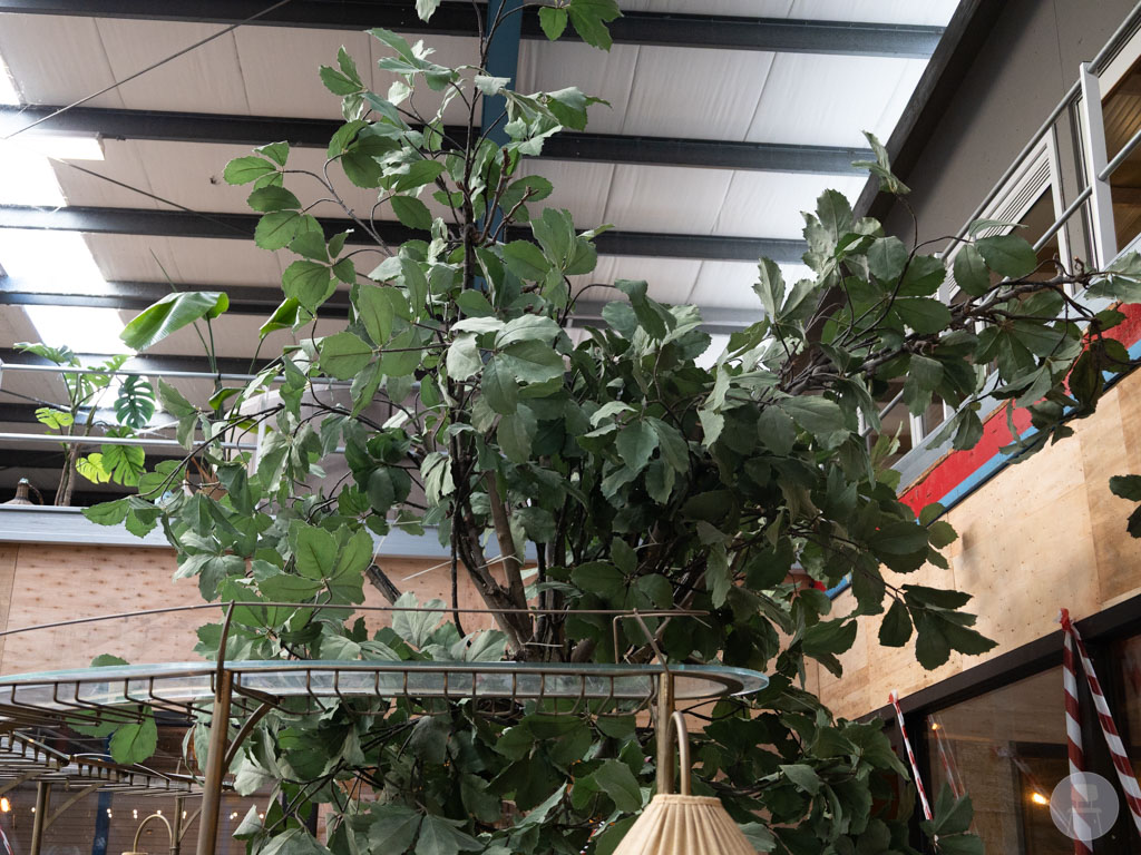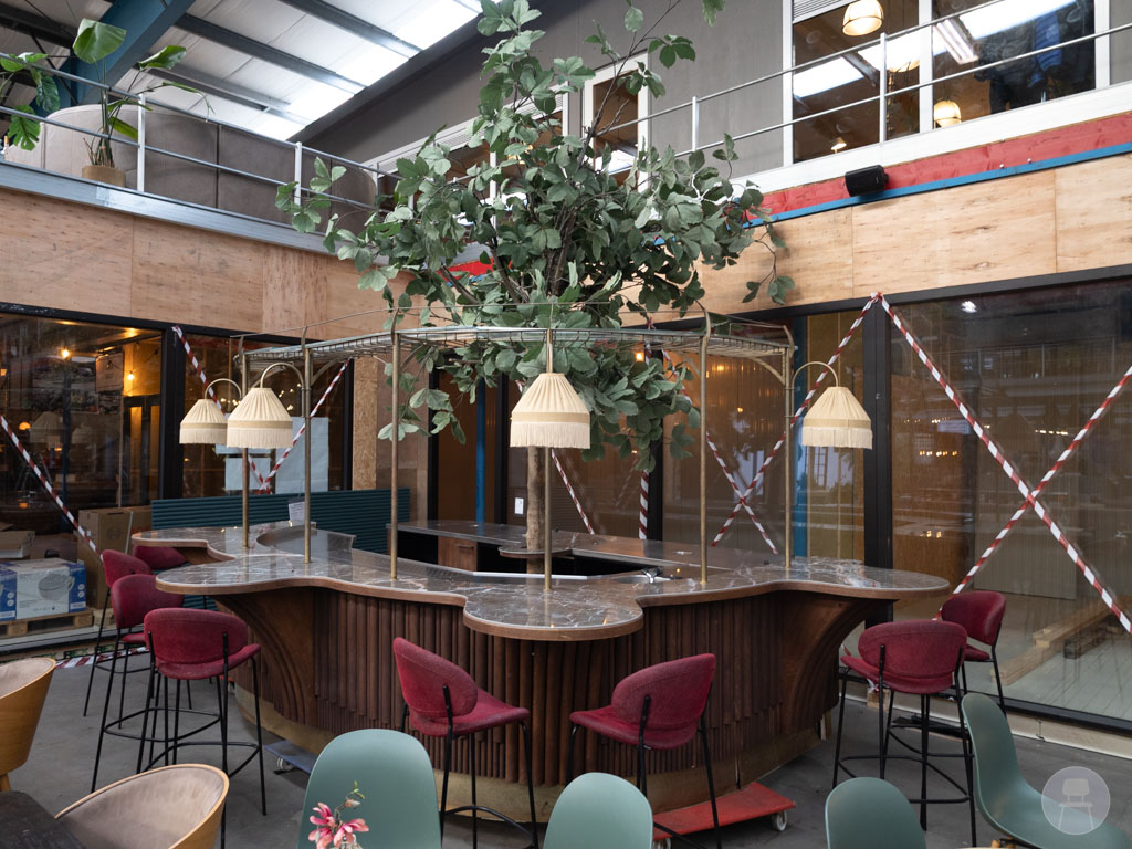 Het stijlvolle goudkleurige rek bovenop is voorzien van sfeervolle lampen, een glazen flessenrek én een wijnglazenhouder, wat zorgt voor een chique uitstraling. In het hart van de bar staat een prachtige kunstboom die de hele setting een botanische en warme uitstraling geeft. De bar heeft lichte gebruikssporen zoals op de foto’s te zien is. Een unieke bar die je horeca-interieur direct naar een hoger niveau tilt!
