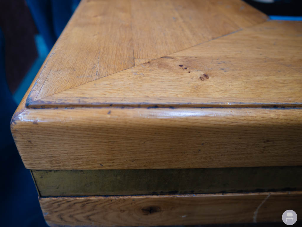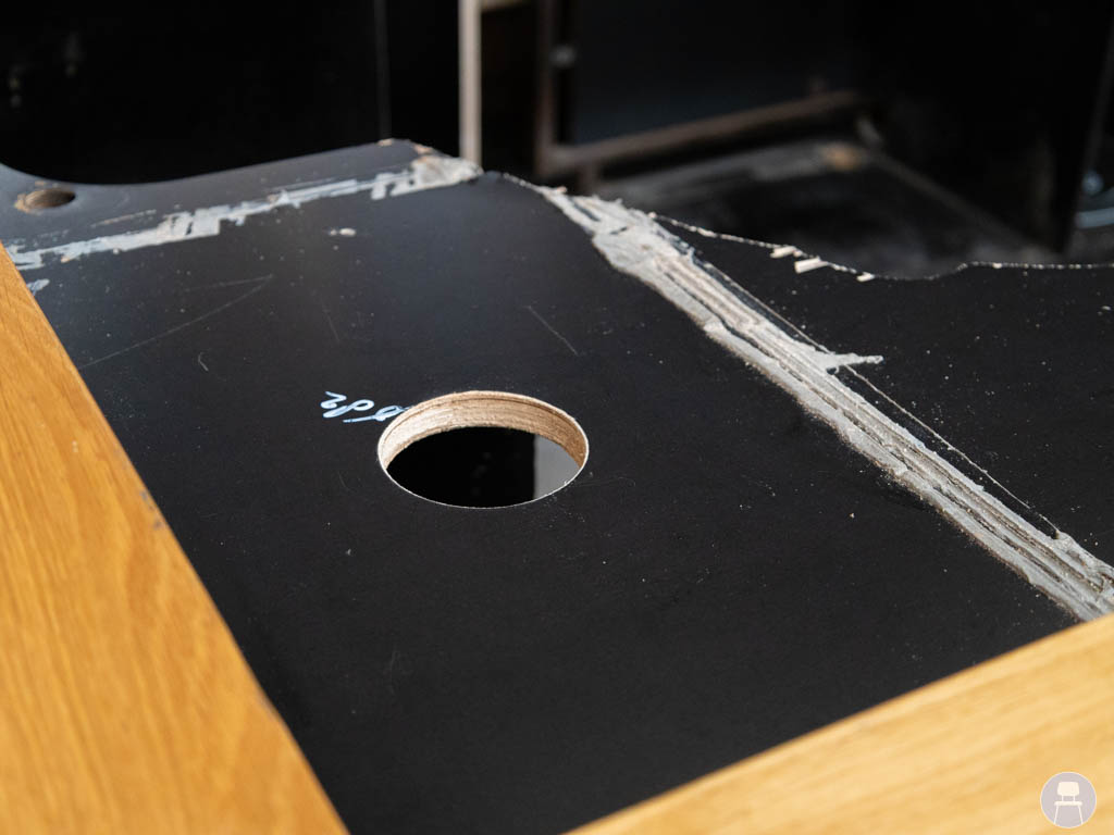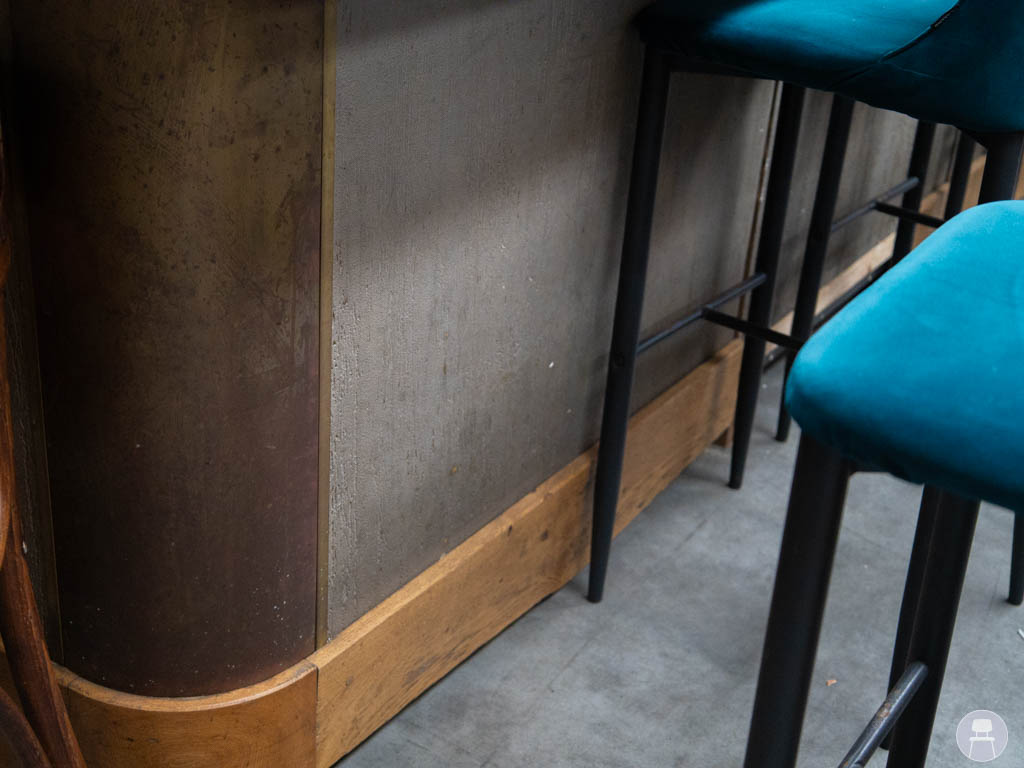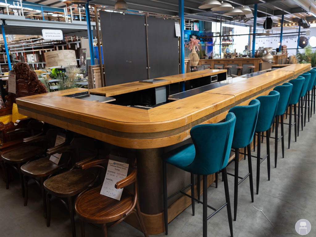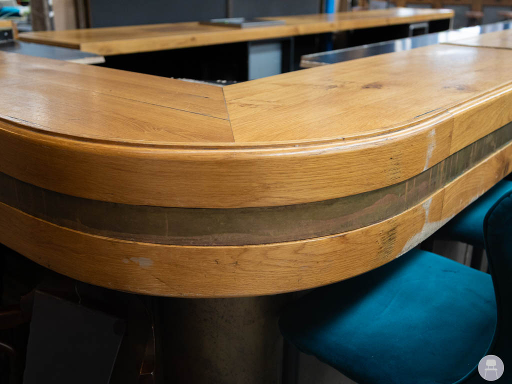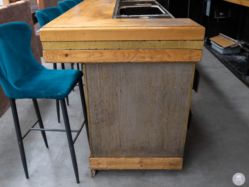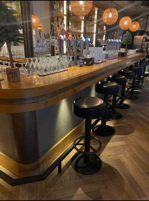 De bar is uitgevoerd met een robuust houten blad, waarbij de voorzijde is voorzien van een extra dik blad. Dit geeft niet alleen een luxe en krachtige uitstraling, maar zorgt ook voor extra duurzaamheid op de plekken waar gasten zitten. De combinatie van hout en donkere panelen geeft de bar een warme, industriële look die in veel interieurstijlen past.