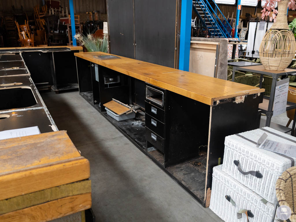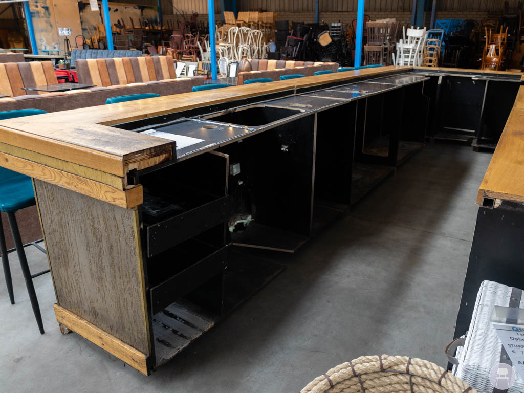 Aan de binnenzijde beschikt de bar over veel opbergruimte en werkruimte, waardoor er voldoende plek is voor apparatuur, glaswerk en servies. Dit maakt de bar zeer praktisch en efficiënt in gebruik tijdens drukke momenten. Daarnaast wordt de bar geleverd inclusief achterwand, wat zorgt voor een complete en professionele baropstelling. De bar heeft lichte gebruikssporen, passend bij horeca gebruik, maar is nog in goede staat en direct inzetbaar.