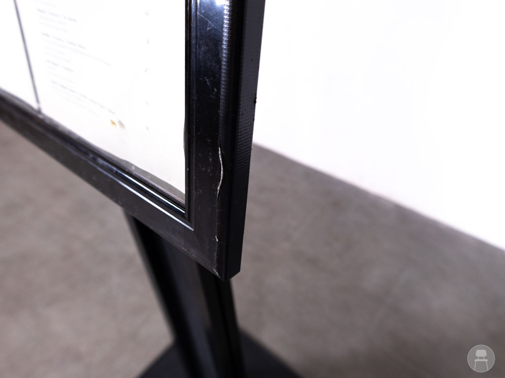 De standaard heeft enkele gebruikssporen, maar dat geeft ‘m juist die geleefde, karaktervolle look die zo goed past bij een sfeervol horecaconcept. Door de praktische kliklijst is je menukaart eenvoudig te wisselen en blijft hij goed beschermd achter glas. Een onmisbare accessoire die professionaliteit en gastvrijheid uitstraalt vanaf het allereerste moment.
