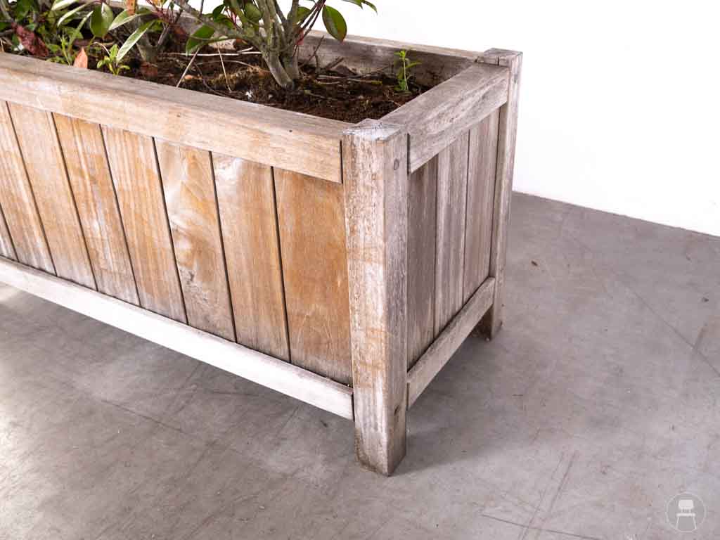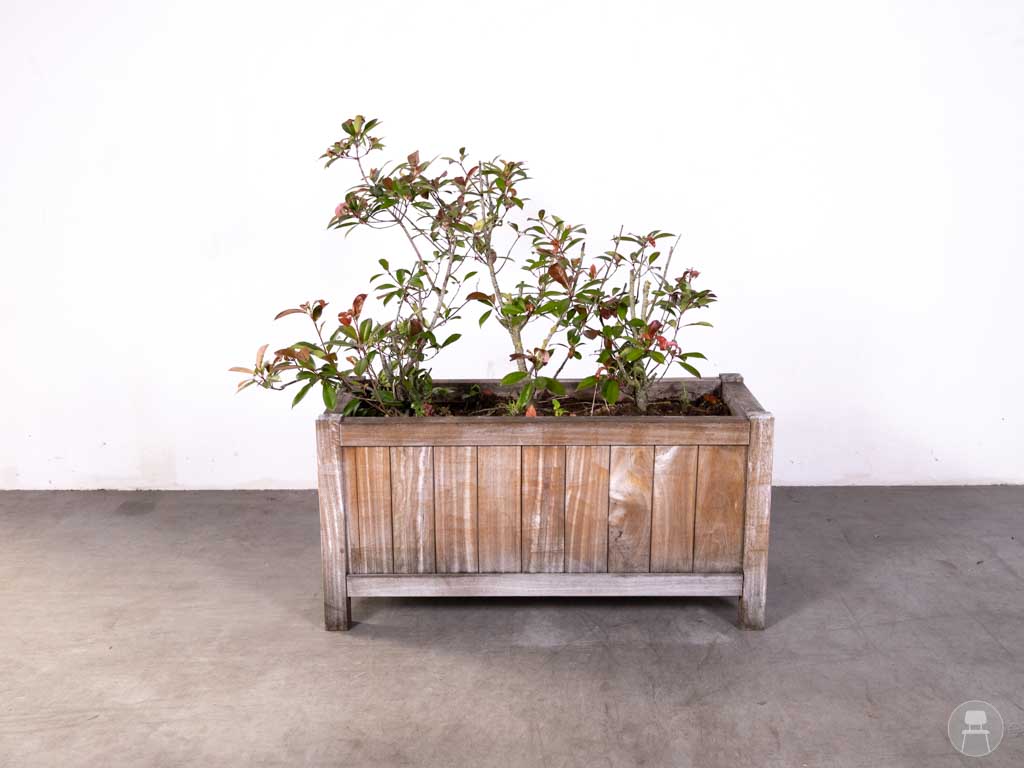 Plantenbak Teak Ronny 120x50cm is een robuuste houten plantenbak die ideaal is voor het aankleden van horecaterrassen, entrees of binnenplaatsen. Met een afmeting van 120×50 cm biedt deze plantenbak voldoende ruimte voor het aanplanten van struiken, bloemen of siergrassen en draagt hij bij aan een groene en sfeervolle uitstraling. Het verweerde hout geeft de bak een natuurlijke, landelijke look die perfect past bij diverse stijlen buiteninrichting. Deze tweedehands plantenbak is stevig, weerbestendig en direct inzetbaar voor zowel decoratief als functioneel gebruik, bijvoorbeeld als afbakening van zitgedeeltes