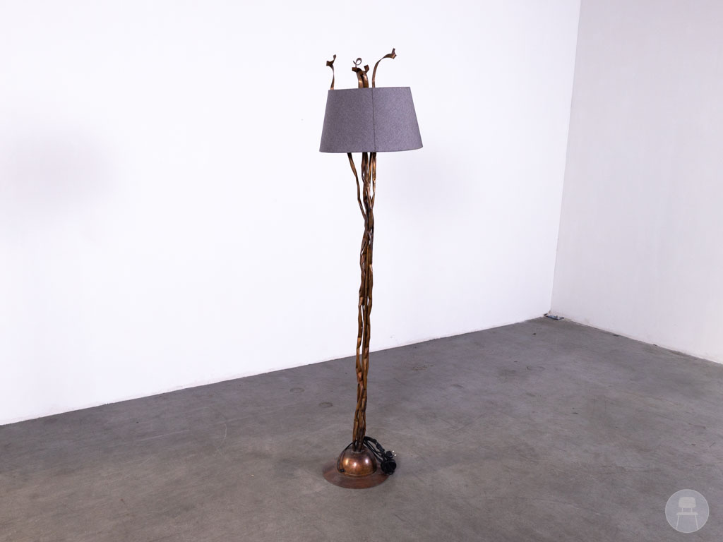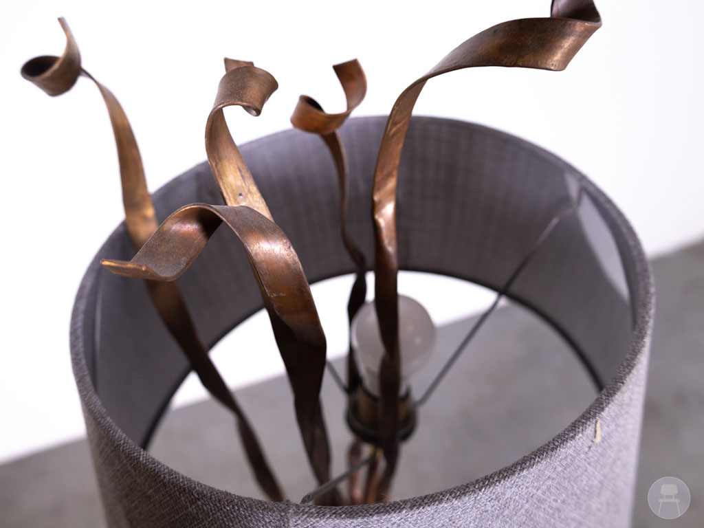 Staande Lamp Evert koper 170cm hoog is een stijlvolle vloerlamp die perfect past binnen een sfeervol horeca interieur. Deze lamp heeft een hoogte van 170 cm en is uitgevoerd met een metalen frame in koperkleur, gecombineerd met een grijze stoffen lampenkap.