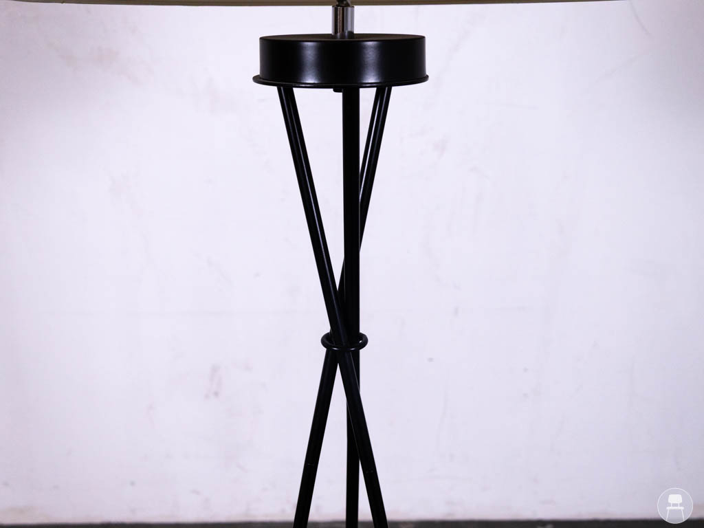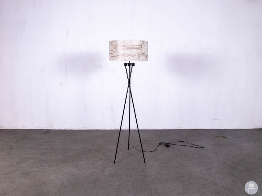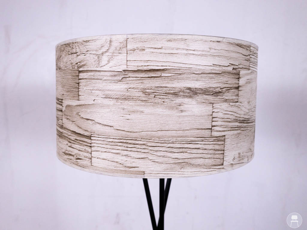 De lamp is voorzien van een cilindervormige kap met een houtstructuur-look, wat zorgt voor een rustieke en tegelijkertijd moderne uitstraling. In combinatie met het slanke zwarte metalen onderstel ontstaat een mooi contrast tussen warm en industrieel.