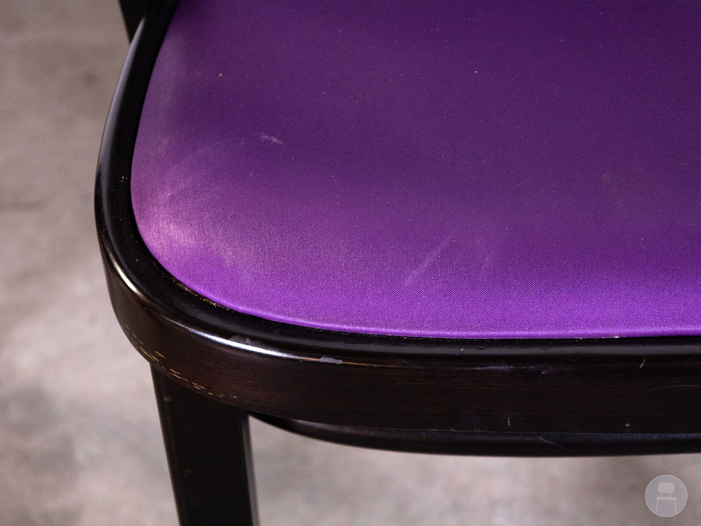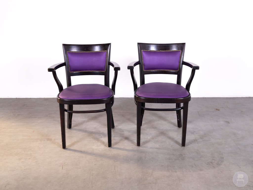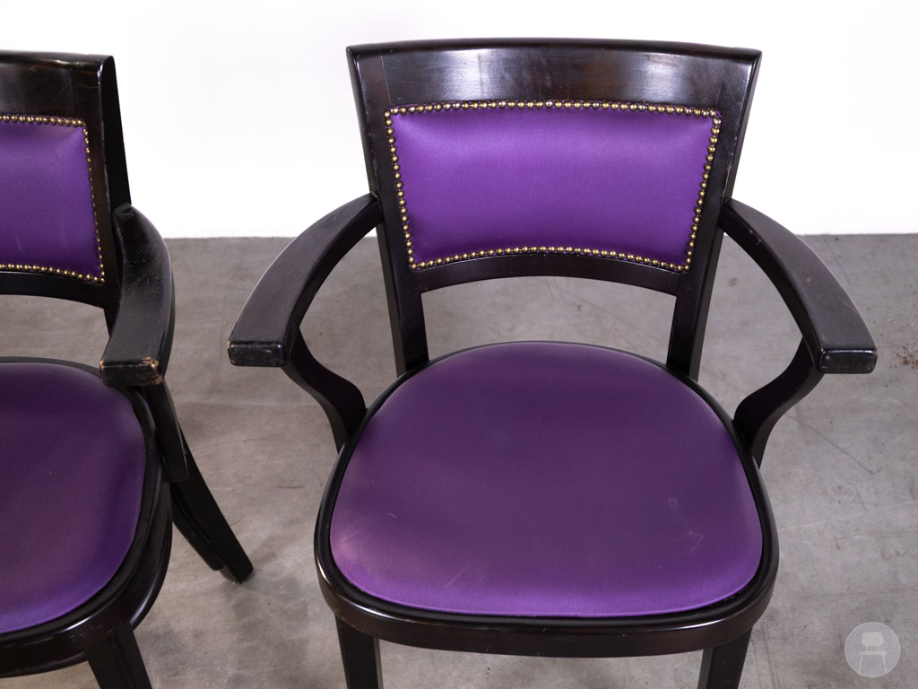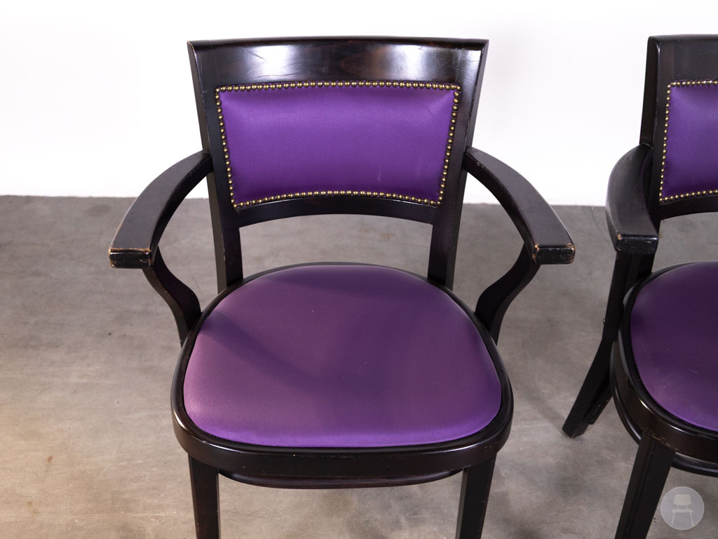 De stoelen zijn voorzien van een stevig houten frame in donkerbruine kleur, gecombineerd met een luxe paarse bekleding op zowel de zitting als de rugleuning. De siernagels langs de rug geven de stoel een chique en karaktervolle uitstraling.