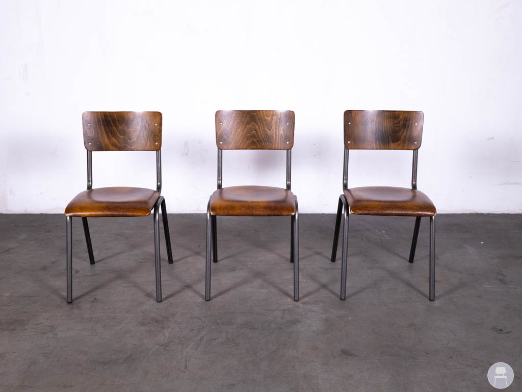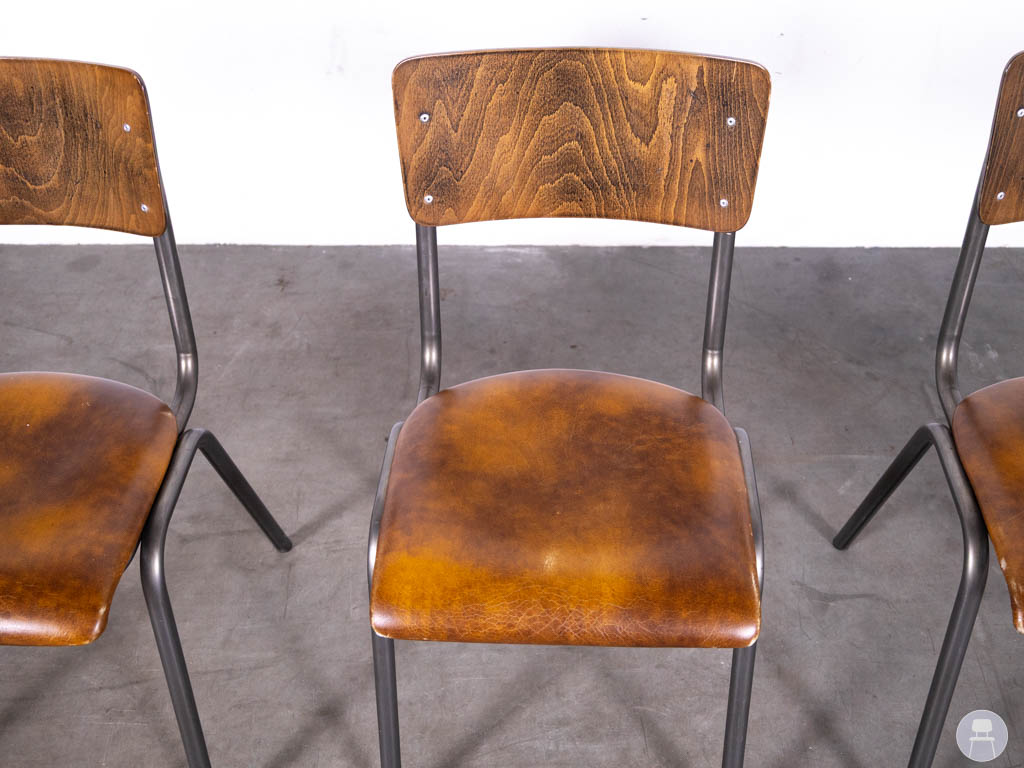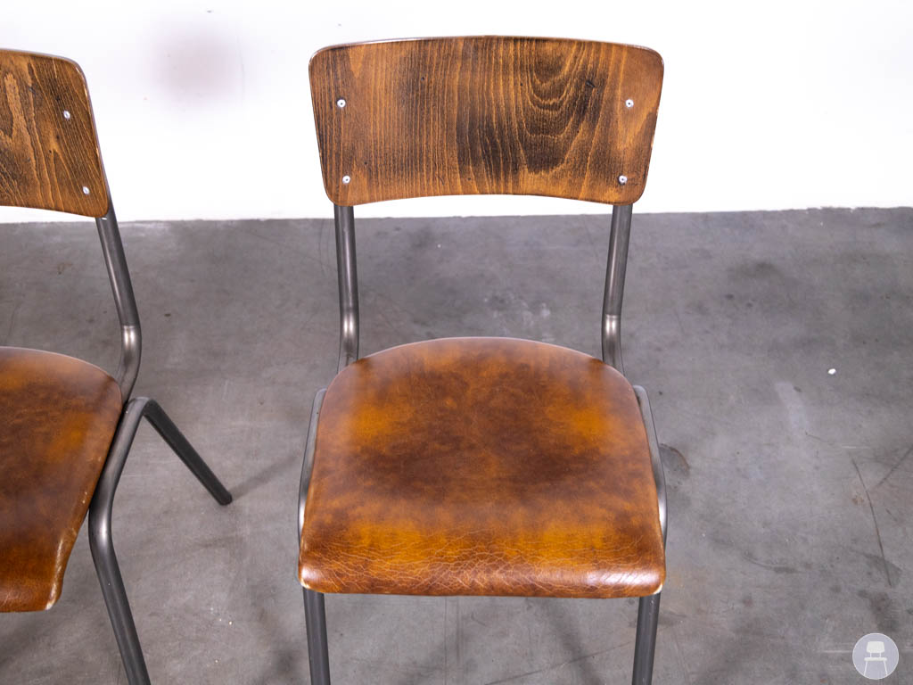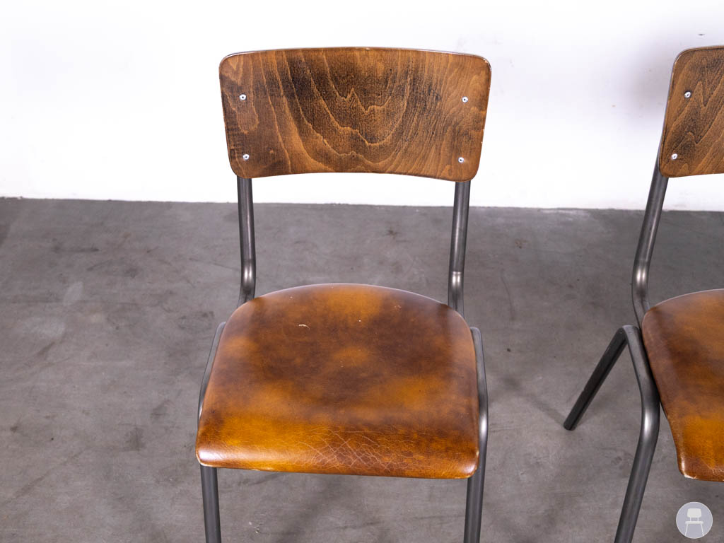 1 set 3 stuks Schoolstoel Valk Gijs is een set vintage schoolstoelen met een robuuste en tijdloze uitstraling. Deze stoelen combineren een metalen frame met een houten rugleuning en een comfortabele kunstleren zitting, wat zorgt voor een karaktervolle en praktische zitoplossing.