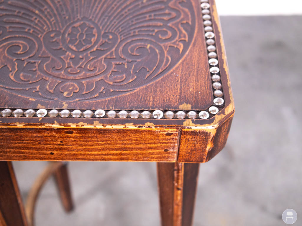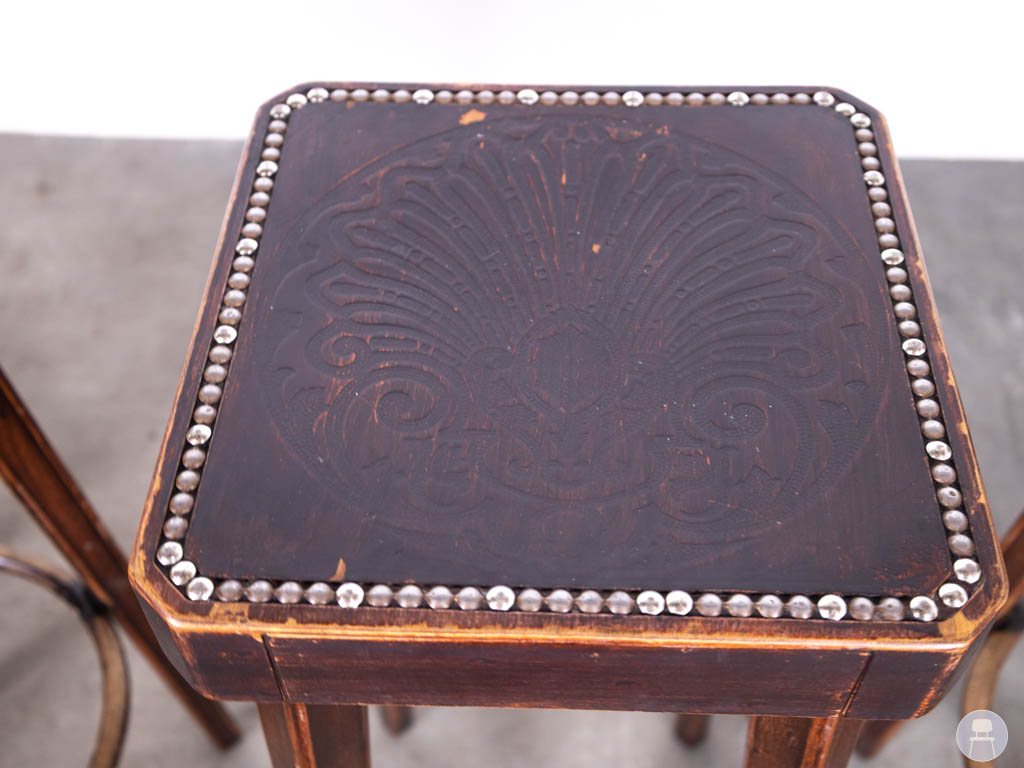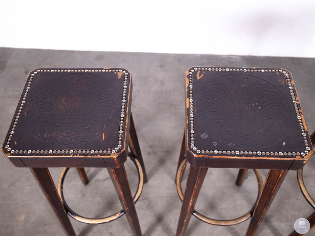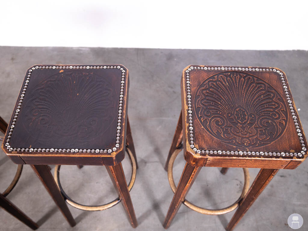 De barkrukken hebben een vierkante houten zitting met decoratieve print, afgewerkt met een rand van kleine metalen nagels. Dit geeft de krukken van Hutten een unieke en ambachtelijke uitstraling. Door het gebruik van hout en de zichtbare structuur passen deze barkrukken perfect in een retro, vintage of café-interieur.