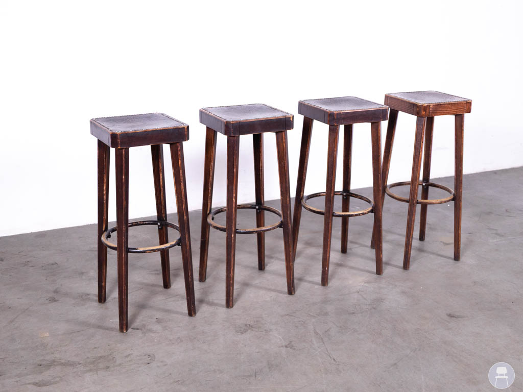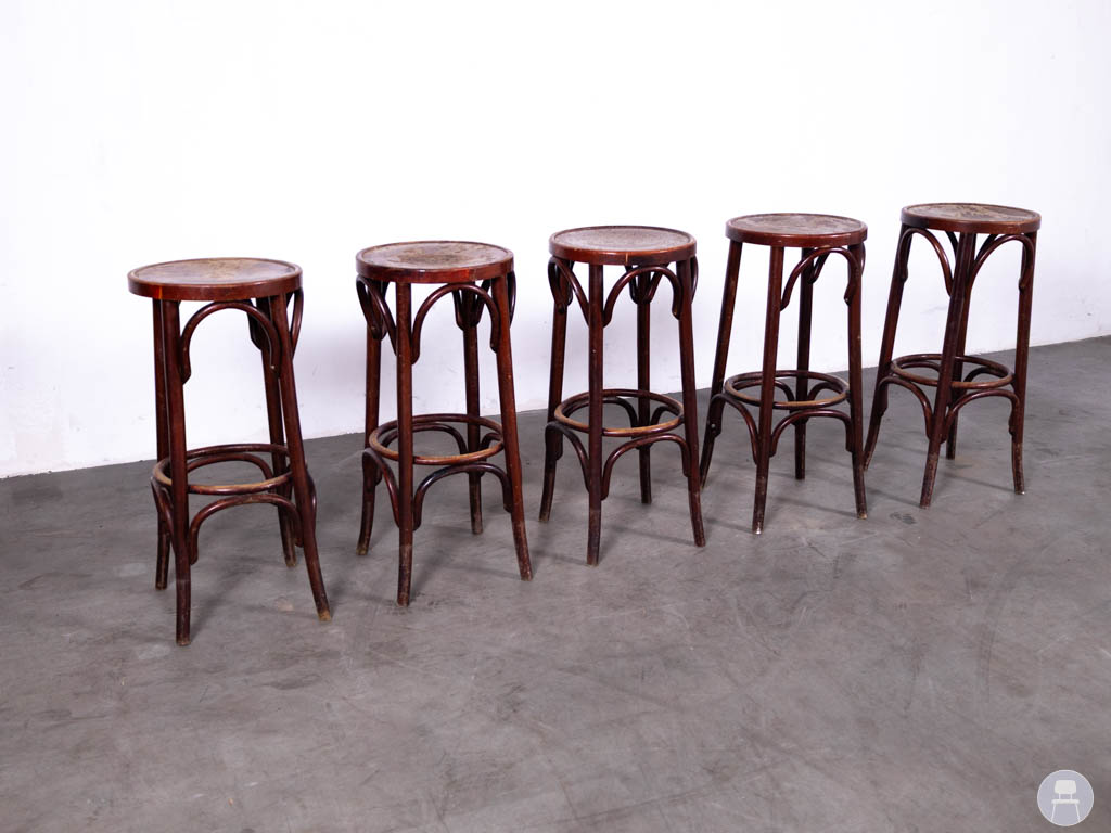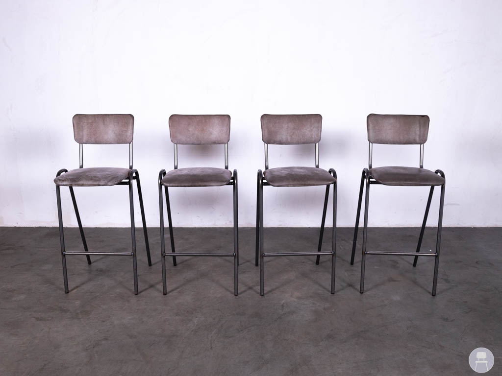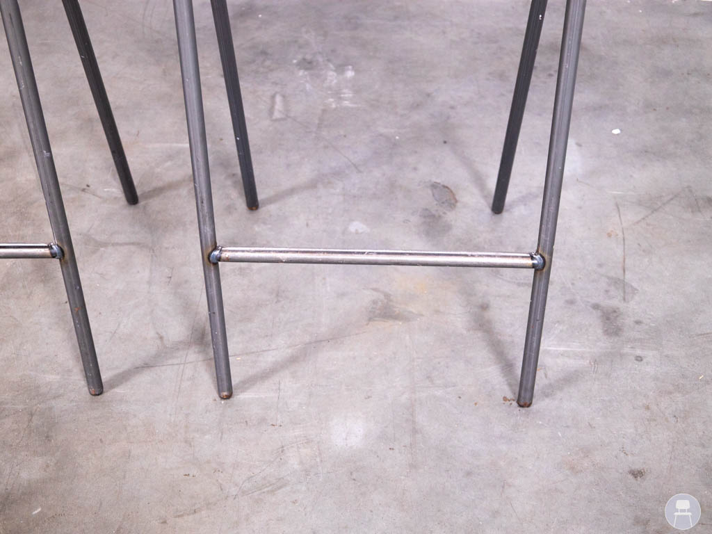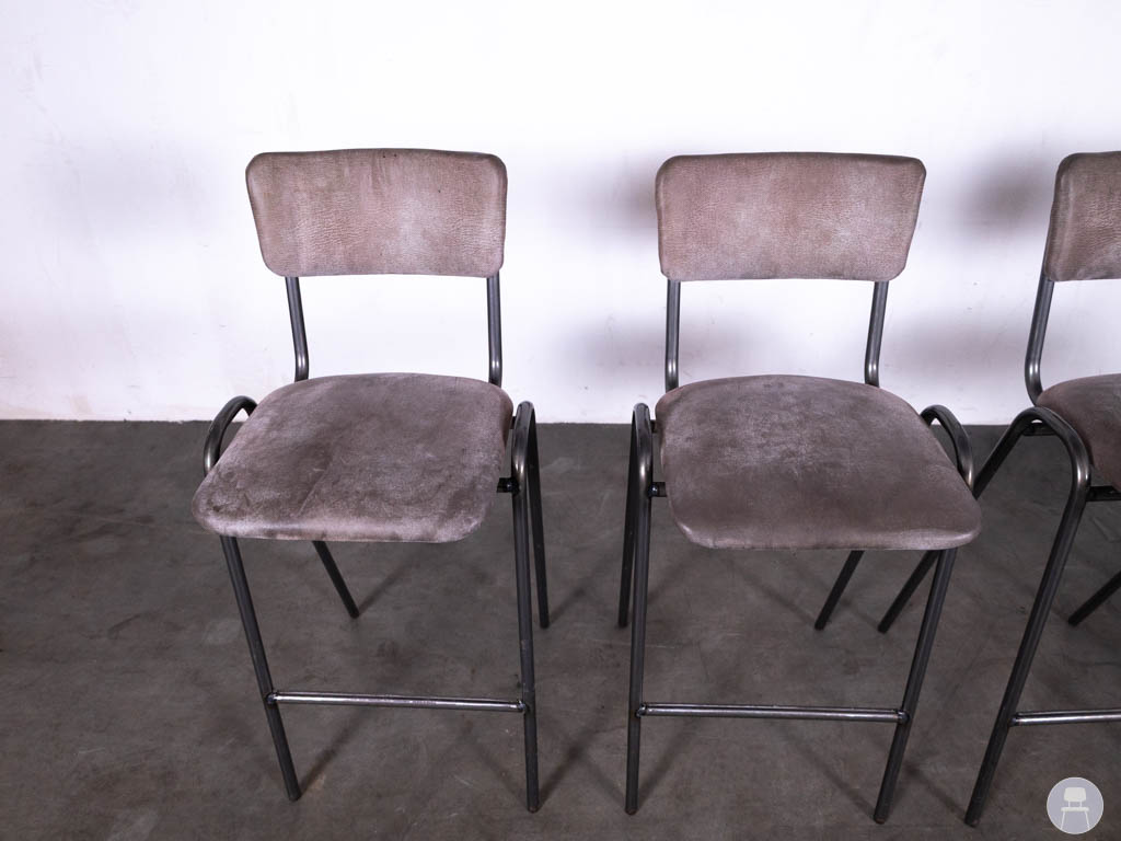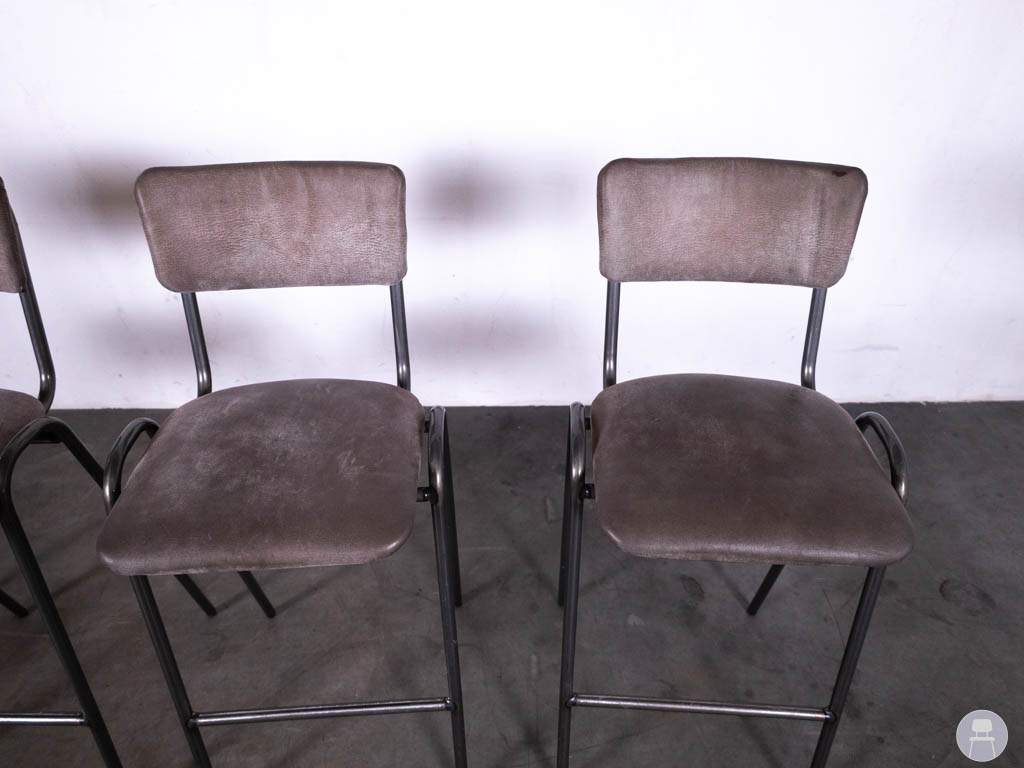 De barkrukken hebben lichte gebruikssporen op de stof, wat gebruikelijk is bij tweedehands horecameubilair, maar dit doet niets af aan de stevigheid en functionaliteit van de krukken.
