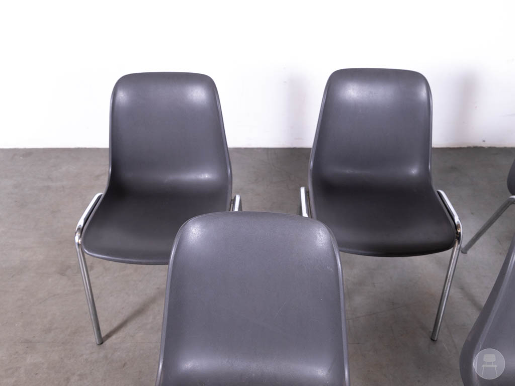 Deze stapelstoelen zijn voorzien van een stevige kunststof kuipzitting in donkergrijze kleur, gecombineerd met een verchroomd stalen onderstel. Dit zorgt voor een moderne en neutrale uitstraling die eenvoudig te combineren is met diverse interieurstijlen. Dankzij het stapelbare ontwerp zijn de stoelen ruimtebesparend en ideaal voor flexibel gebruik.