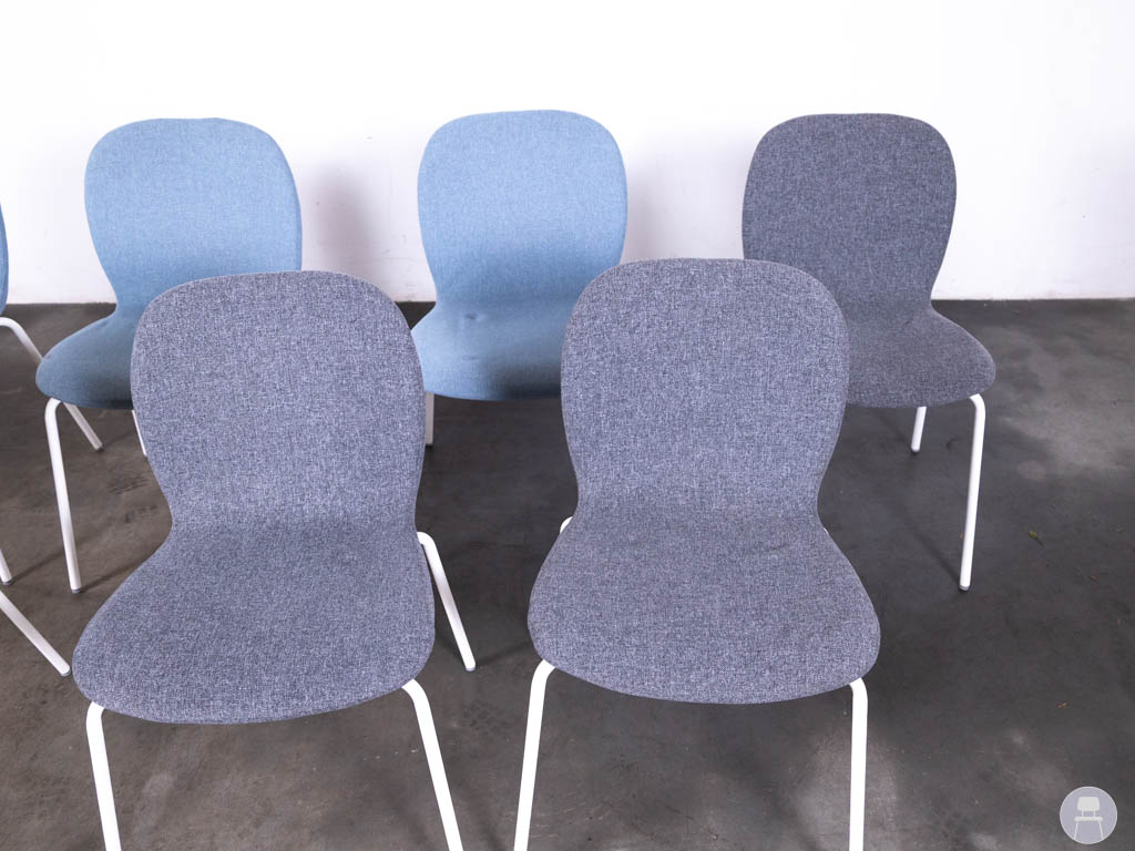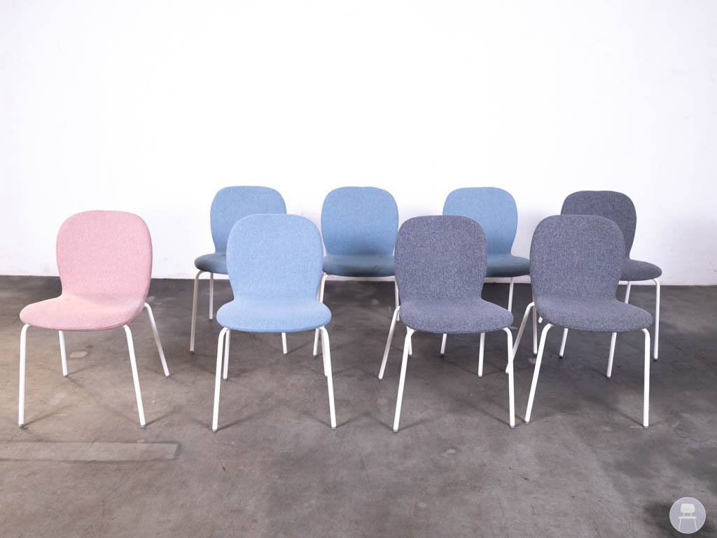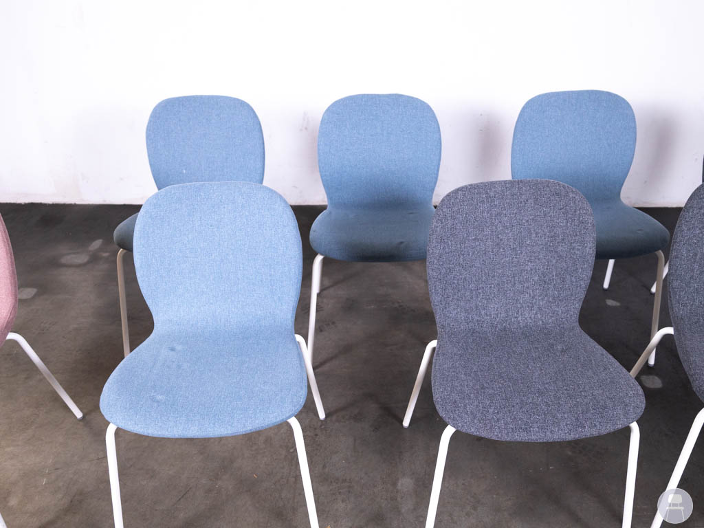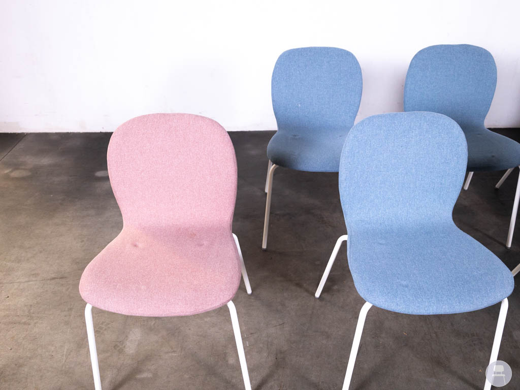 De stoelen zijn bekleed met stof in verschillende tinten (roze, blauw en grijs) en hebben een strak wit metalen onderstel. Dankzij het comfortabele zitvlak en de licht gebogen rugleuning bieden deze gestoffeerde stapelstoelen prettig zitcomfort, ook bij langer gebruik.