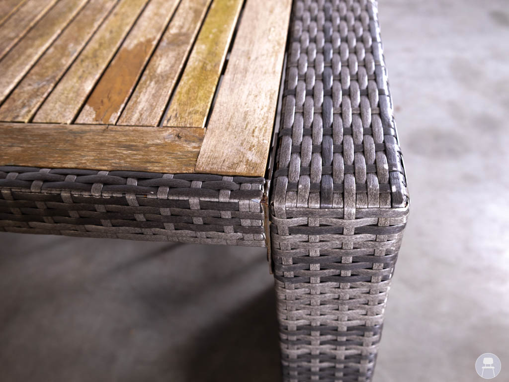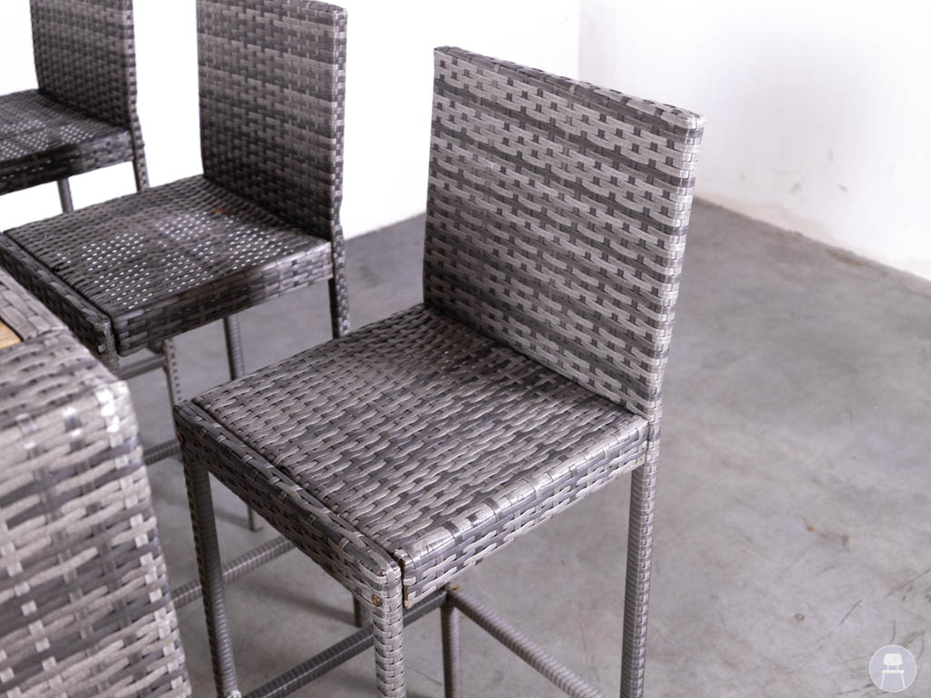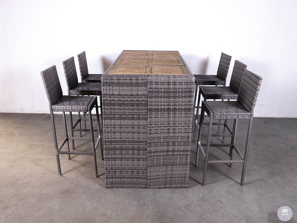 De statafel is voorzien van een teakhouten blad, wat zorgt voor een natuurlijke look, terwijl het onderstel is afgewerkt met wicker. De barkrukken zijn volledig uitgevoerd in gevlochten wicker, wat zorgt voor een comfortabele zit en een stevige constructie.