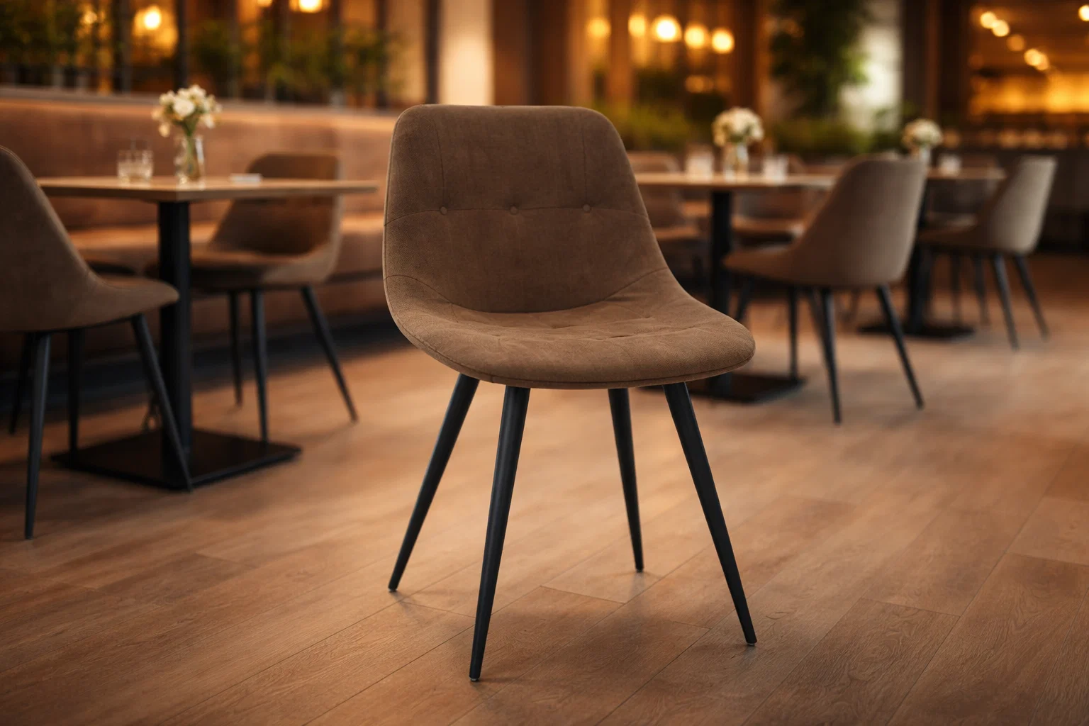 Horecastoel Ritz SC bruin suede Satelliet NIEUW beschikt over een zwart stalen frame en heeft een donkerbruin gestoffeerde kuipzitting. Ook buitenkant van de kuipzitting is bekleed met donkerbruin suede wat zorgt voor een luxe uitstraling. Een mooie aanvulling op het interieur al zeggen we het zelf.