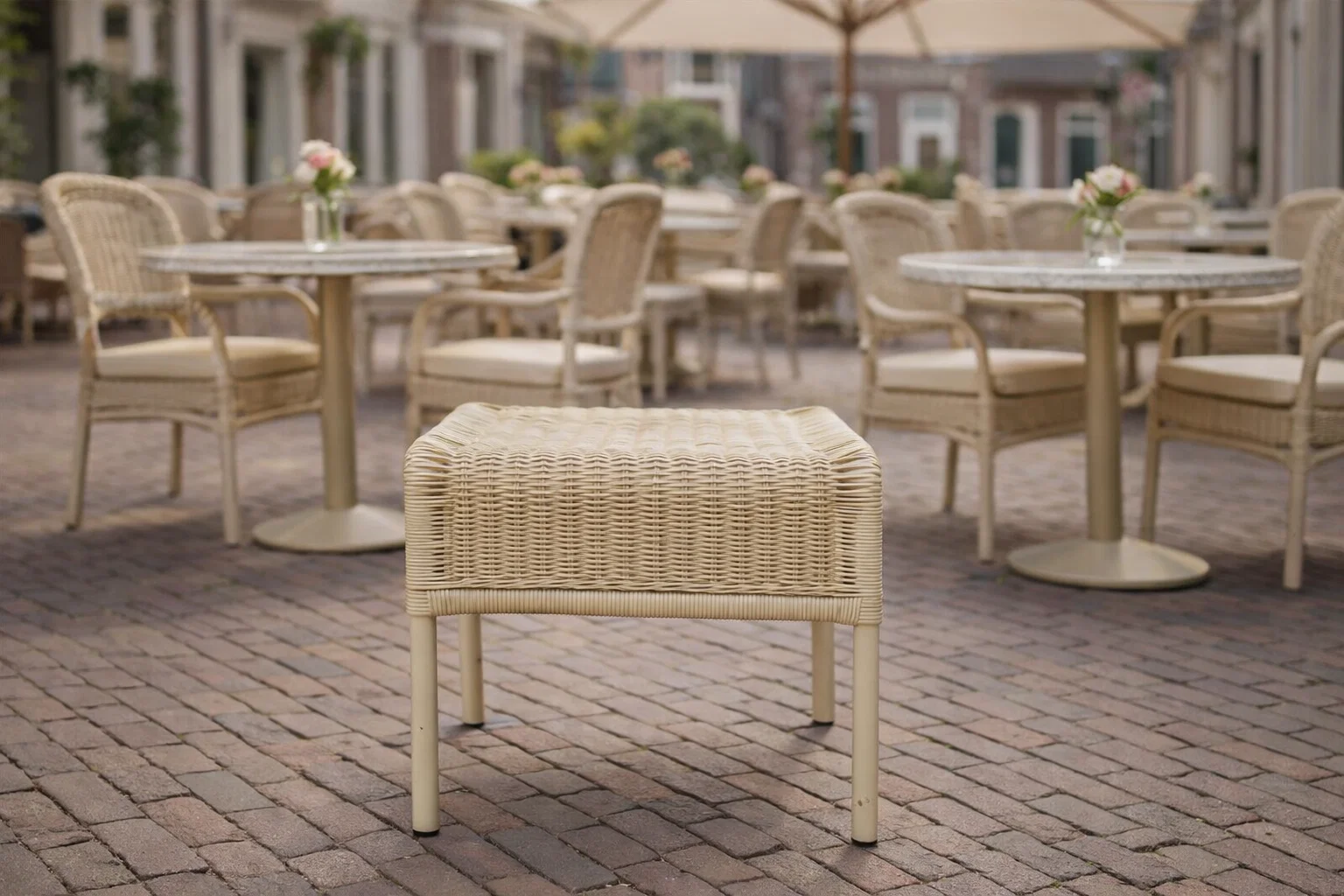 Terraskrukje Panda creme NIEUW is een stijlvolle en veelzijdige toevoeging aan elke buitenruimte. Dit krukje van Satelliet is ontworpen met een stevig aluminium frame dat zorgt voor lichtgewicht duurzaamheid en eenvoudige verplaatsing. Het is afgewerkt met hoogwaardig kunststof vlechtwerk in een mooie crèmekleur, waardoor het zowel weerbestendig als onderhoudsvriendelijk is. Dankzij zijn compacte formaat kan dit terraskrukje gemakkelijk worden gebruikt als extra zitplaats of als voetenbank, perfect passend bij de Panda model terrasstoel voor een samenhangende uitstraling op uw terras. Ideaal voor horecagelegenheden of thuisgebruik, biedt het krukje een praktische oplossing voor buitenterrassen waar flexibiliteit en comfort belangrijk zijn. Door het robuuste ontwerp kan het weer en wind trotseren, waardoor het een lange levensduur heeft zonder veel onderhoud te vereisen.