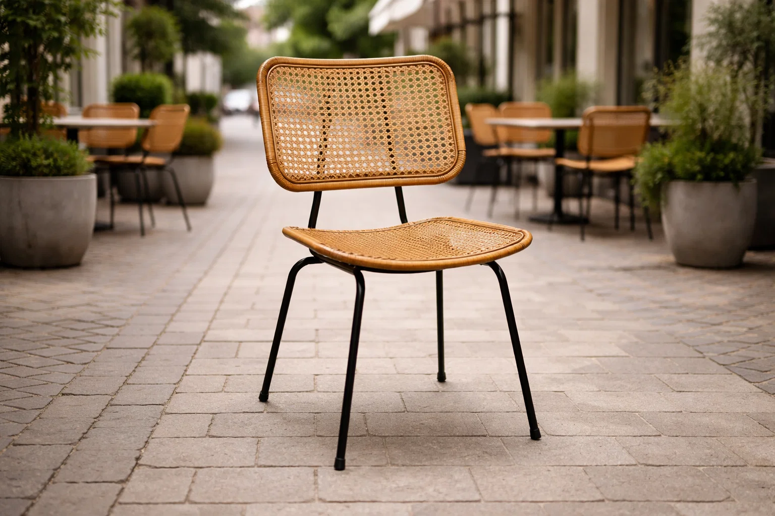 Terrasstoel 550 SC rotan May NIEUW combineert stijl en duurzaamheid en is speciaal ontworpen voor intensief horecagebruik. Deze nieuwe terrasstoel heeft een stevig aluminium frame dat lichtgewicht én roestbestendig is – ideaal voor buitengebruik. De zitting en rugleuning zijn gemaakt van kunststof vlechtwerk in rotanlook, wat zorgt voor een warme, natuurlijke uitstraling met het gemak van onderhoudsvriendelijke materialen.