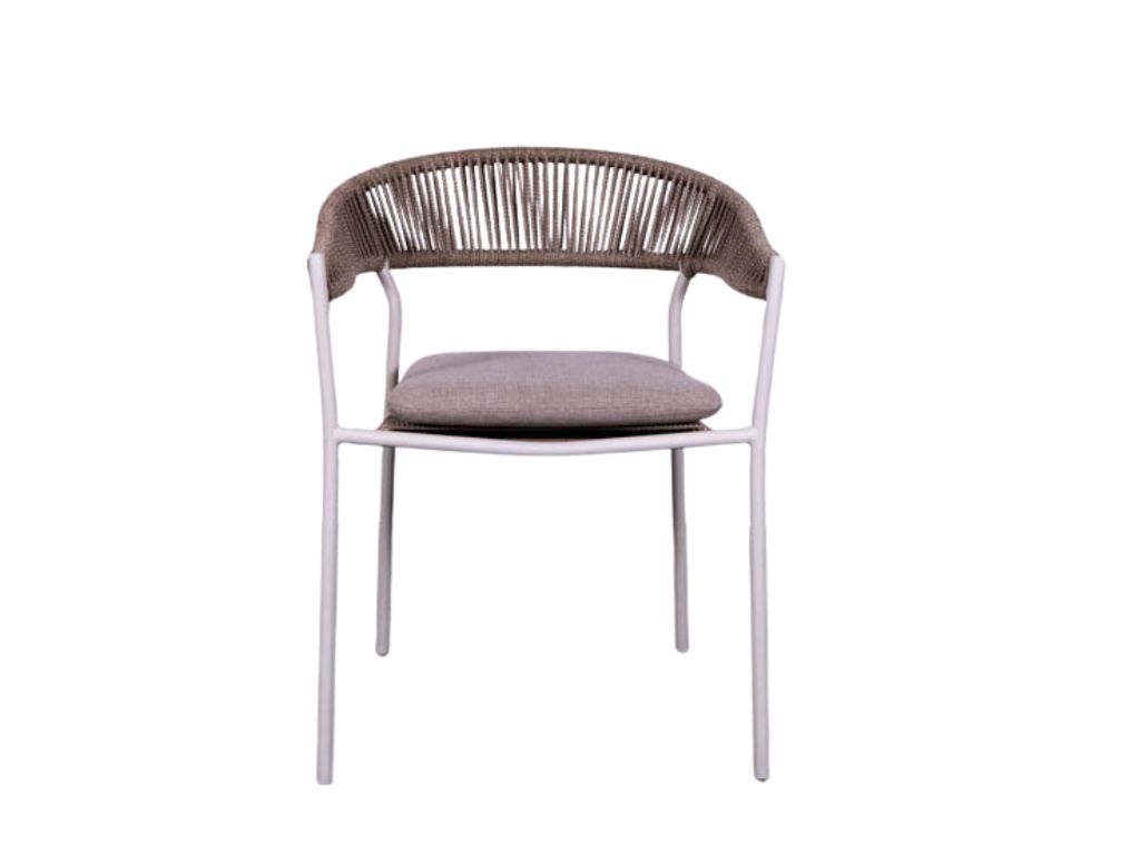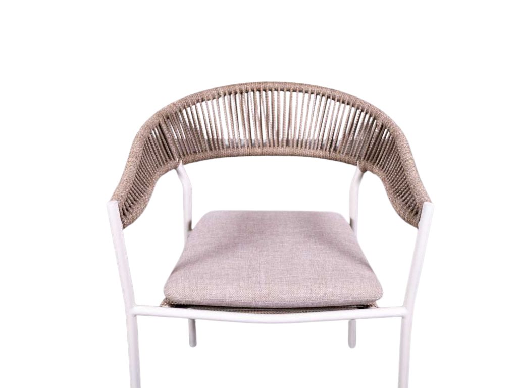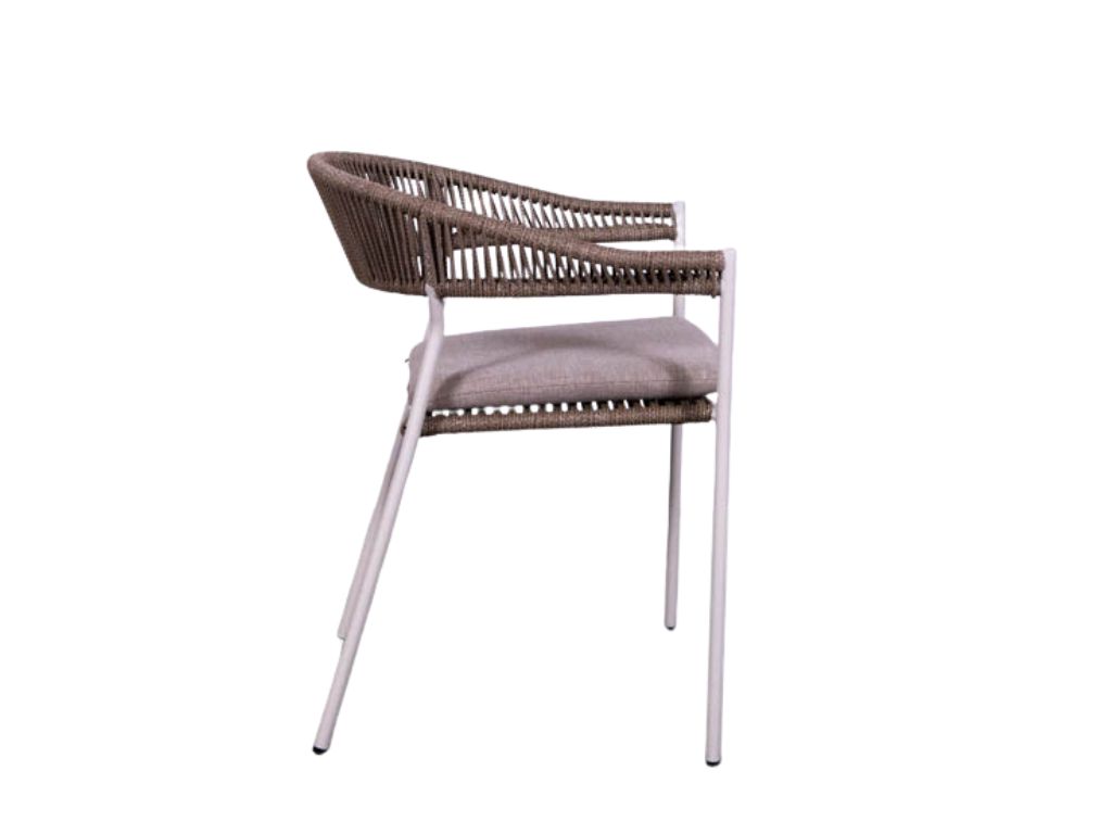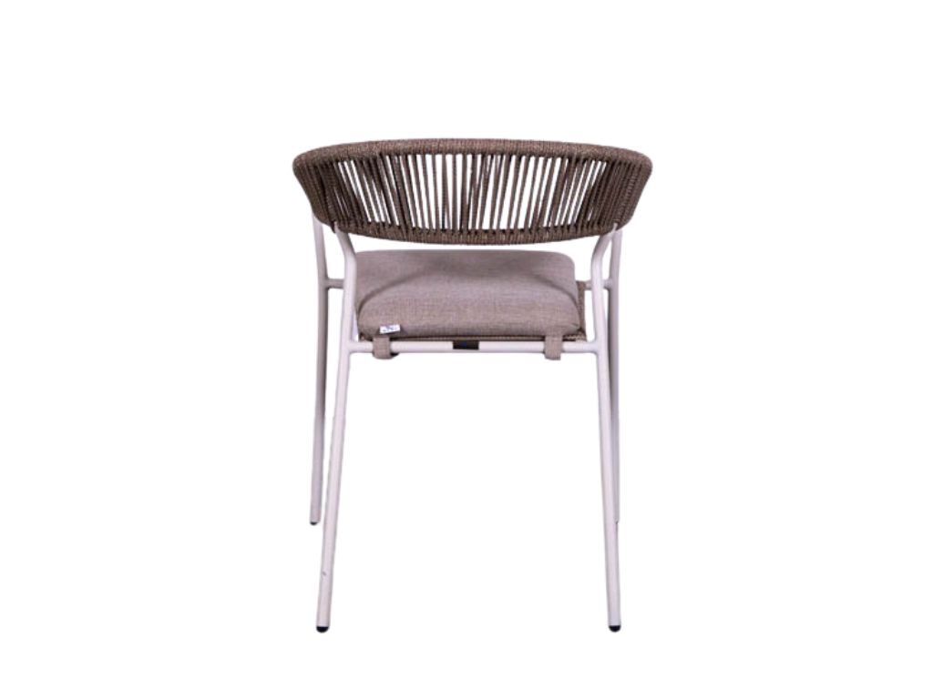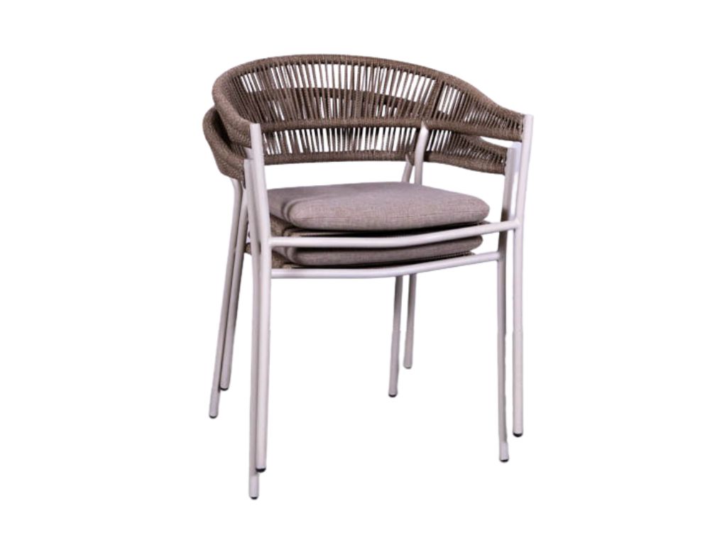 De stoel is voorzien van een comfortabel beige kussen dat eenvoudig afneembaar is — praktisch voor schoonmaak en onderhoud. Dankzij het lichte gewicht en het stapelbare ontwerp is de Finn ideaal voor horecagelegenheden waar flexibiliteit en efficiënt gebruik van ruimte belangrijk zijn. Met zijn warme beige tint en verfijnde afwerking past deze stoel perfect op zowel moderne als natuurlijke terrassen. Een perfecte combinatie van design, comfort en functionaliteit.