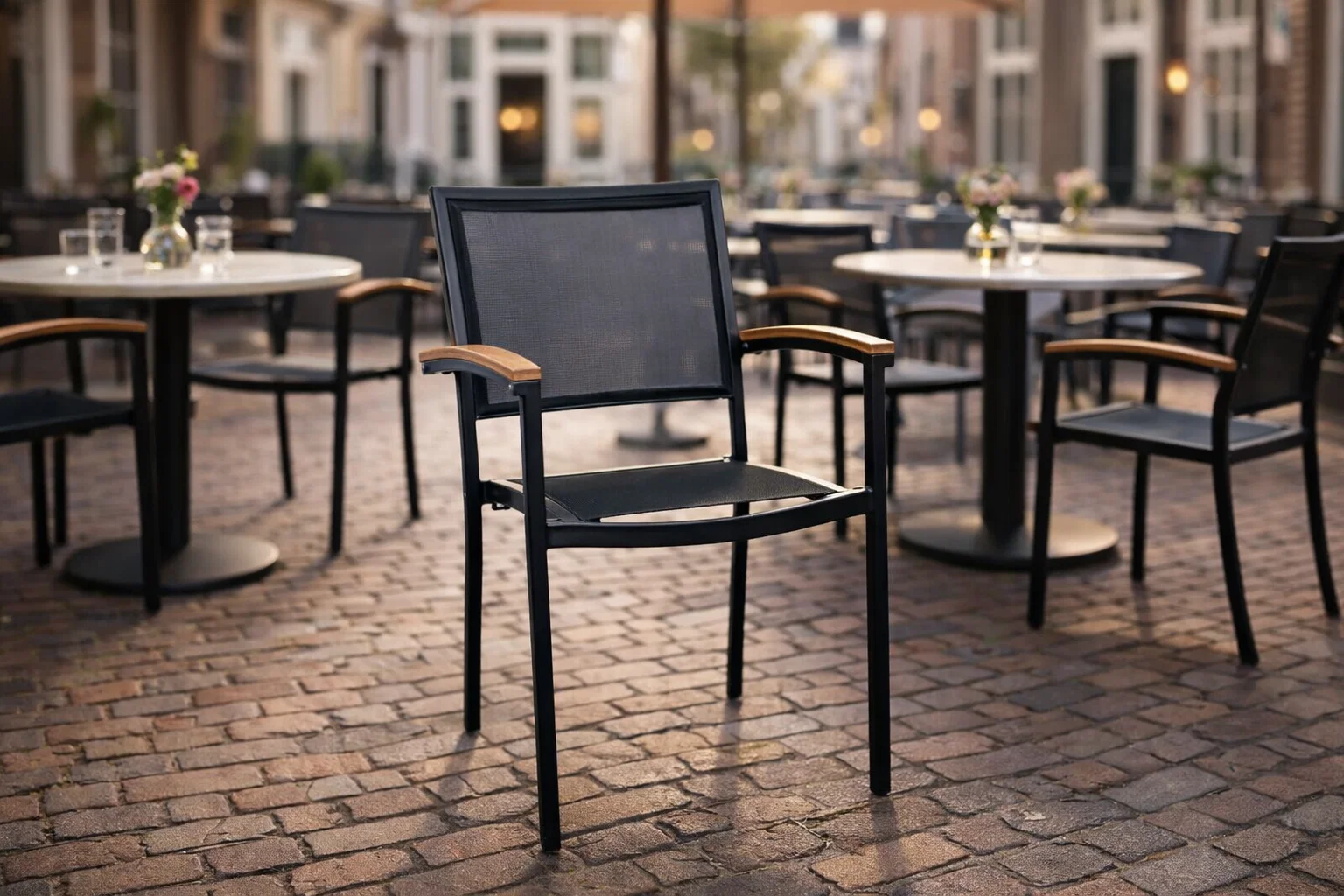 Terrasstoel New York AC Batyline Satelliet NIEUW is een prachtige terrasstoel voor op het buiten terras en is van het merk Satelliet. De stoel is gemaakt van een aluminium frame en is voorzien van een batyline zitting en rugleuning. Doordat de armleuningen zijn afgewerkt met teakhout krijgt deze barkruk een extra luxe uitstraling. Maak je terras compleet met deze mooie stoelen en laat je gasten genieten!