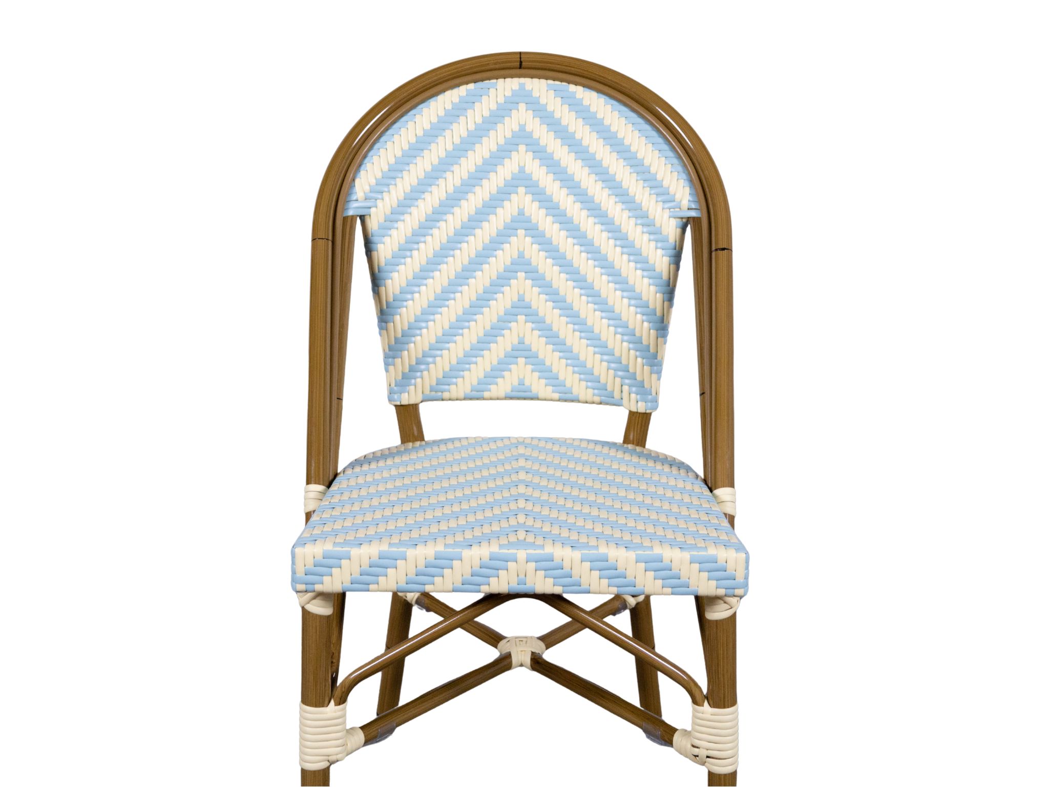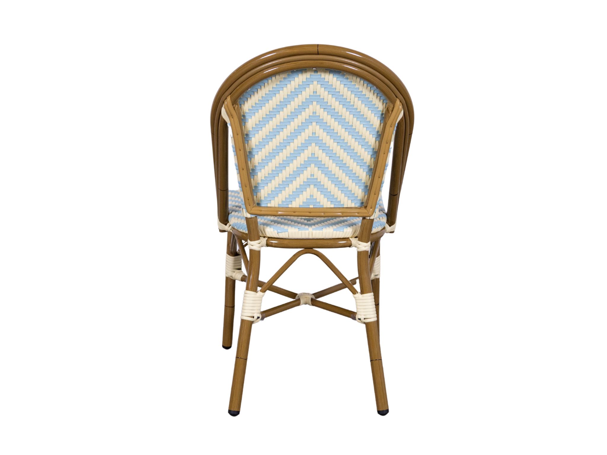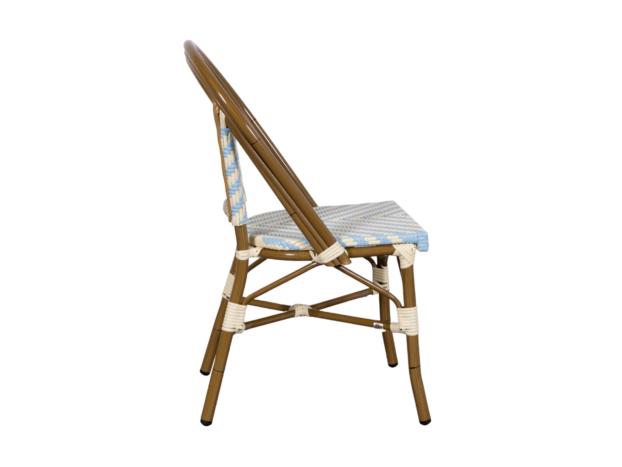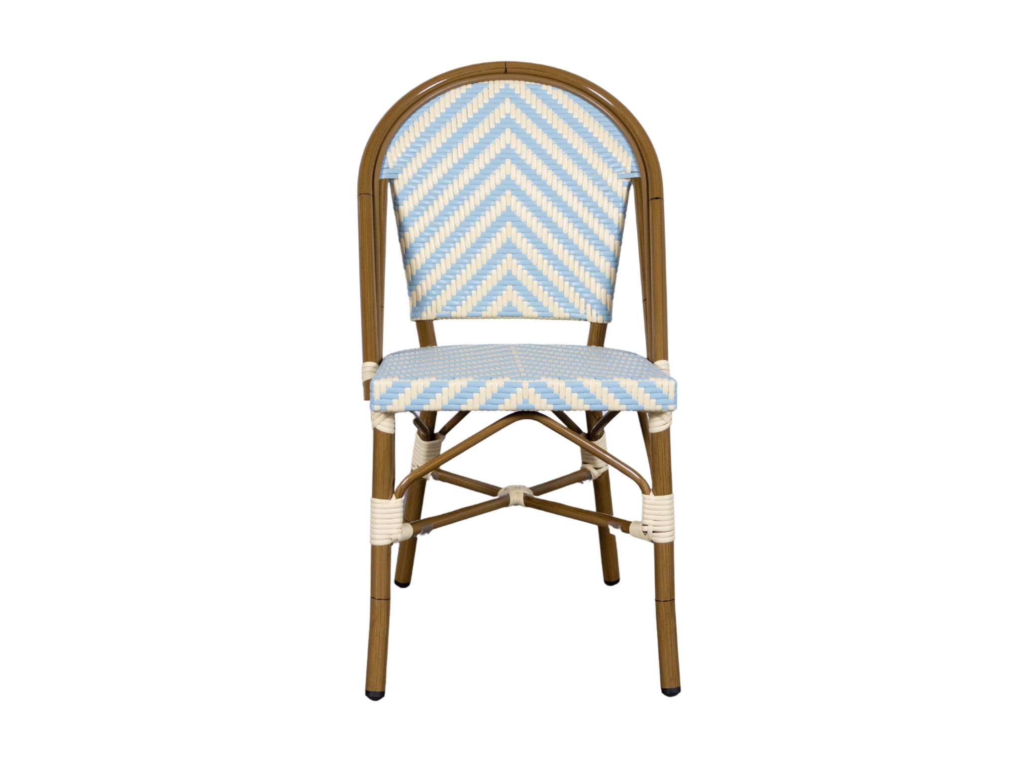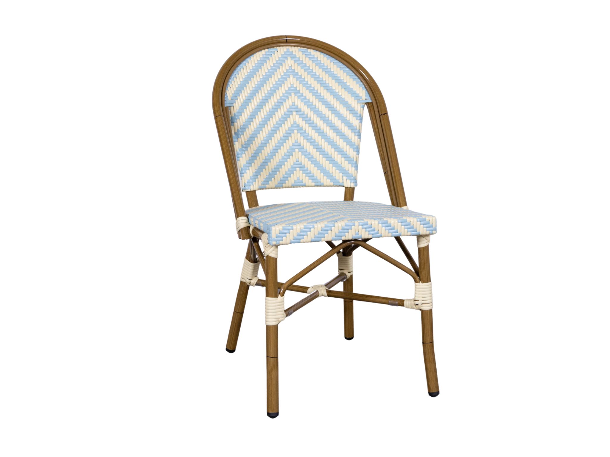 Terrasstoel Paris Notre SC lichtblauw NIEUW brengt direct die charmante Franse bistro-sfeer naar jouw horeca terras! Met zijn speelse, maar stijlvolle zigzag patroon in lichtblauw en wit, geeft deze stoel elke buitenruimte een frisse en zomerse uitstraling. Het stevige aluminium frame met bamboe-look zorgt voor de perfecte balans tussen elegantie en duurzaamheid, waardoor hij bestand is tegen intensief gebruik én alle weersomstandigheden.
