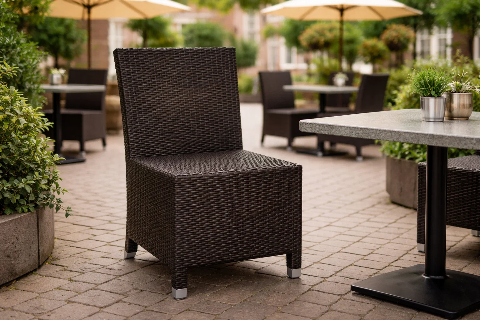 Terrasstoel Wicker Bonaire NIEUW is een stijlvolle en duurzame keuze voor elk terras. Met een stevig aluminium frame en een wicker gevlochten zitting, biedt deze terrasstoel niet alleen een luxe uitstraling, maar ook optimaal zitcomfort. Dankzij het lichte gewicht is de stoel eenvoudig te verplaatsen en ideaal voor flexibel gebruik in horecagelegenheden. Het weerbestendige materiaal maakt de Wicker Bonaire perfect voor buitengebruik, terwijl de moderne look een stijlvolle toevoeging is aan elke buitenruimte. Kies voor deze onderhoudsvriendelijke terrasstoel en geniet van een combinatie van comfort en praktisch gebruiksgemak!