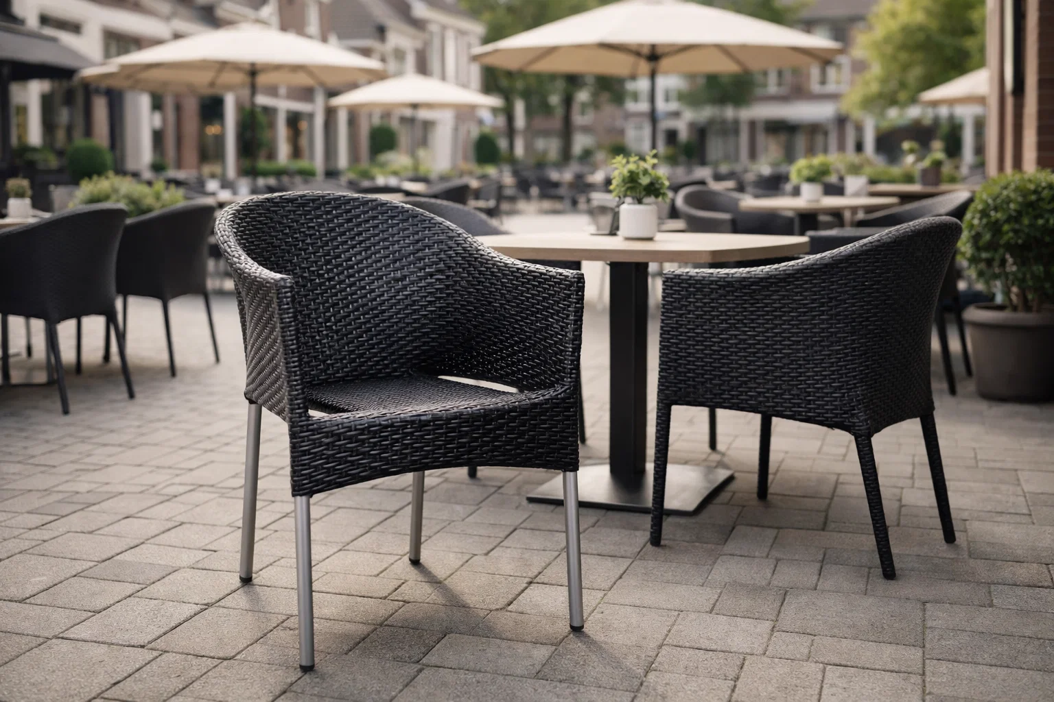 Kies voor de Terrasstoel Wicker Keulen zwart en geniet van een combinatie van stijl, comfort en duurzaamheid op jouw terras of in jouw horecazaak!