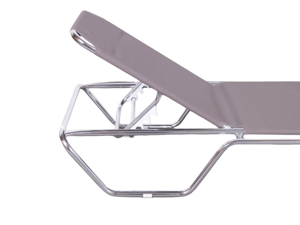 Het frame is vervaardigd uit lichtgewicht en sterk aluminium, wat zorgt voor stabiliteit en eenvoudig verplaatsen. Het liggedeelte is uitgevoerd in duurzaam textileen in een stijlvolle beige/taupe kleur, wat ademend, weerbestendig en onderhoudsvriendelijk is.