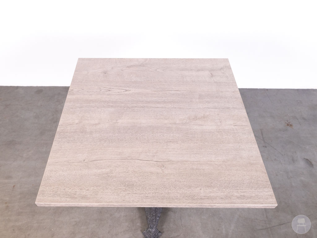 Het blad is uitgevoerd in eikenlook met een grijze afwerking, wat zorgt voor een moderne en rustige uitstraling die eenvoudig te combineren is met diverse onderstellen en interieurstijlen. Dankzij het sterke materiaal (melamine) is het blad krasvast en geschikt voor intensief gebruik binnen de horeca. Het formaat van 70×70 cm maakt het perfect voor 2 tot 4 personen.