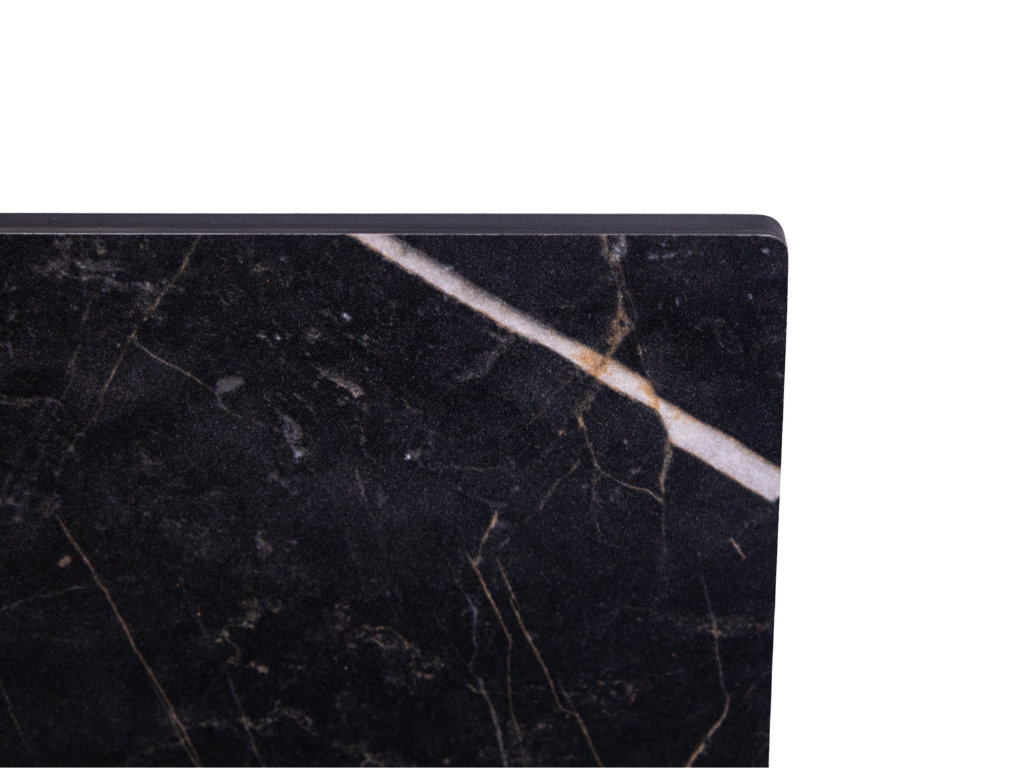 Het blad heeft een zwarte marmerlook met subtiele aders, wat zorgt voor een luxe en moderne uitstraling. Dankzij het gebruik van HPL (High Pressure Laminate) is het tafelblad zeer sterk, krasbestendig en eenvoudig te reinigen. Hierdoor is het ideaal voor intensief gebruik op terrassen, in cafés of restaurants.