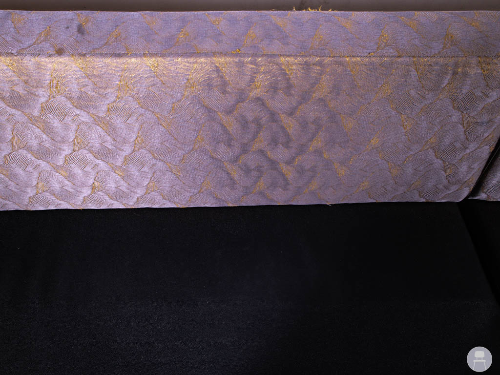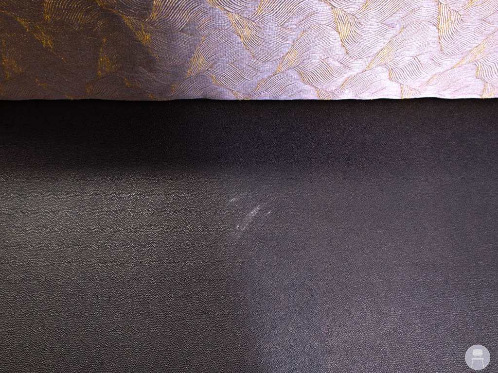 De bank is uitgevoerd met een donkere zitting en een taupe/goud rugdeel met patroon in kunstleer, wat zorgt voor een warme en chique uitstraling. Ook de achterkant is gestoffeerd, waardoor de bank vrij in de ruimte geplaatst kan worden. Het onderstel is van metaal, wat zorgt voor een stevige basis.