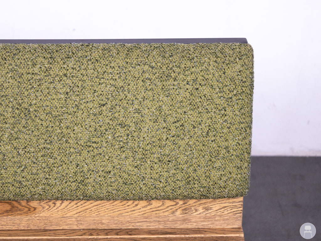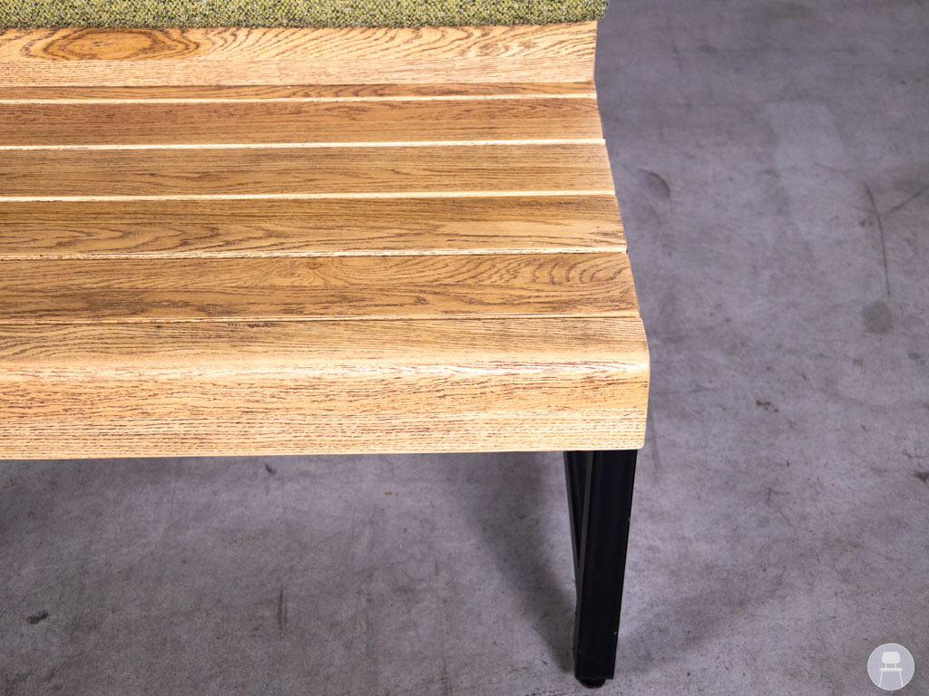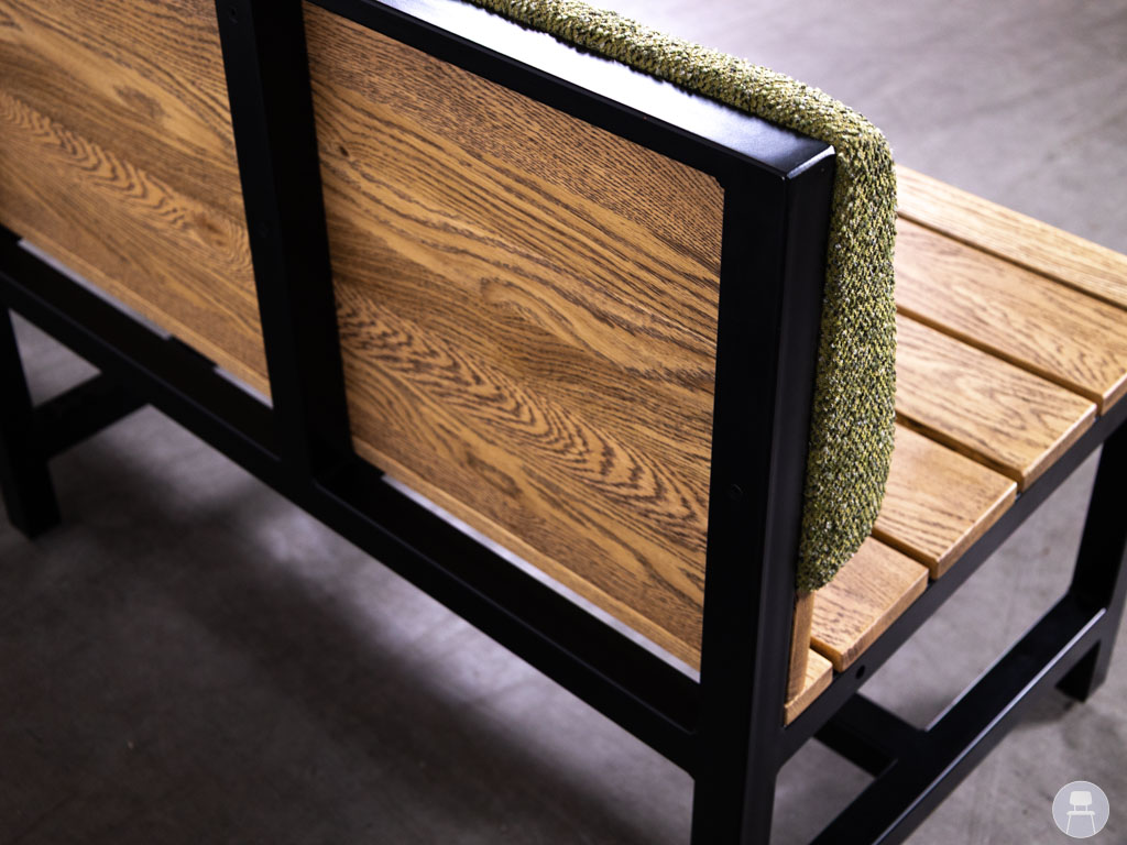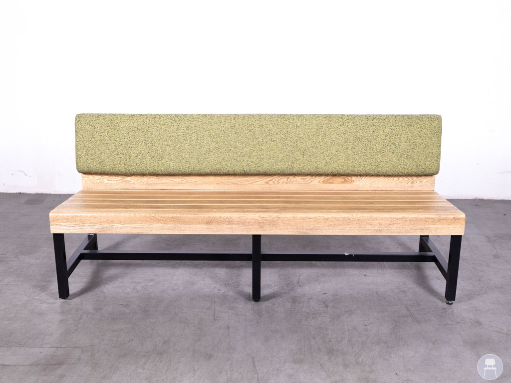 De zitting van de horecabank is vervaardigd uit strak afgewerkt hout in een naturel tint, wat mooi contrasteert met het zwarte metalen onderstel. De rugleuning is bekleed met een grove, groene stof die niet alleen een frisse uitstraling geeft, maar ook zorgt voor een comfortabele zitervaring. De combinatie van natuurlijke materialen en industriële accenten maakt deze bank van Satelliet bijzonder geschikt voor zowel warme, huiselijke interieurs als strakke, eigentijdse settings.