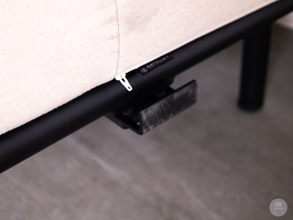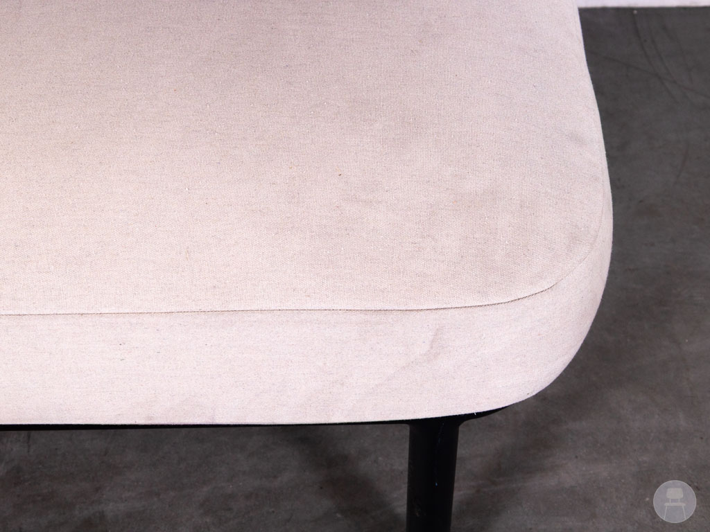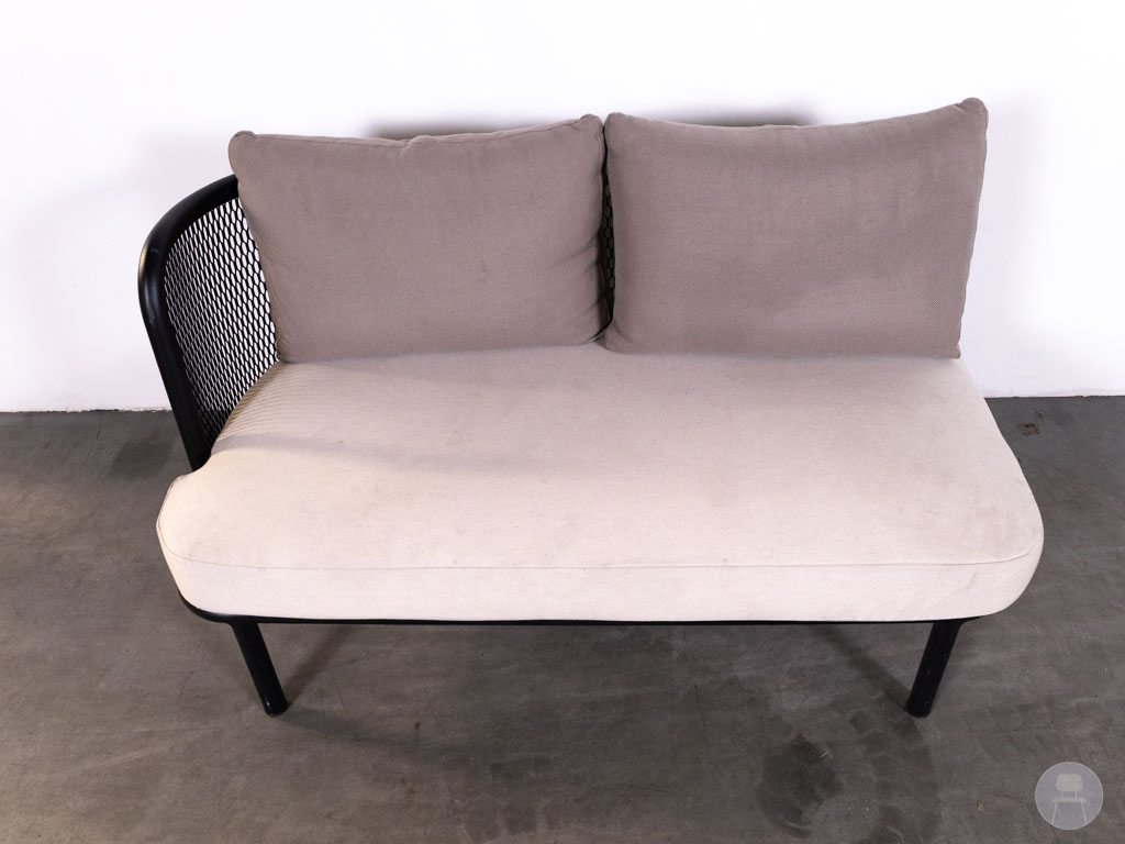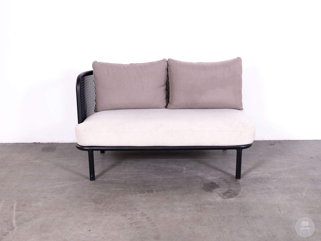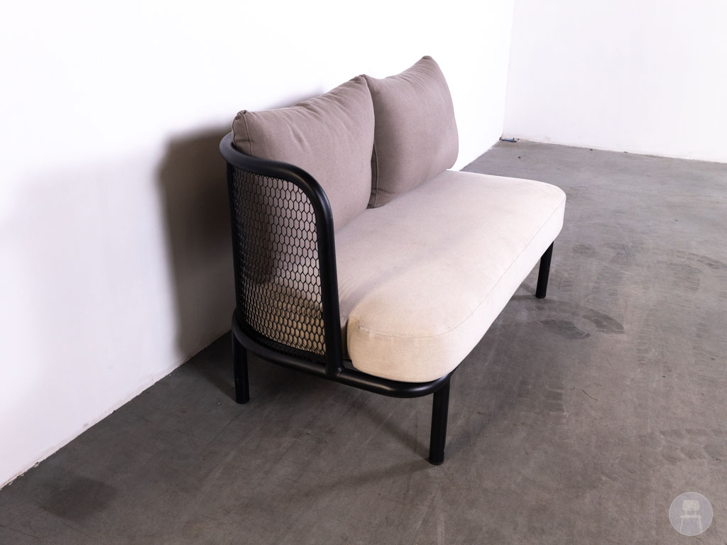 De bank is uitgevoerd met een stevig aluminium frame in zwart en voorzien van comfortabele stoffering in een lichte, neutrale kleur. De zachte zit- en rugkussens zorgen voor een ontspannen zitervaring, terwijl het opengewerkte zijpaneel een luxe en eigentijdse uitstraling geeft. Met een afmeting van 140×75 cm biedt deze terrasbank voldoende ruimte voor meerdere personen. Deze uitvoering beschikt aan de rechterzijde over een koppelhaak, waarmee eenvoudig een extra element bevestigd kan worden voor het creëren van een grotere loungeopstelling. De bank vertoont gebruikssporen op de stof, passend bij tweedehands horecameubilair.