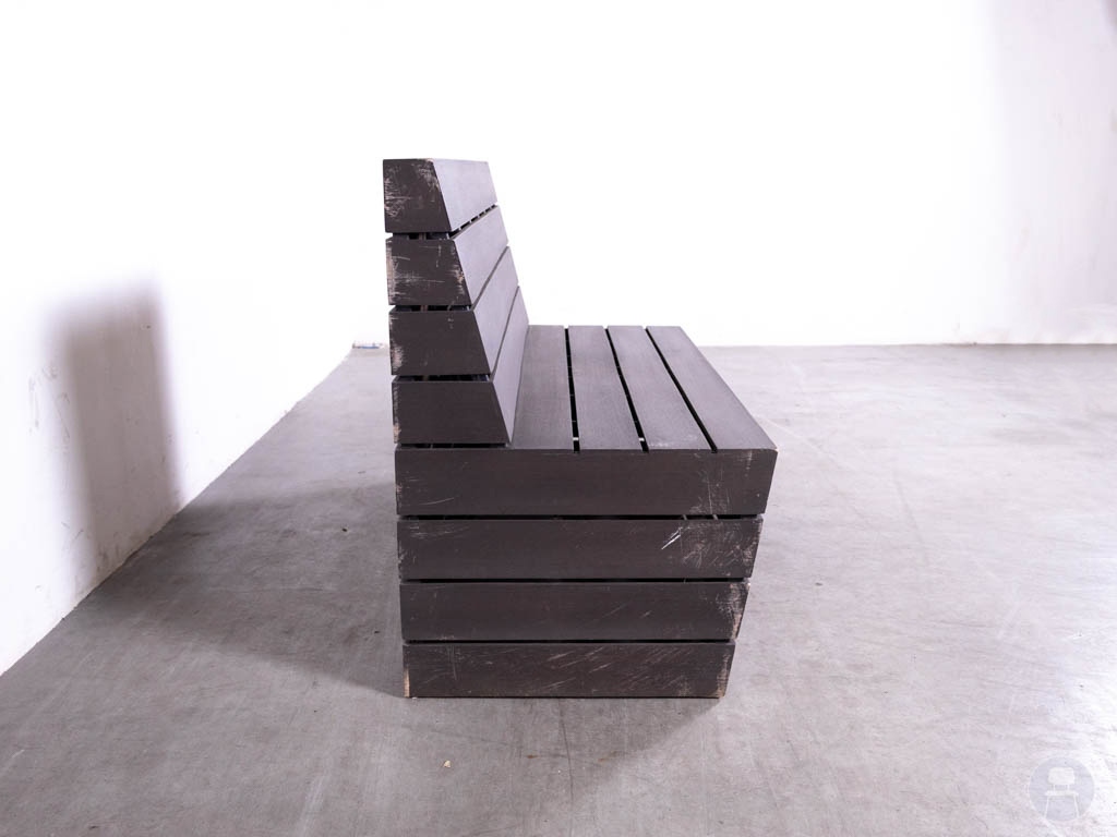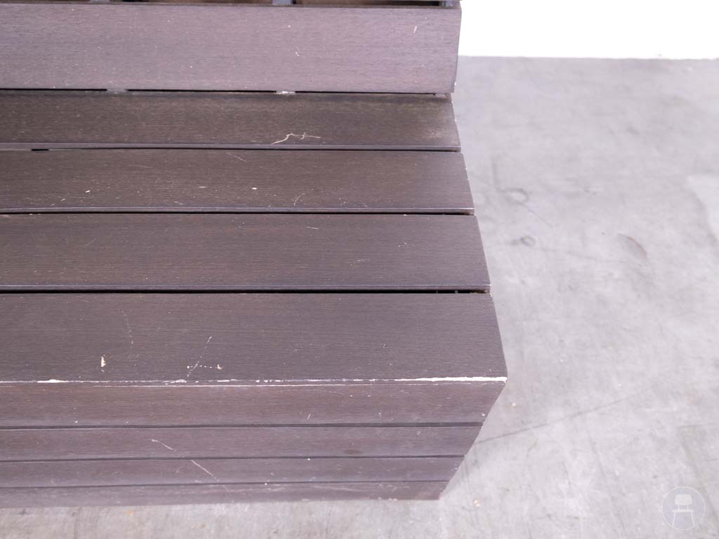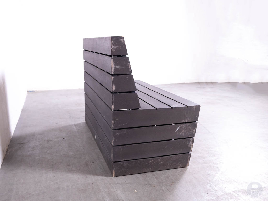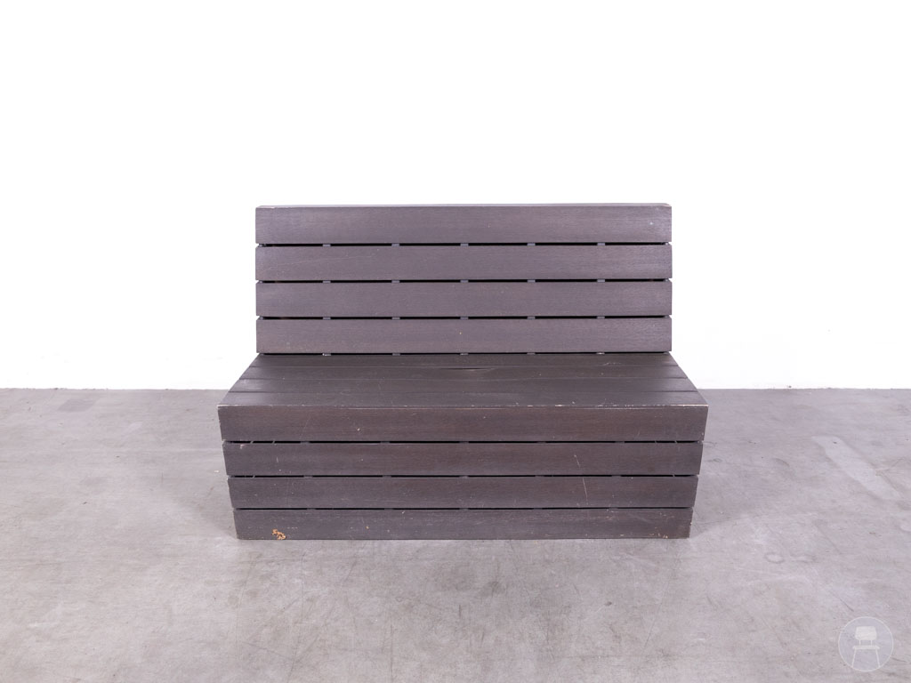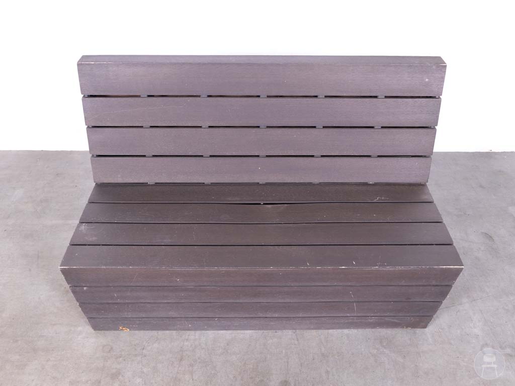 Deze uitvoering van de Luna B is vervaardigd van hout in een donkerbruine kleur, wat zorgt voor een warme en eigentijdse uitstraling. De horizontale lattenstructuur geeft de terrasbank een strakke en robuuste look. De bank is voorzien van zichtbare gebruikssporen, wat bijdraagt aan de karaktervolle en geleefde uitstraling — een geliefde stijl in veel buitenconcepten.