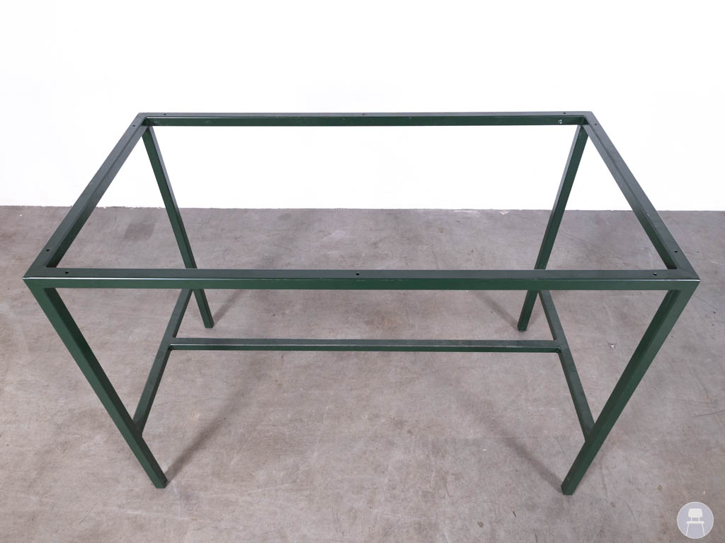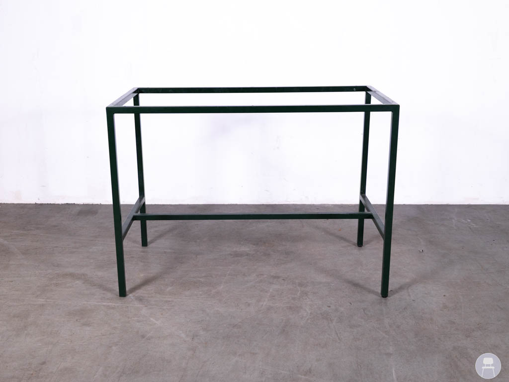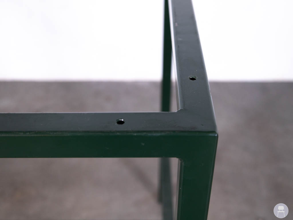 Het onderstel is uitgevoerd in groen gecoat staal, wat zorgt voor een robuuste uitstraling en extra bescherming tegen gebruik buitenshuis. Dankzij het strakke, minimalistische ontwerp past dit frame in zowel moderne als industriële omgevingen.