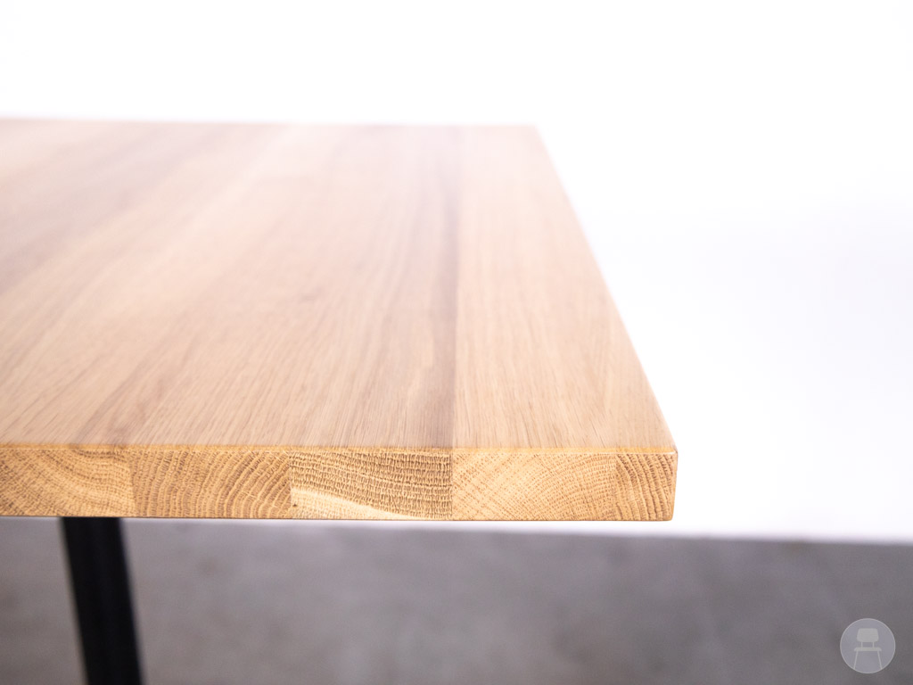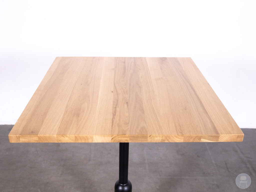 Het blad rust stevig op een zwarte, metalen middenpoot met een vierkante voetplaat. Deze zorgt niet alleen voor optimale stabiliteit, maar ook voor een open uitstraling rondom de tafel, waardoor gasten gemakkelijk kunnen plaatsnemen zonder hinder van tafelpoten op de hoeken. Bovendien is de metalen voet voorzien van een duurzame coating die bescherming biedt tegen intensief gebruik in drukke omgevingen.