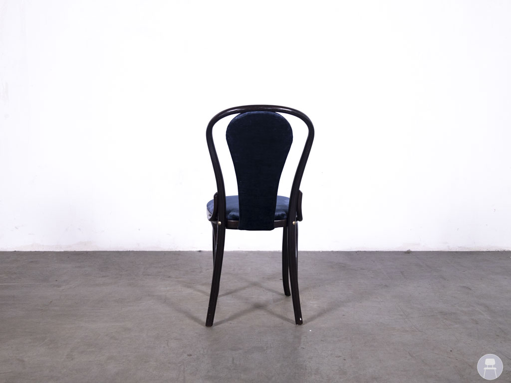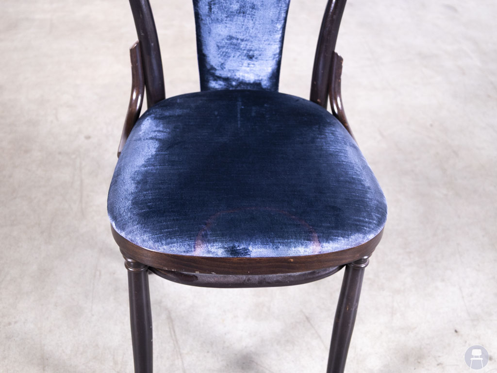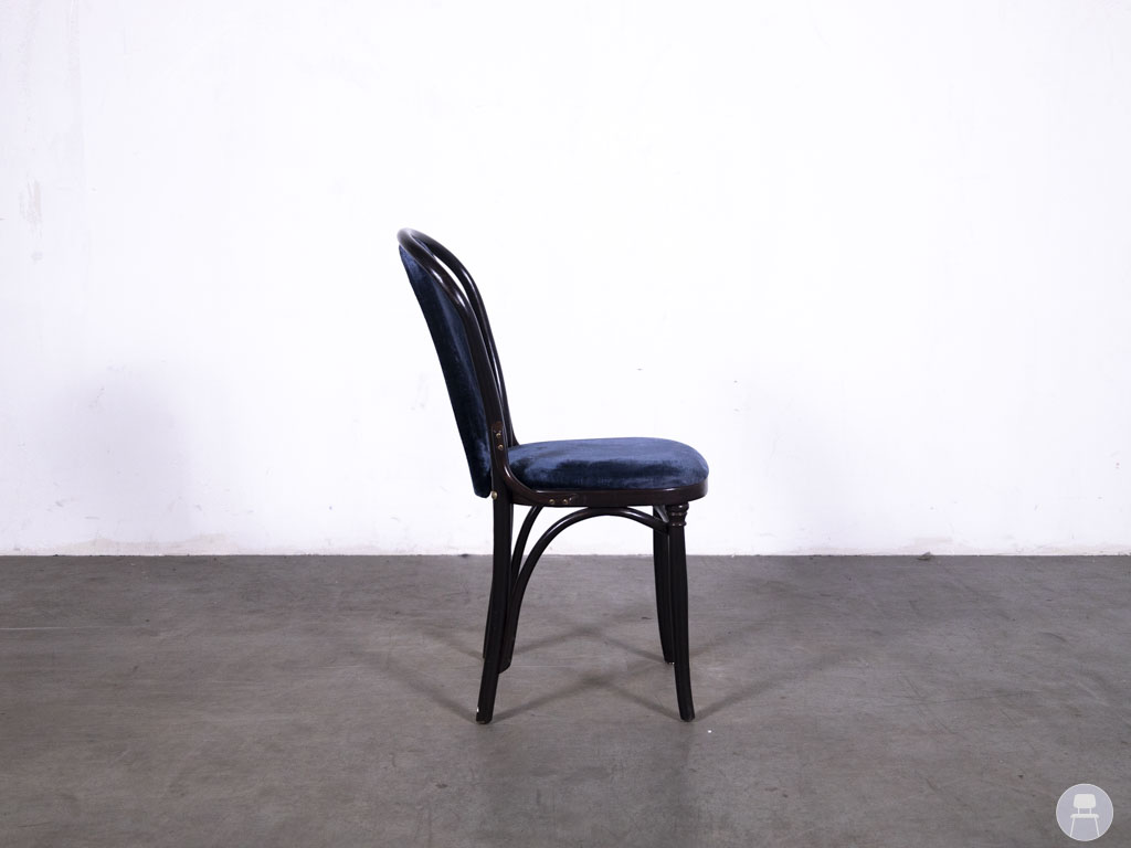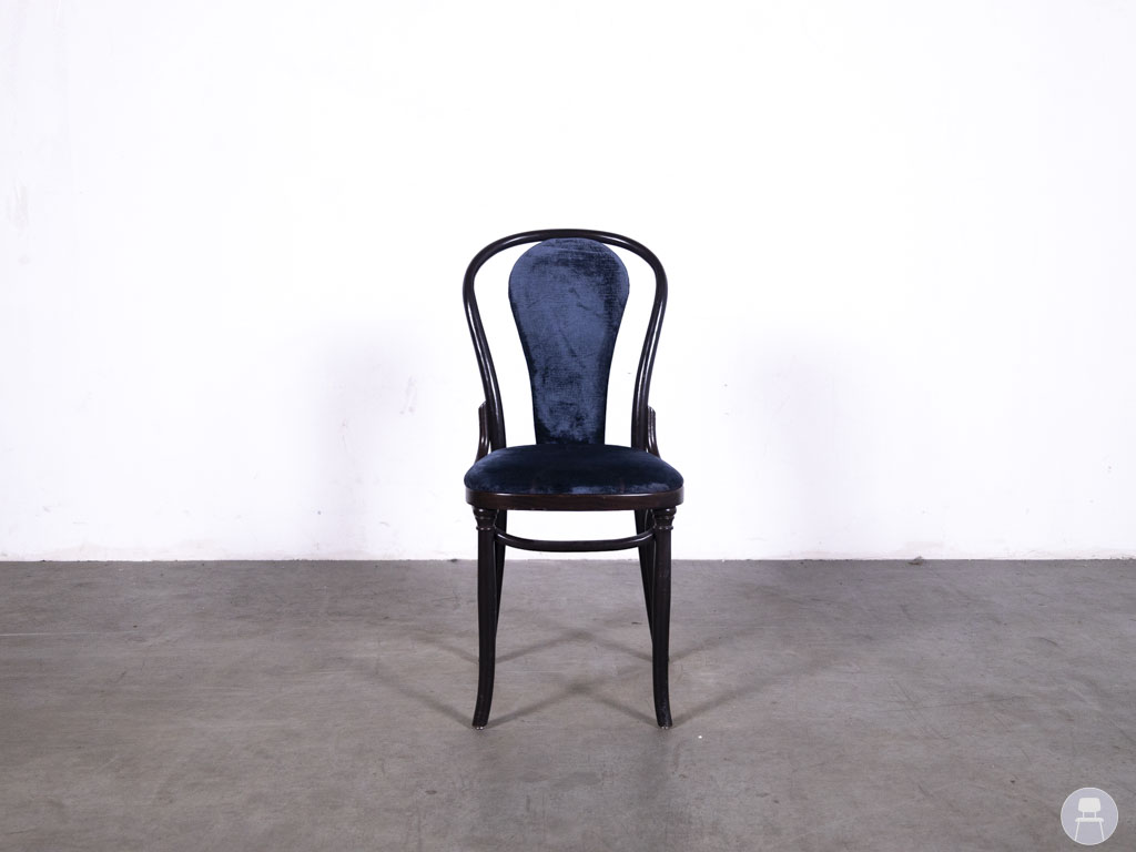Cafestoel Thonet velvet blauw Satelliet combineert klassiek design met een luxe uitstraling. Het donker houten frame is uitgevoerd in een herkenbare Thonet-stijl met gebogen lijnen die zorgen voor een sierlijk en tijdloos silhouet.