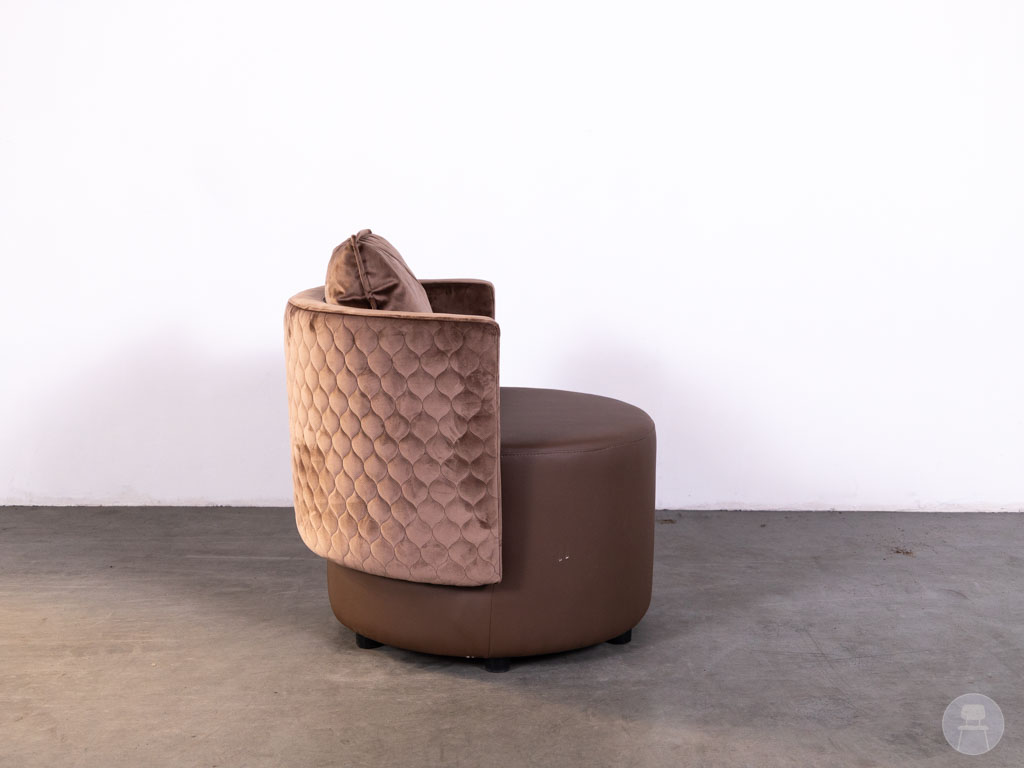 De rug en armleuningen zijn afgewerkt met een zachte stof en voorzien van een decoratief patroon, wat deze fauteuil een unieke en warme uitstraling geeft. Het bijpassende losse kussen verhoogt het zitcomfort en maakt deze stoel zeer geschikt voor lounges, hotels en restaurants.