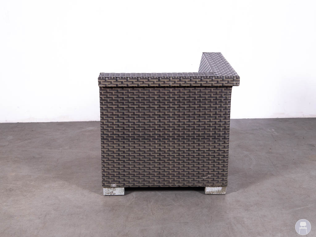 De bank is gemaakt van wicker vlechtwerk, een materiaal dat veel wordt gebruikt in horeca terrasmeubilair vanwege de sterke, weerbestendige eigenschappen. Het donkerbruine wicker geeft de loungebank een warme en luxe uitstraling die goed past bij zowel een modern terras, strandpaviljoen als een hotel lounge.