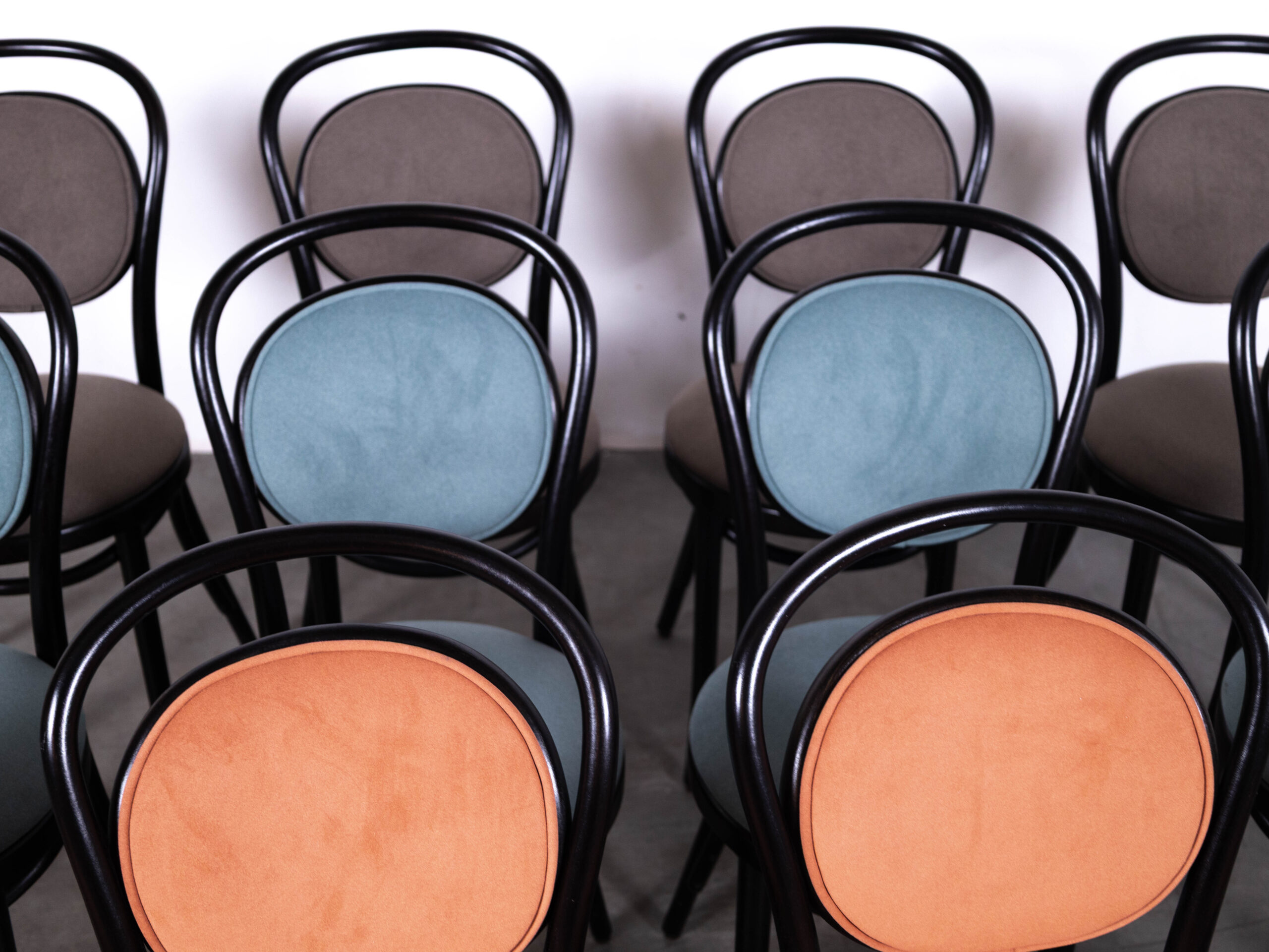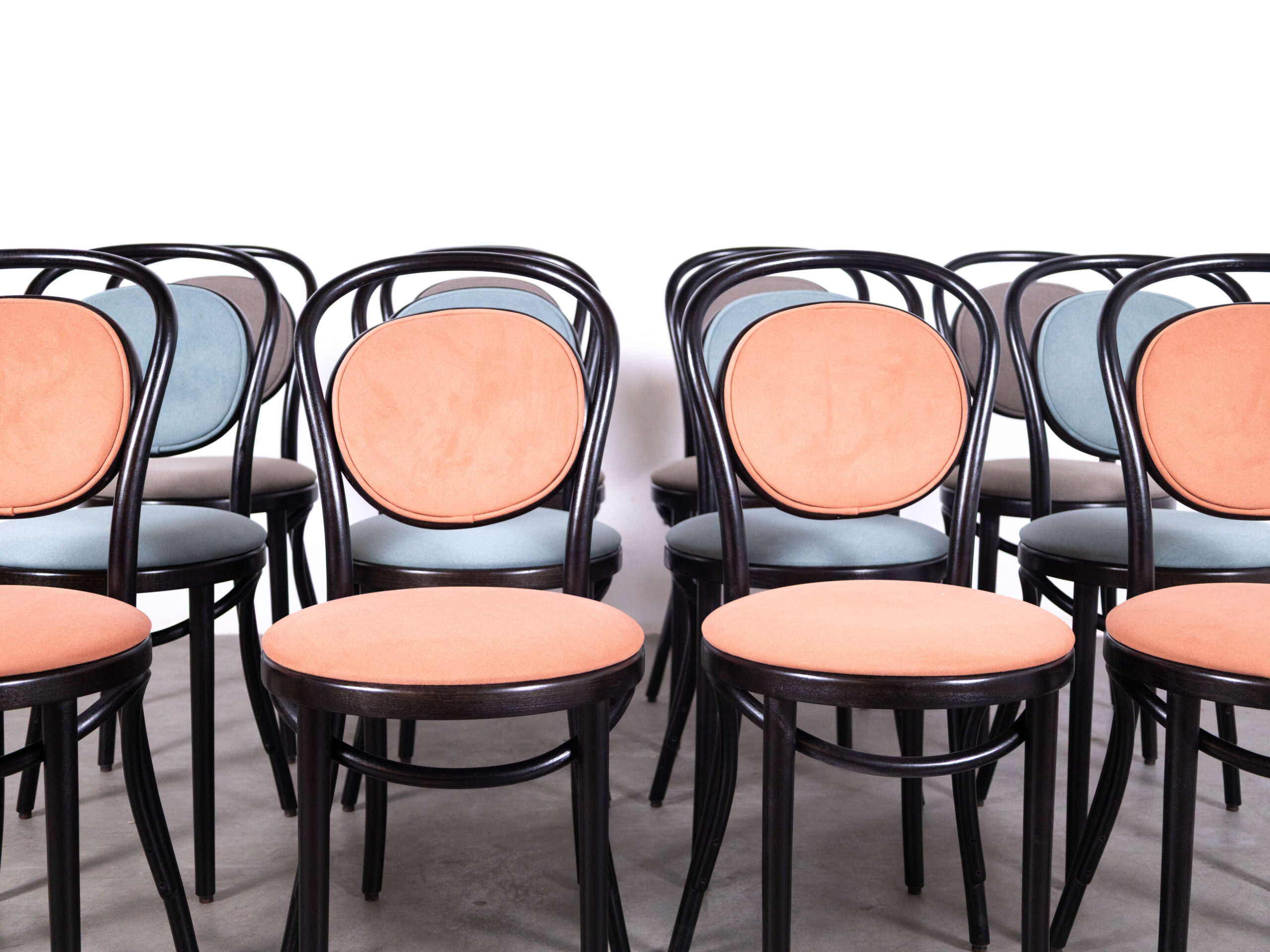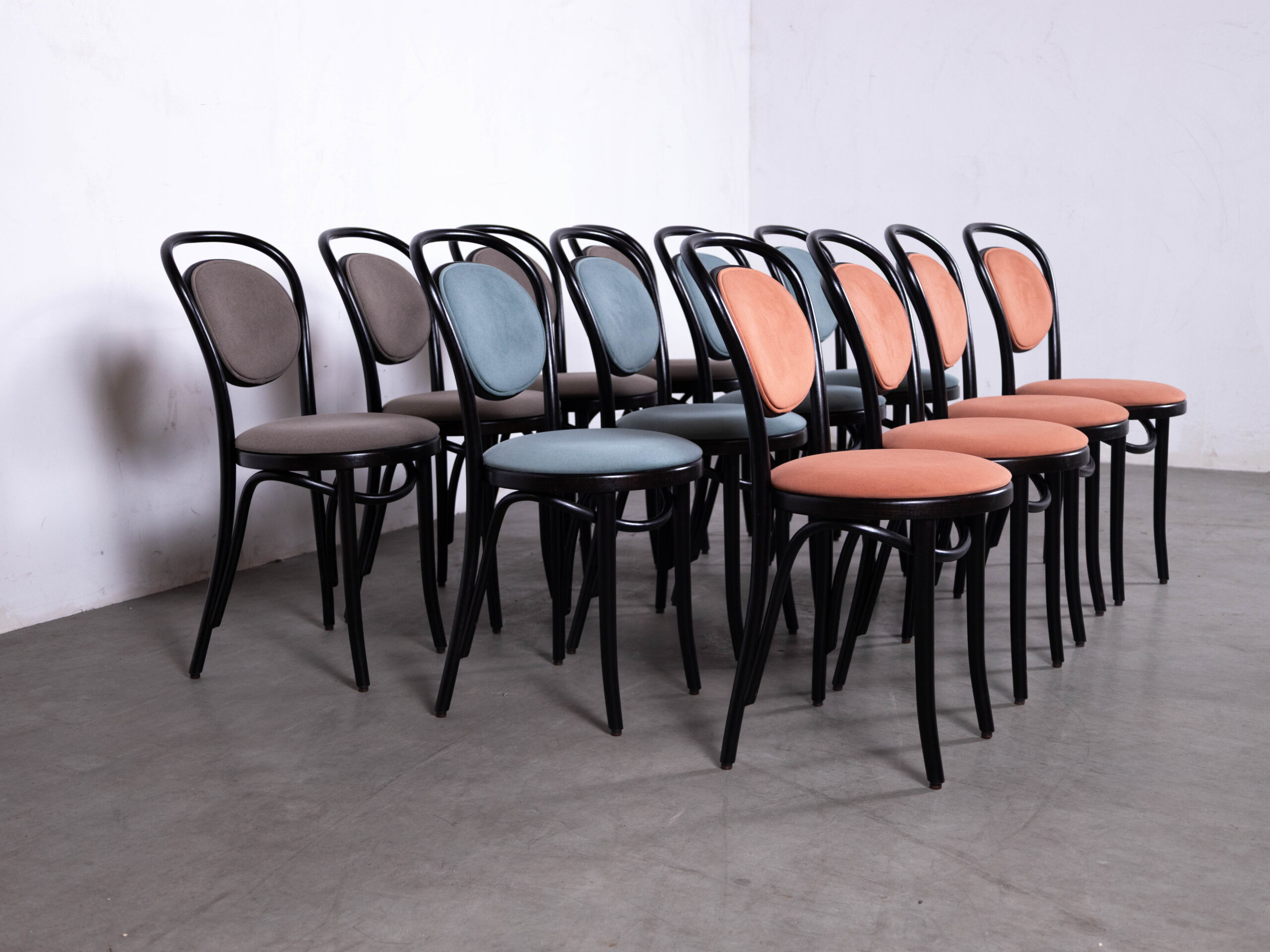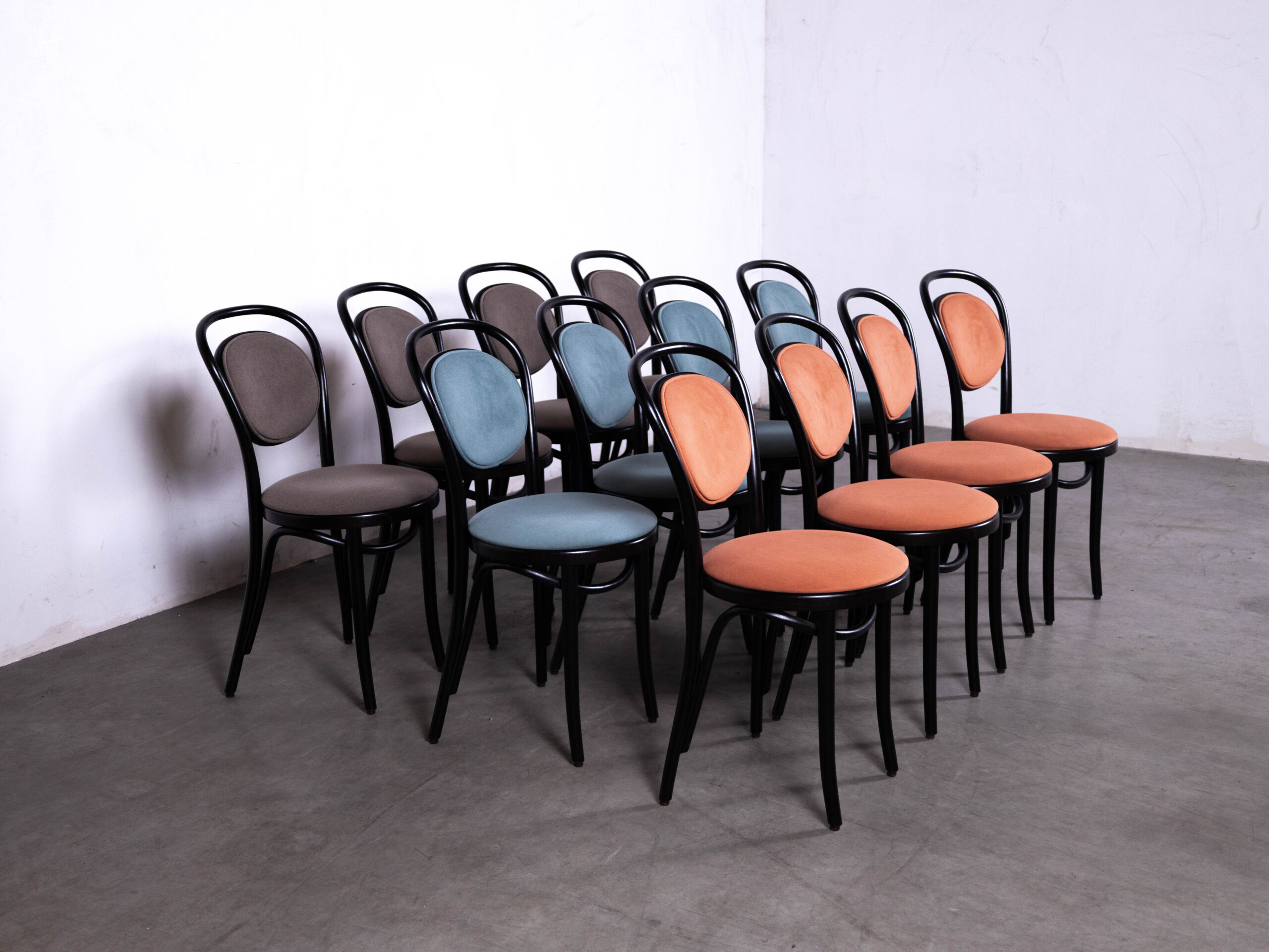 uitstraling. De stoelen zijn uitgevoerd in het herkenbare Thonet model met een elegant gebogen houten frame in zwarte afwerking. De ronde rugleuningen en comfortabele zittingen zijn gestoffeerd in een stijlvolle mix van kleuren, waaronder warm oranje, zacht blauw en taupe, wat zorgt voor een dynamisch en eigentijds horeca interieur. Dankzij de stevige houten constructie zijn deze horecastoelen geschikt voor intensief gebruik in de horeca, zoals restaurants, cafés en hotels. De gestoffeerde zitting en rugleuning bieden extra zitcomfort, waardoor gasten langer comfortabel blijven zitten. Deze mix set horecastoelen is ideaal voor ondernemers die direct een complete en karaktervolle inrichting willen realiseren zonder losse aantallen te combineren. Het tijdloze ontwerp in combinatie met de kleurvariatie maakt deze Satelliet stoelen perfect inzetbaar binnen zowel klassieke als moderne projectinrichting. Een complete partij van 12 stuks die sfeer, comfort en functionaliteit samenbrengt in één stijlvolle oplossing.