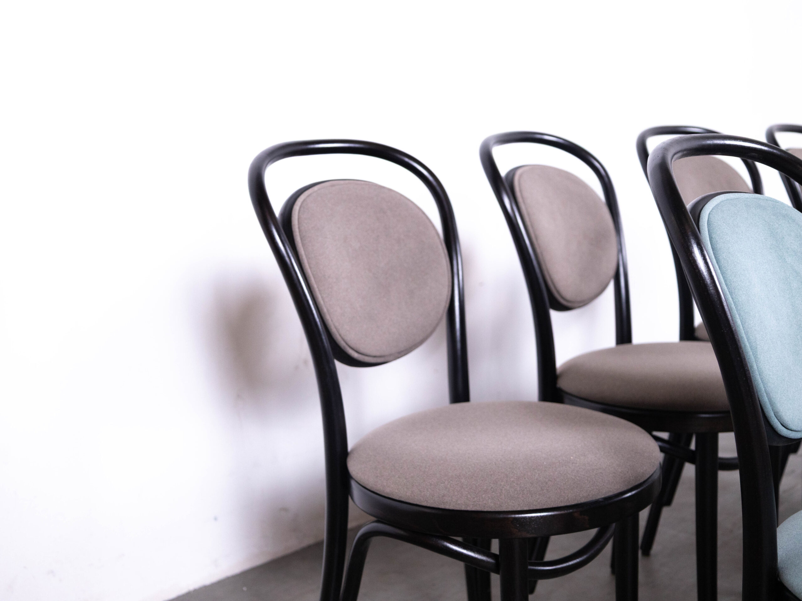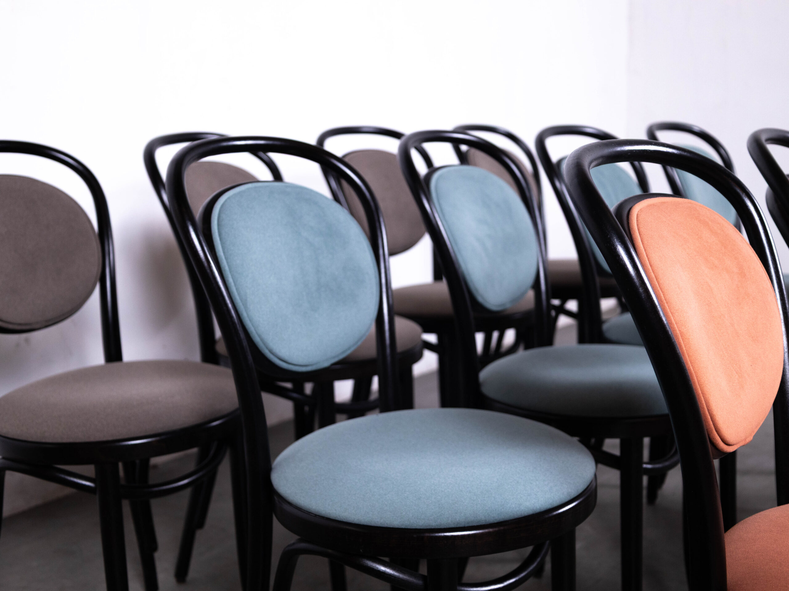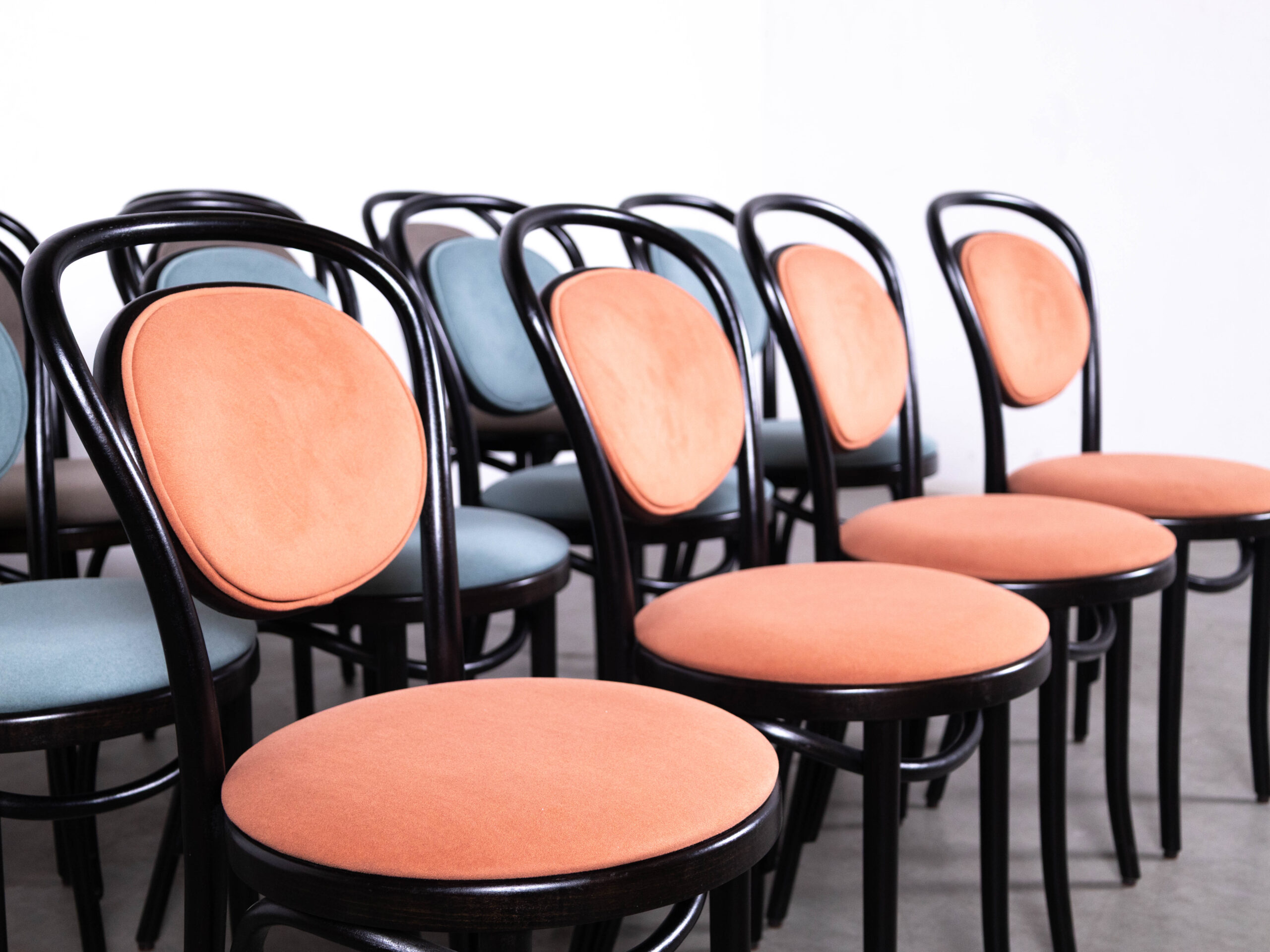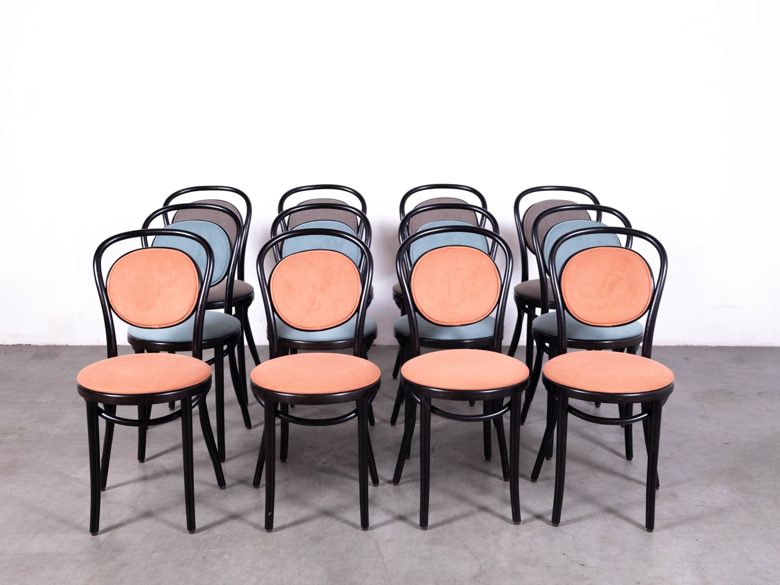 uitstraling. De stoelen zijn uitgevoerd in het herkenbare Thonet model met een elegant gebogen houten frame in zwarte afwerking. De ronde rugleuningen en comfortabele zittingen zijn gestoffeerd in een stijlvolle mix van kleuren, waaronder warm oranje, zacht blauw en taupe, wat zorgt voor een dynamisch en eigentijds horeca interieur. Dankzij de stevige houten constructie zijn deze horecastoelen geschikt voor intensief gebruik in de horeca, zoals restaurants, cafés en hotels. De gestoffeerde zitting en rugleuning bieden extra zitcomfort, waardoor gasten langer comfortabel blijven zitten. Deze mix set horecastoelen is ideaal voor ondernemers die direct een complete en karaktervolle inrichting willen realiseren zonder losse aantallen te combineren. Het tijdloze ontwerp in combinatie met de kleurvariatie maakt deze Satelliet stoelen perfect inzetbaar binnen zowel klassieke als moderne projectinrichting. Een complete partij van 12 stuks die sfeer, comfort en functionaliteit samenbrengt in één stijlvolle oplossing.