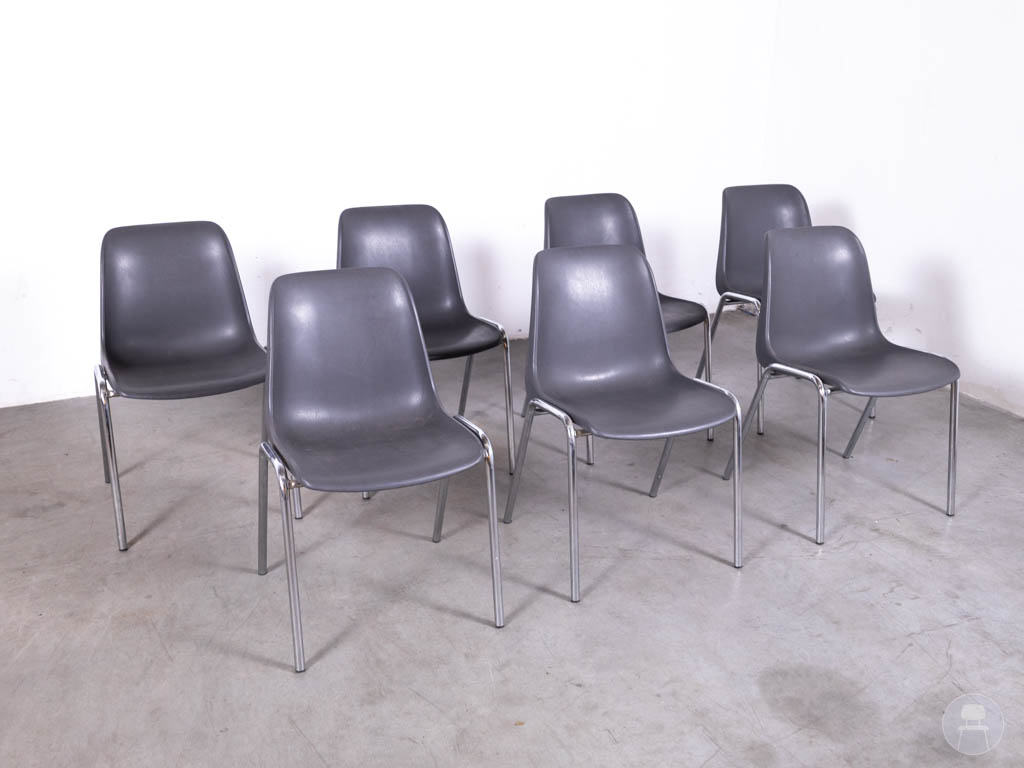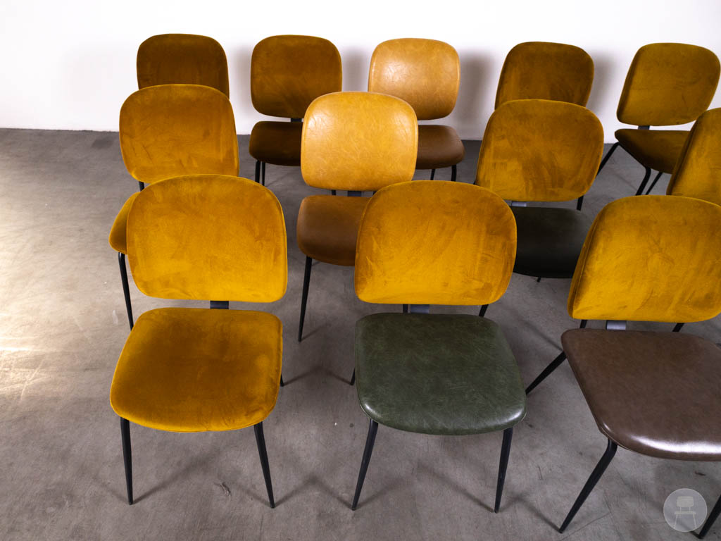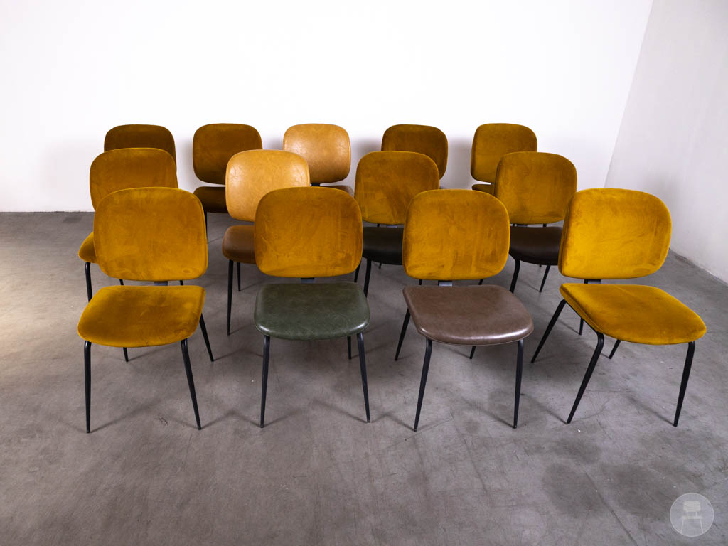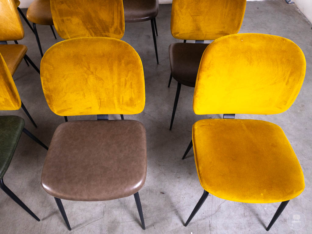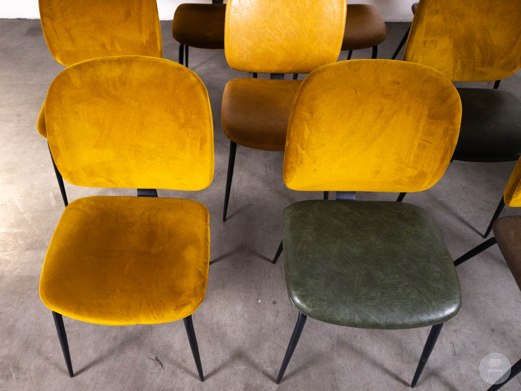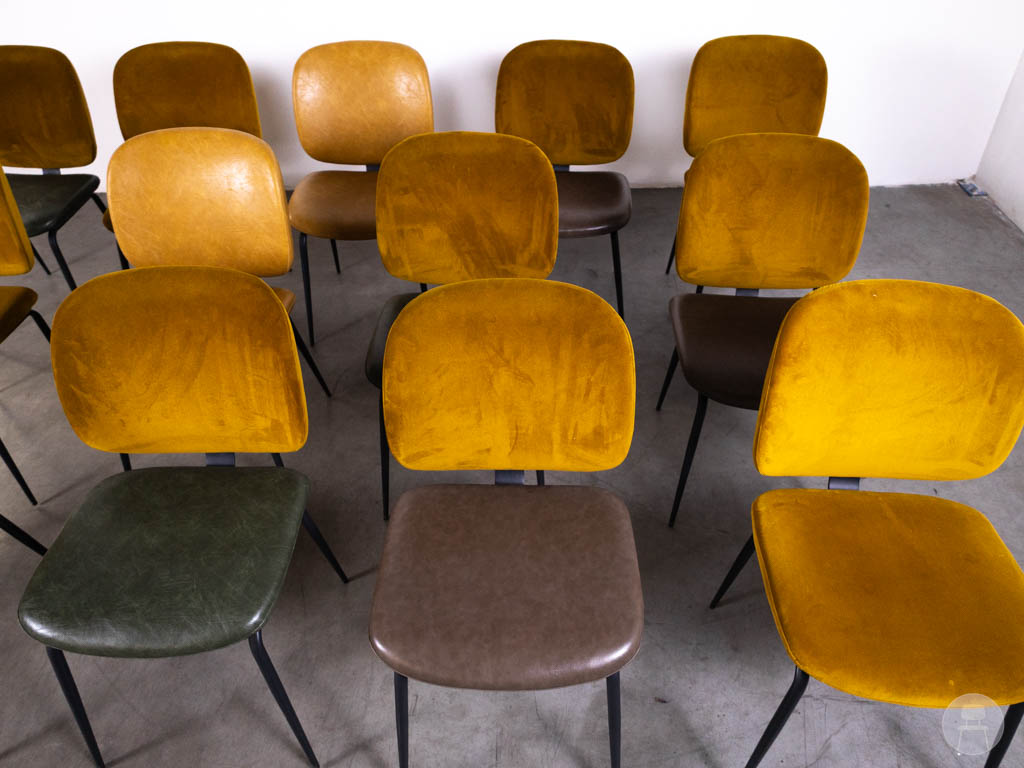De stoelen zijn uitgevoerd in een mix van kleuren, met voornamelijk warme gele tinten aangevuld met andere nuances zoals groen en bruin. Dit zorgt voor een dynamisch en levendig geheel. De bekleding varieert tussen velvet en leerlook, wat elke stoel een eigen karakter geeft. Het zwarte metalen frame zorgt voor een strakke basis en maakt de stoelen geschikt voor intensief gebruik.