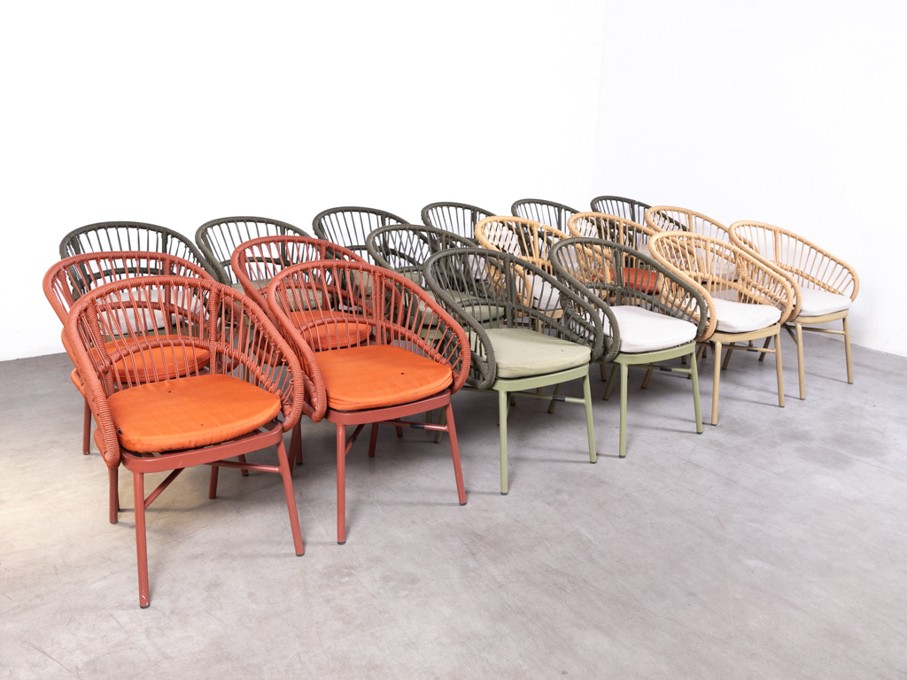 1 set 13 stuks Horecastoel Saar geel mix Satelliet is een unieke en speelse set horecastoelen die perfect past binnen een creatieve en eigentijdse horeca inrichting. Deze set van 13 stoelen biedt volop mogelijkheden voor restaurants, cafés en conceptstores die willen opvallen.