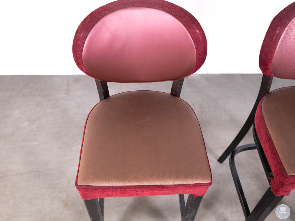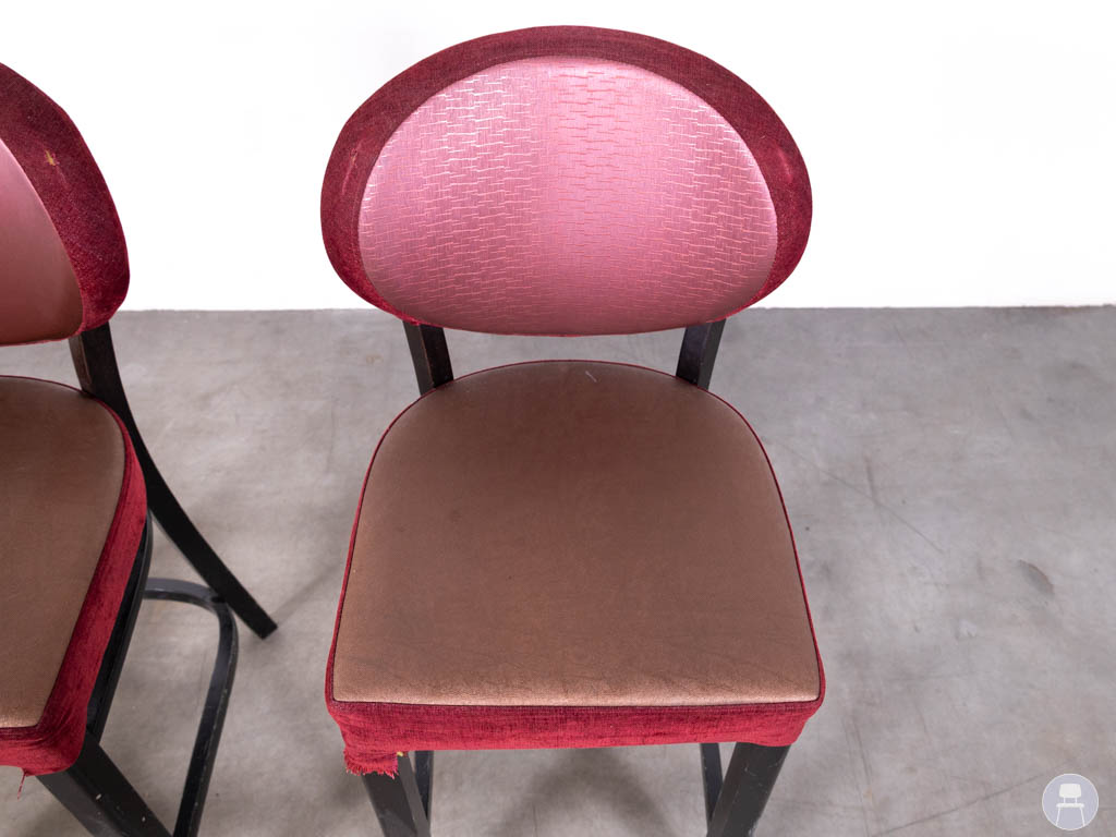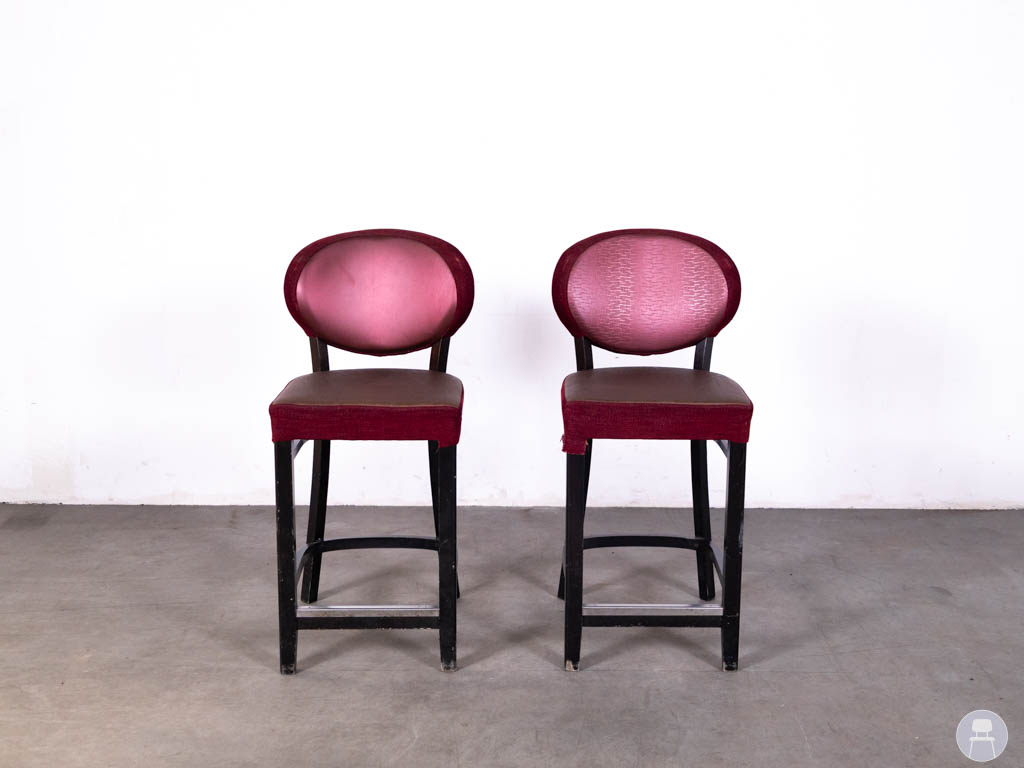 De krukken zijn uitgevoerd met een donker houten frame en een gestoffeerde zitting en rugleuning in warme rood- en bruintinten. De ronde rugleuning geeft de krukken een klassieke en uitnodigende uitstraling, terwijl de combinatie van kleuren zorgt voor een sfeervol en luxe geheel.